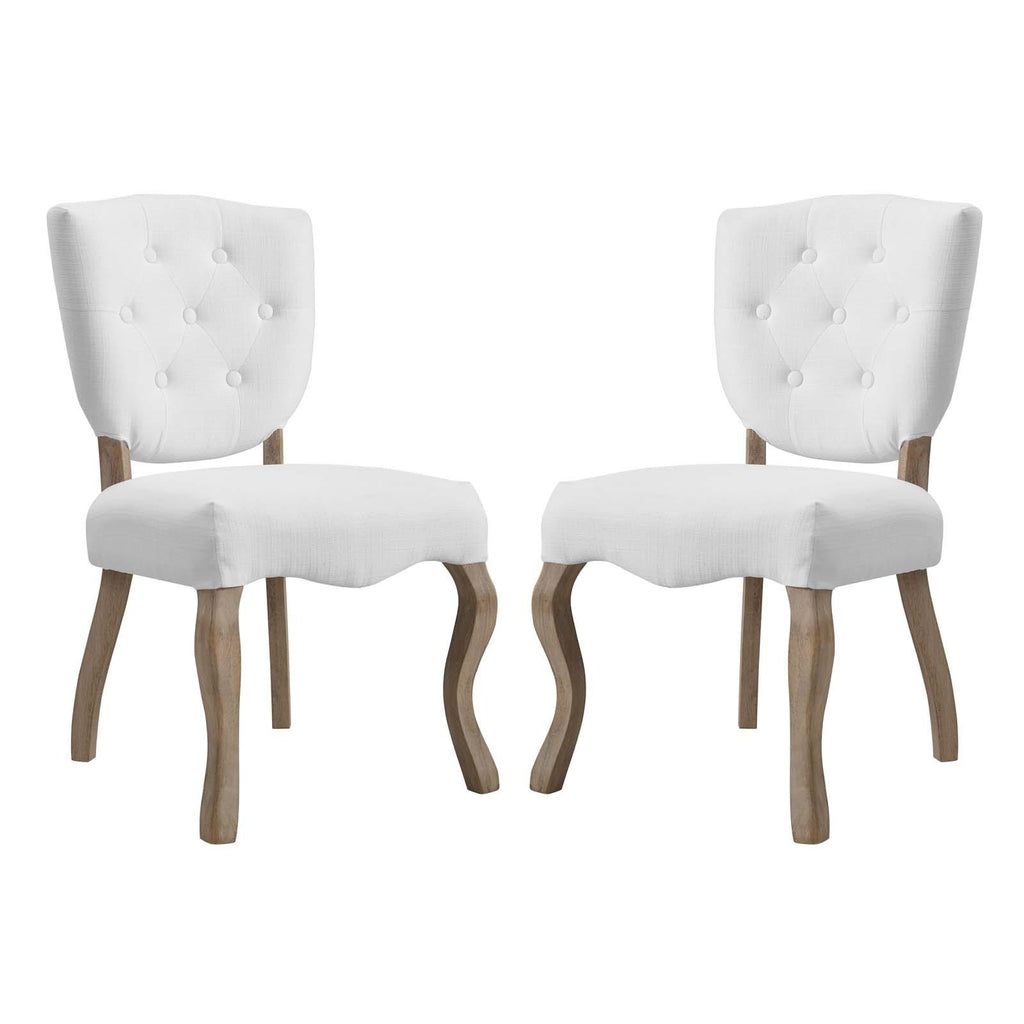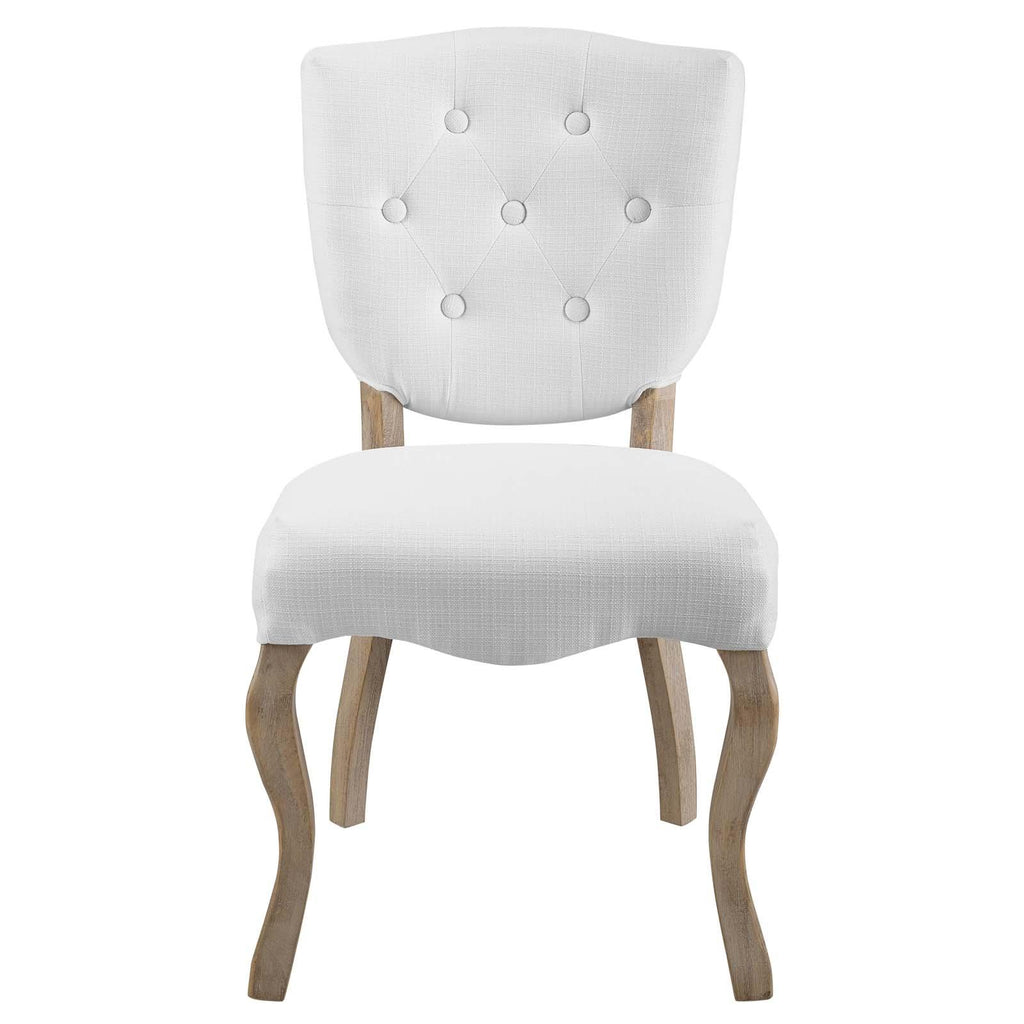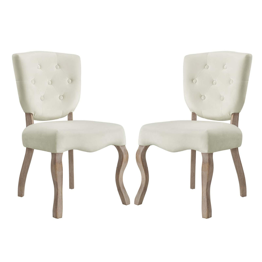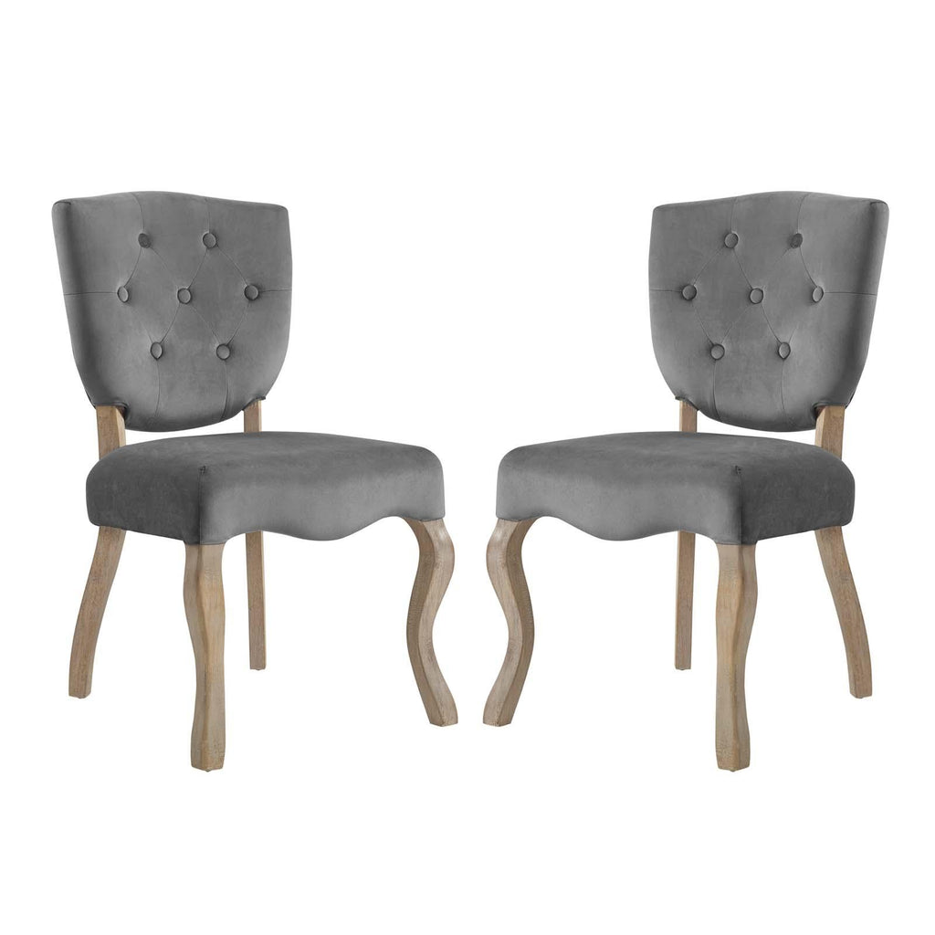 Usher forth a harmonious dining environment with the Array Vintage French Dining Side Chair. Four saber-shaped weathered wood legs develop a sculptured silhouette, while the shield back with button tufting displays hints of opulence. Complete with a generously padded seat, and velvet polyester upholstery, Array comes with non-marking foot caps to preserve floor integrity, supports up to 331 pounds, and does not require assembly. Set Includes: Two - Array Dining Side Chair Vintage French Dining Side Chair Button Tufted Seat Back Velvet Polyester Upholstery Weathered Wood Saber Legs Non-Marking Foot Caps Dense Foam Padding Chair Weight Capacity: 331 lbs Overall Product Dimensions: 20"L x 24.5"W x 36"H Overall Side Chair Dimensions: 20"L x 24.5"W x 36"H Seat Dimensions: 18"L x 20"W x 20"H Backrest Dimensions: 19"W x 15.5"H Base Dimensions: 21.5"L x 20"W
