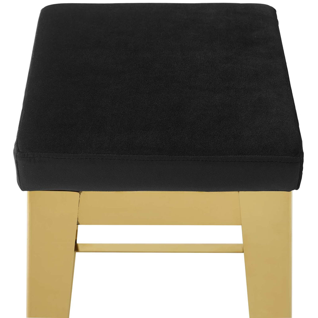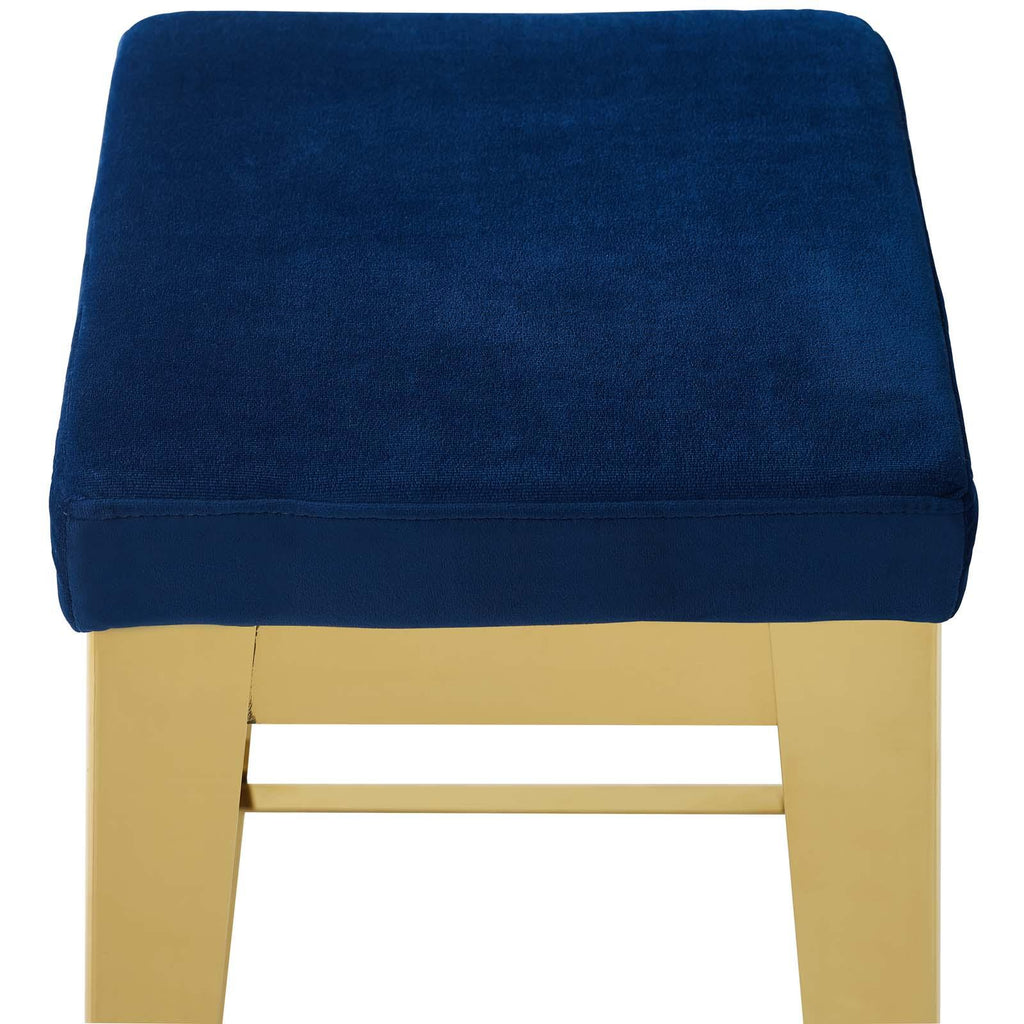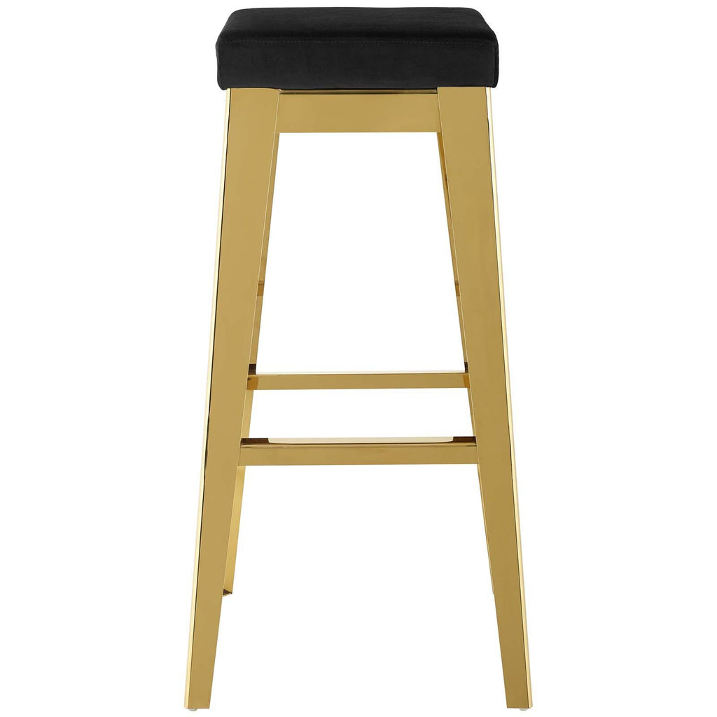 Make a striking statement with the Arrive Bar Stool. A durable backless bar stool, Arrive features a polished gold stainless steel frame made prominent by tapered linear legs, handy footrests, and non-marking foot caps. A luxurious addition to the dining pub or bar table, Arrive is upholstered in stain-resistant velvet polyester and padded with dense foam creating a comfortable seat for everyday use. Redefine your dining space with this contemporary bar stool. Bar Stool Weight Capacity: 220 lbs.