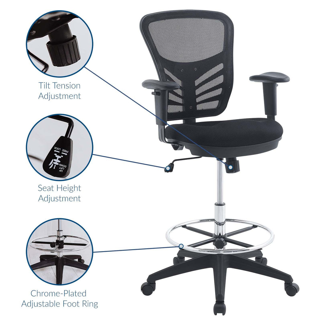 Mark a turning point in your office tasks with the Articulate Drafting Stool in Mesh. Articulate makes it easy to relax into work with breathable mesh back and comfortable fabric cushion seat that serves as a simple extension to your everyday work ventures. This drafting stool installment of the Articulate series features height adjustable armrests, tilt tension control, an extra tall gas cylinder, and a sturdy chrome-plated steel foot ring to enhance posture. Fitted with five hooded dual-wheel casters, give yourself the ability to easily glide over carpeted floors while naturally performing tasks. Set Includes: One - Articulate Drafting Stool Modern Drafting Stool Tall Drafting Chair Mesh Covered Sponge Seat Standing Desk Chair Tall Pneumatic Gas Cylinder Chrome Plated Steel Footring Assembly Required Overall Product Dimensions: 27.5"L x 27.5"W x 42 - 50"H Seat Dimensions: 17.5"L x 19.5"W x 24 - 31.5"H Cushion Thickness: 4"H Armrest Height: 30.5 - 33.5/38 - 41"H Backrest Dimensions: 18"H