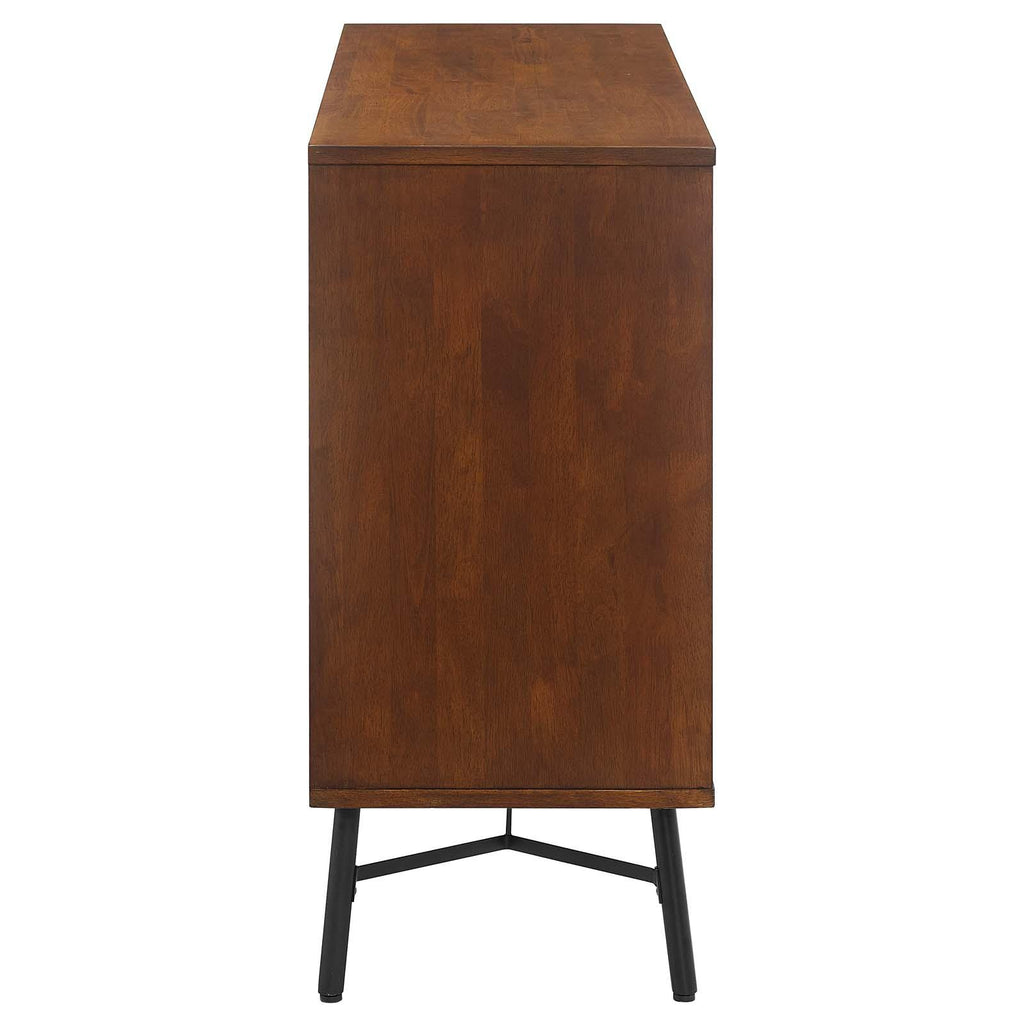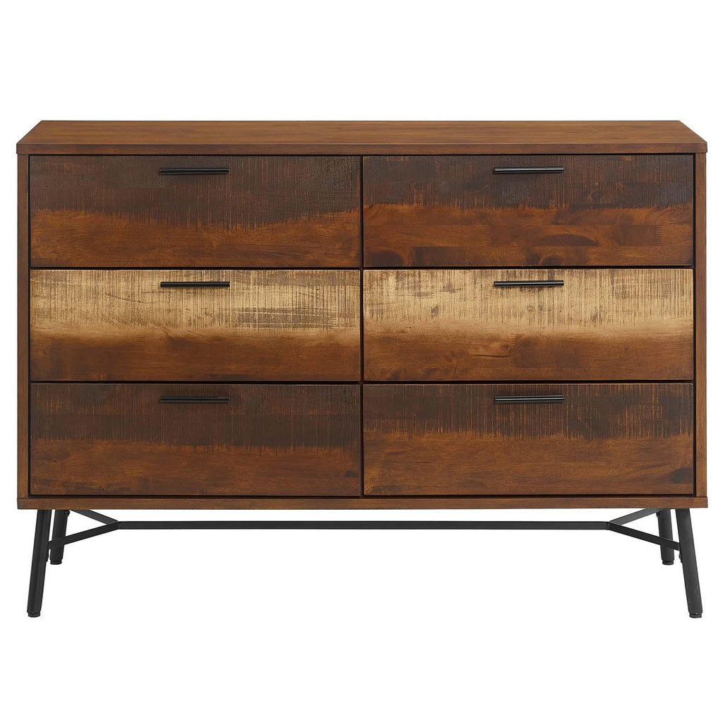 Complement your bedroom decor with the inspired, organic design of Arwen. This wood dresser features an easy wipe clean walnut veneer with an intricately striped walnut and natural wood grain veneer pattern on the six large easy-glide drawers, black lacquered metal, and non-marking foot caps. Perfect for farmhouse, rustic, industrial, mid-century, tropical and contemporary modern bedrooms, Arwen is a quality bed dresser that provides ample space for all your bedroom storage needs.
