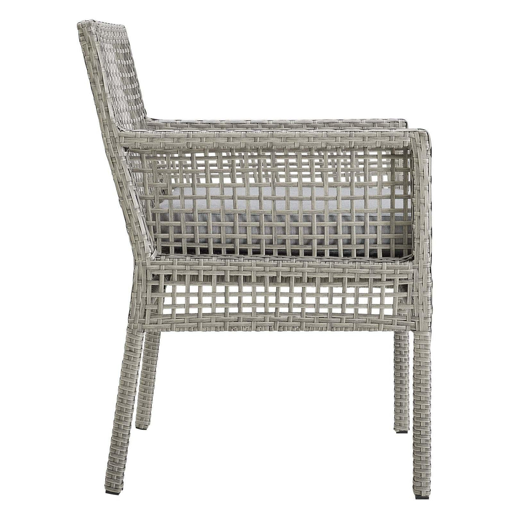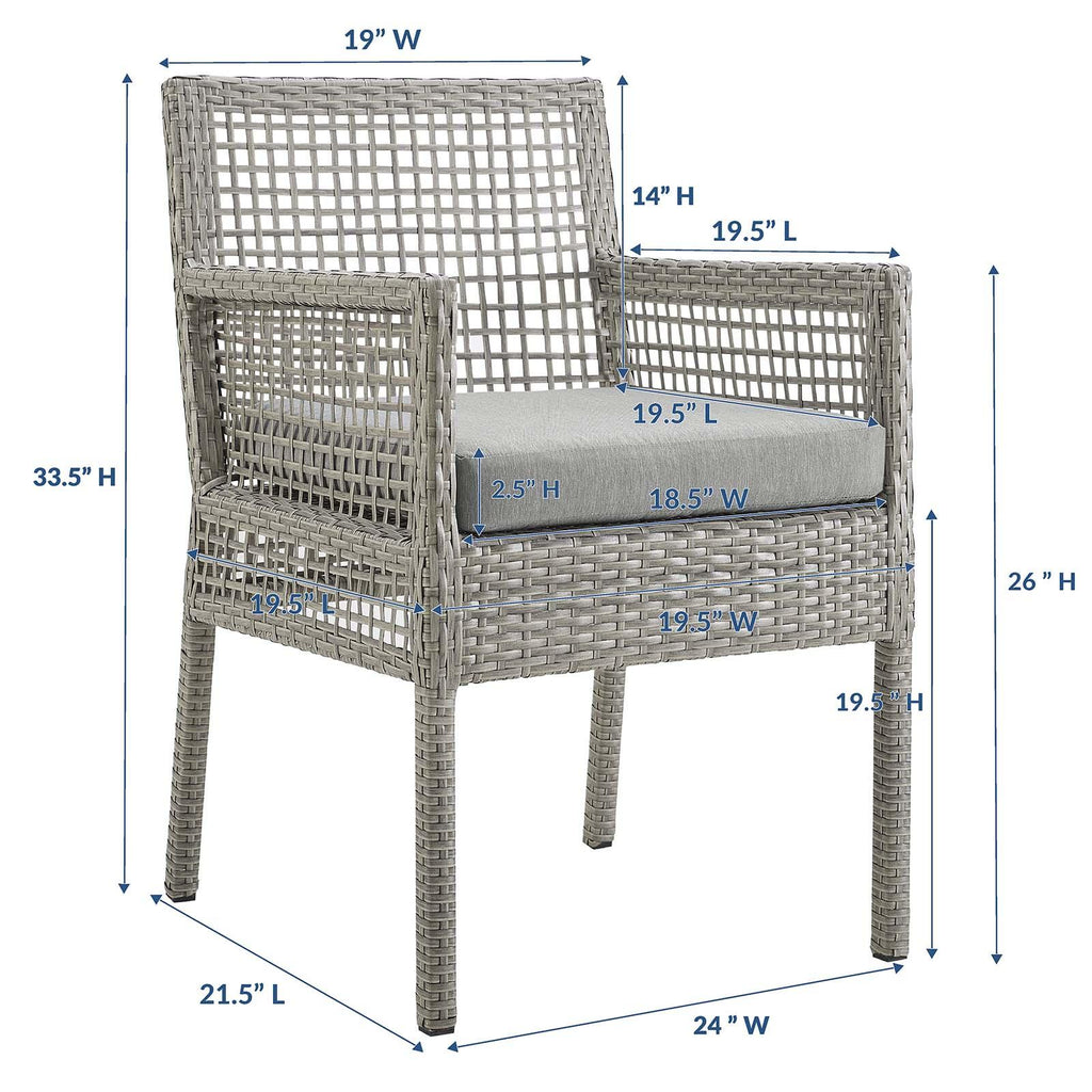 Weave conversational threads into a rollicking good time with Aura Outdoor Patio Dining Arm Chair. Aura is an outdoor dining chair that comes with a synthetic gray-on-gray tone wicker rattan weave and a powder-coated aluminum frame that delivers a softly versatile outdoor collection that shifts to meet the needs of the moment. Outfitted with a machine washable and fade resistant all-weather fabric cushion, Aura Patio Dining Chair will make your outdoor spot the focal point of good memories and festive gatherings while enhancing your patio, backyard or poolside arena. Complete with non-marking foot caps, enjoy spacious seating and enhanced comfort with this reliable piece of outdoor furniture.