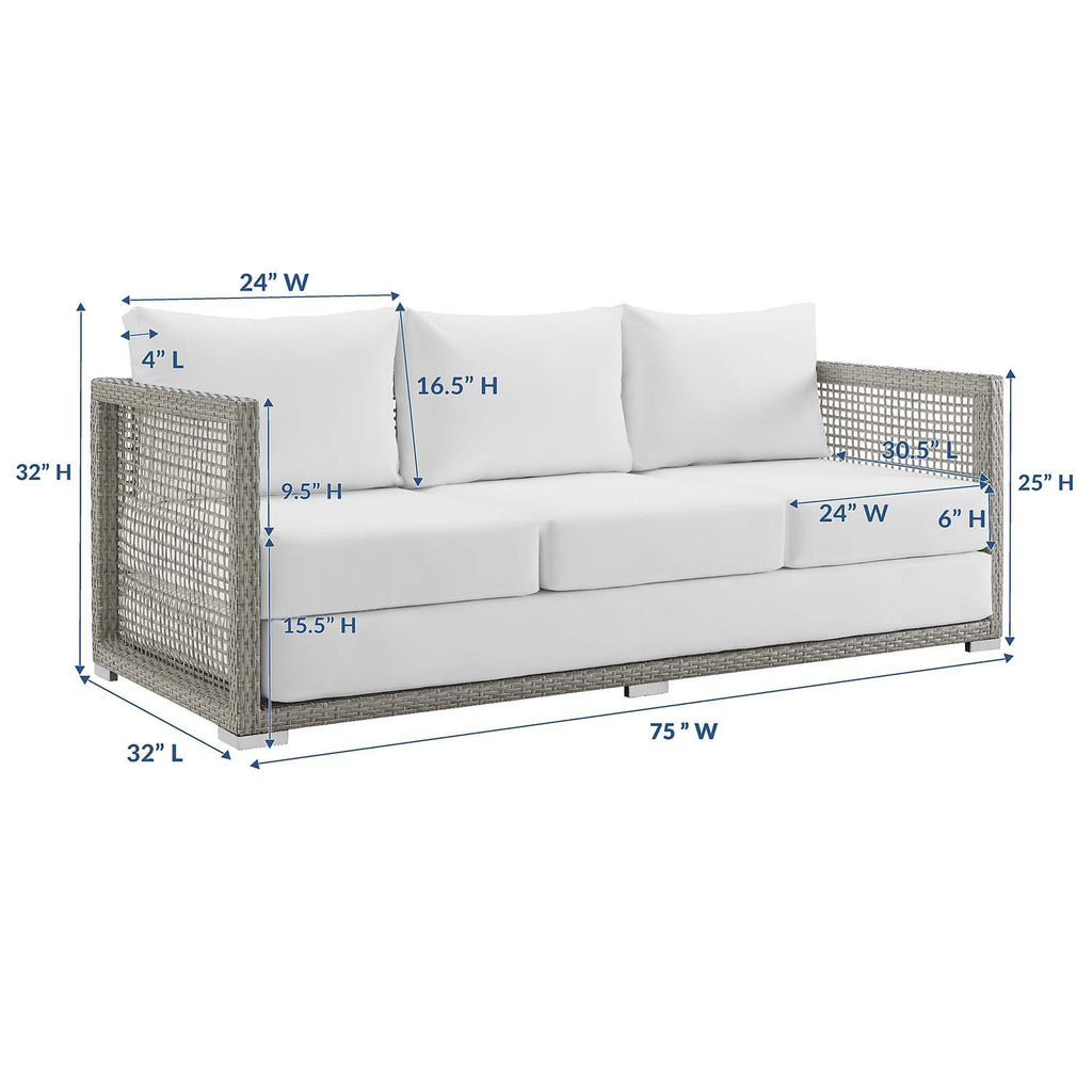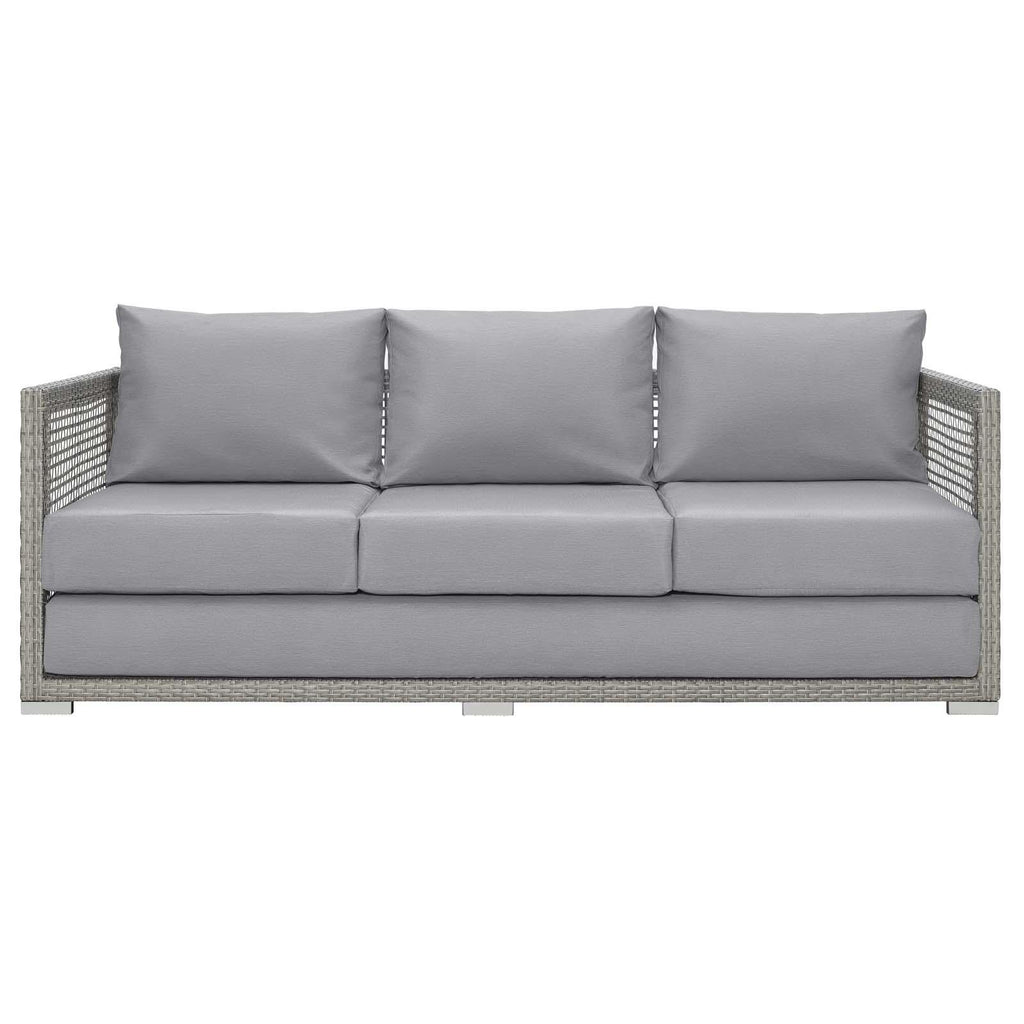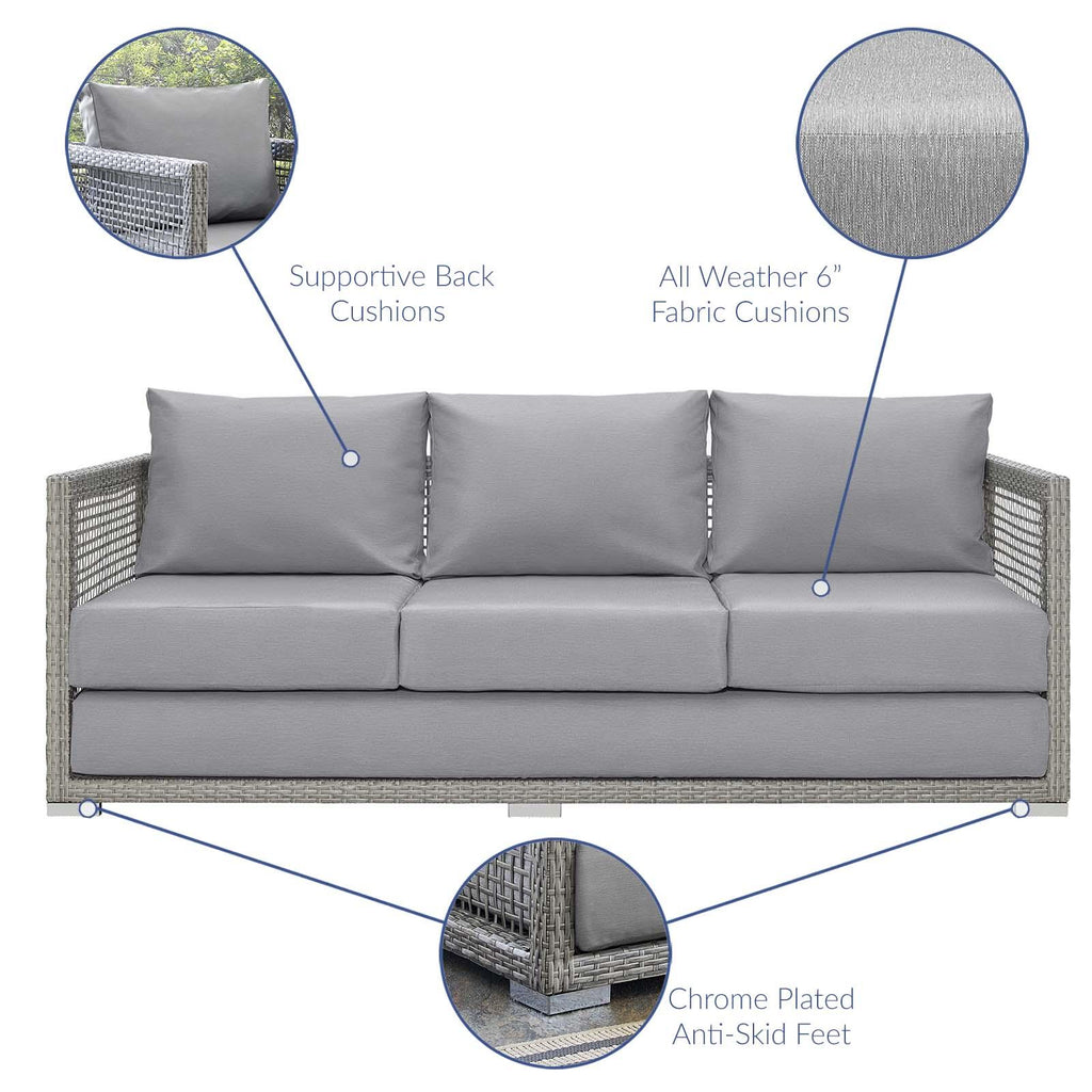 Weave conversational threads into a rollicking good time with Aura Outdoor Patio Sofa. Aura is a patio sofa that comes with a synthetic gray-on-gray tone wicker rattan weave and a powder-coated aluminum frame that delivers a softly versatile outdoor collection that shifts to meet the needs of the moment. Outfitted with machine washable and fade resistant all-weather fabric cushions, and designed with an extra wide and deep body, Aura Outdoor Couch will make your outdoor spot the focal point of good memories and festive gatherings while enhancing your patio, backyard or poolside arena. Featuring thick cushions and non-marking foot caps, enjoy spacious seating and enhanced comfort with this reliable piece of outdoor furniture. Comes fully assembled.