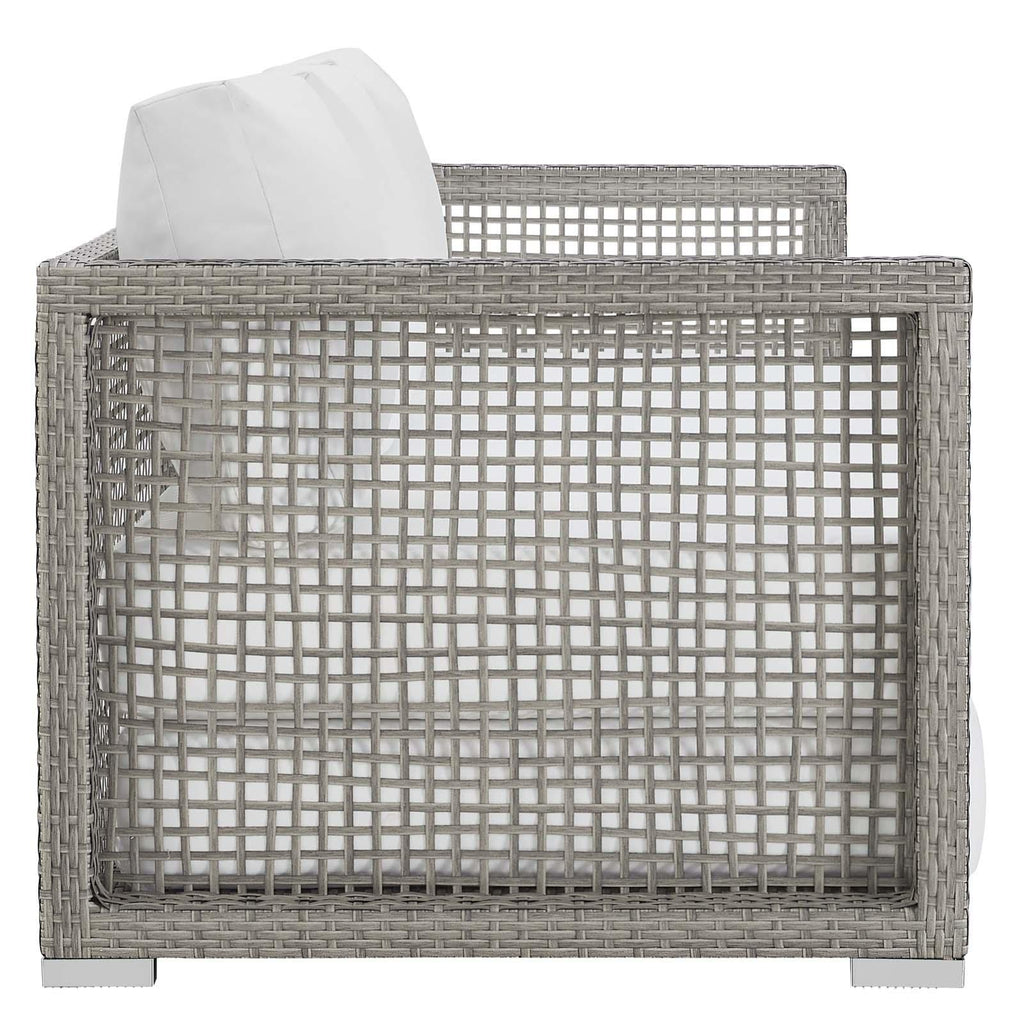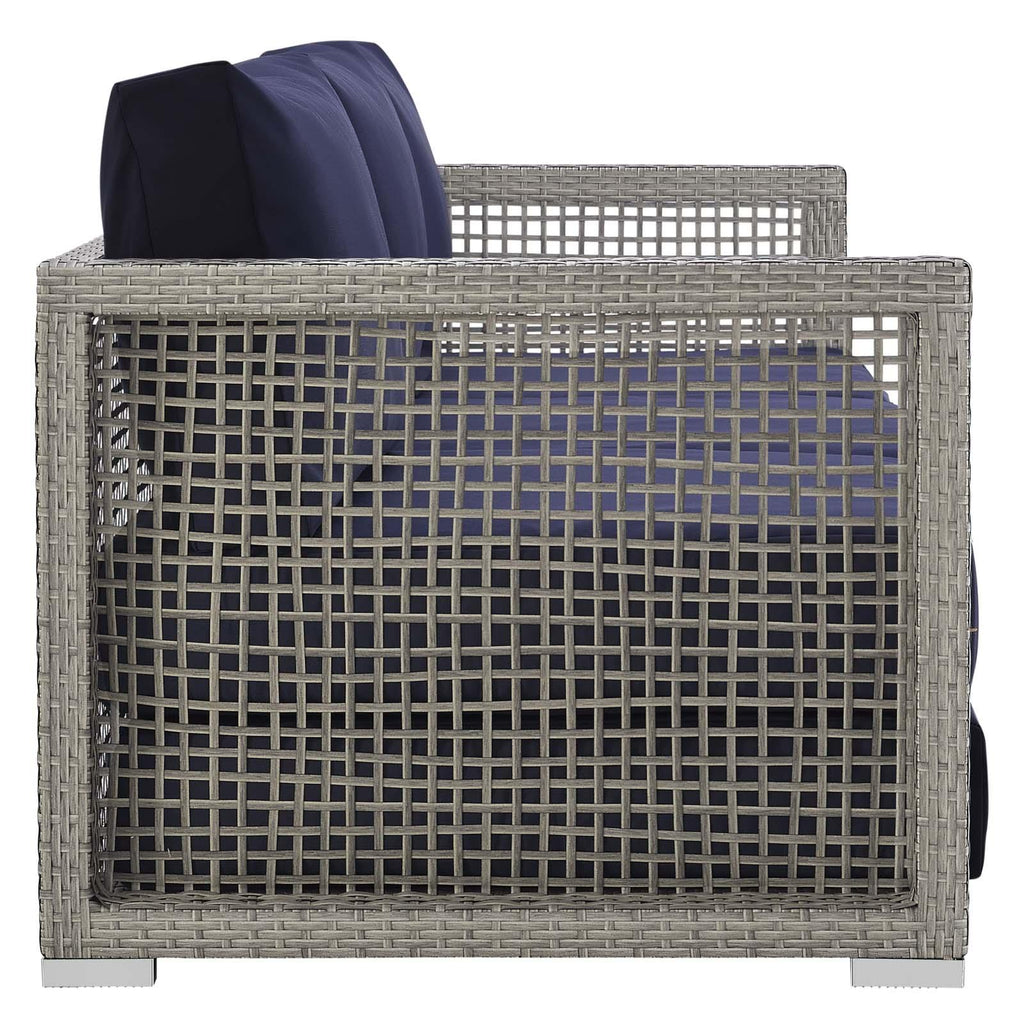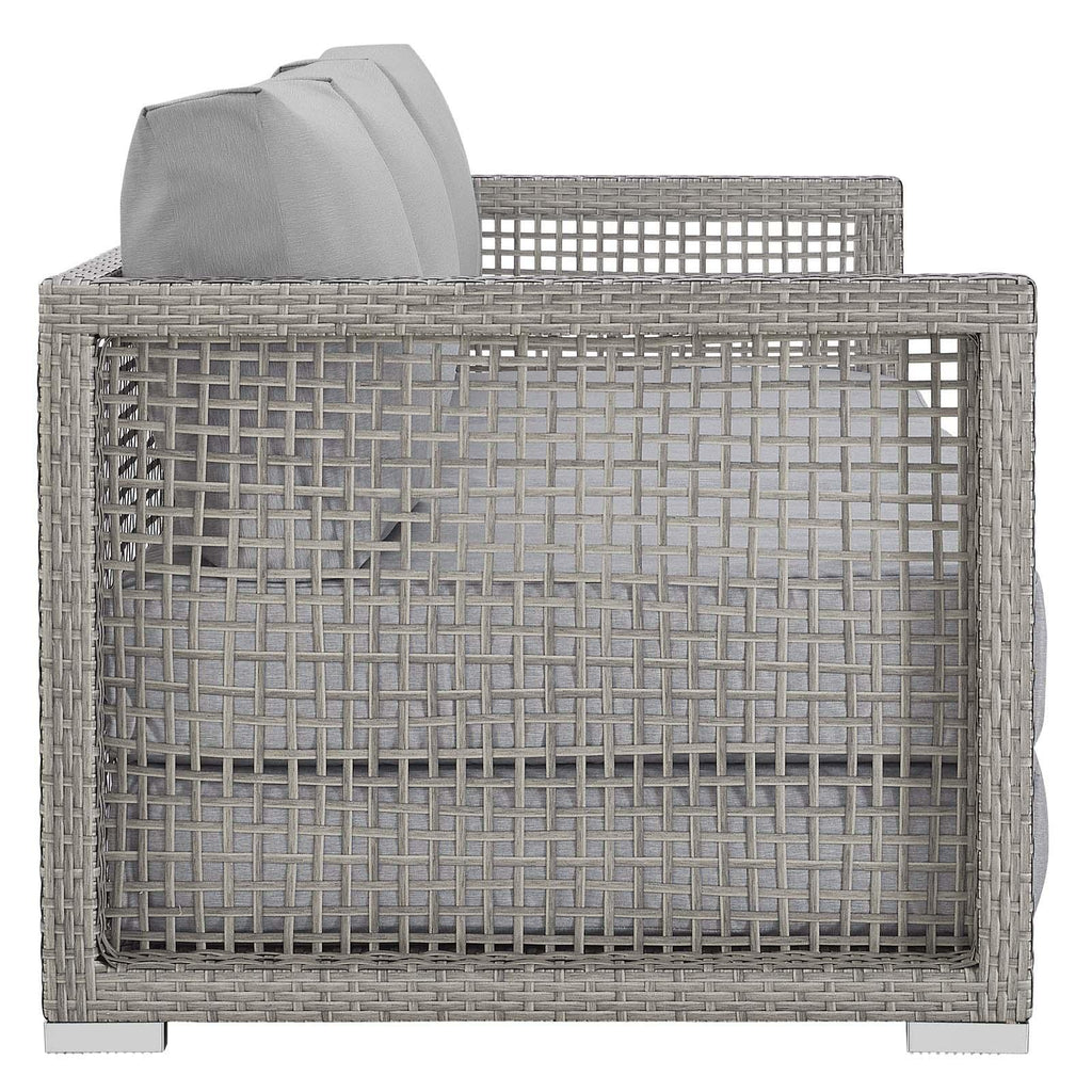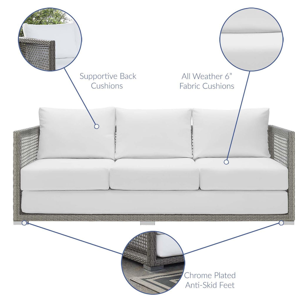 Weave conversational threads into a rollicking good time with Aura Outdoor Patio Sofa. Aura is a patio sofa that comes with a synthetic gray-on-gray tone wicker rattan weave and a powder-coated aluminum frame that delivers a softly versatile outdoor collection that shifts to meet the needs of the moment. Outfitted with machine washable and fade resistant all-weather fabric cushions, and designed with an extra wide and deep body, Aura Outdoor Couch will make your outdoor spot the focal point of good memories and festive gatherings while enhancing your patio, backyard or poolside arena. Featuring thick cushions and non-marking foot caps, enjoy spacious seating and enhanced comfort with this reliable piece of outdoor furniture. Comes fully assembled.