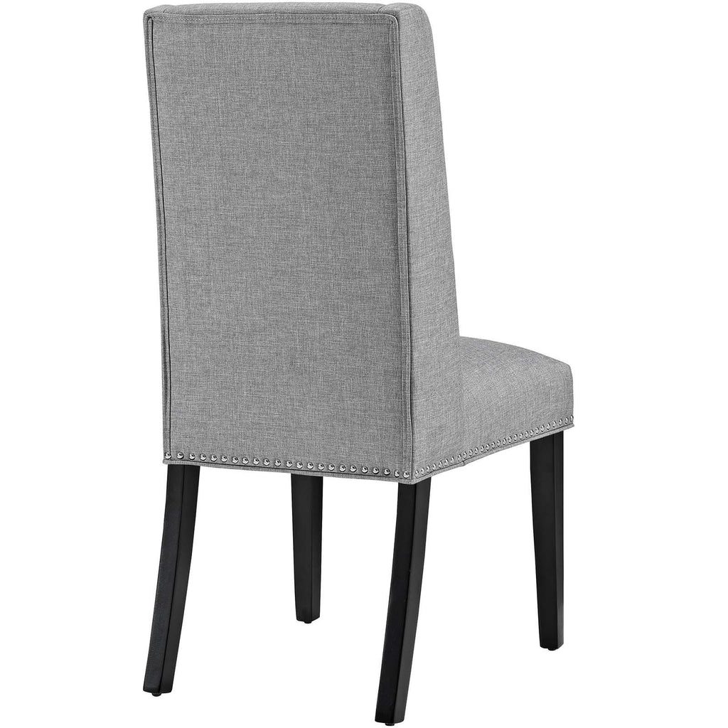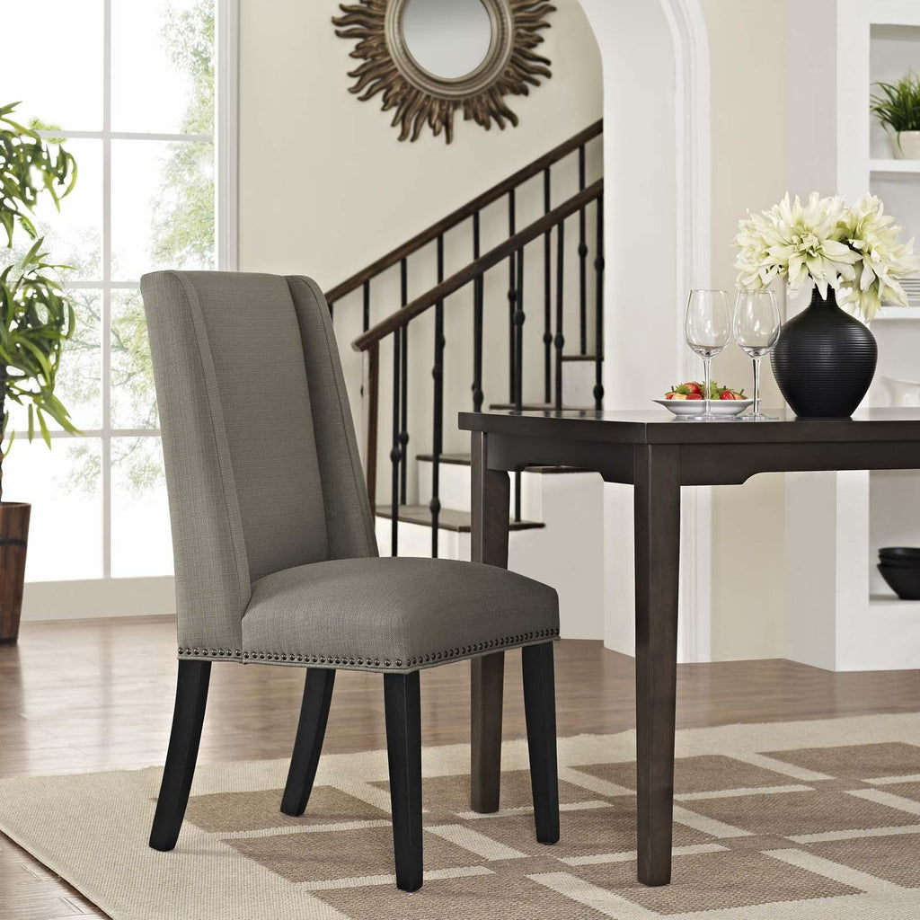 Explore the vast riches of a treasured heritage with the Baron Dining Chair. Designed to resonate elegance, Barons features a charming back and polished nailhead trimmed seat with a dash of grace and noble appeal. Complete with dense foam padding, fine fabric upholstery, solid wood frame and legs with non-marking foot glides, Baron is a stylish dining chair perfect for the modern home.