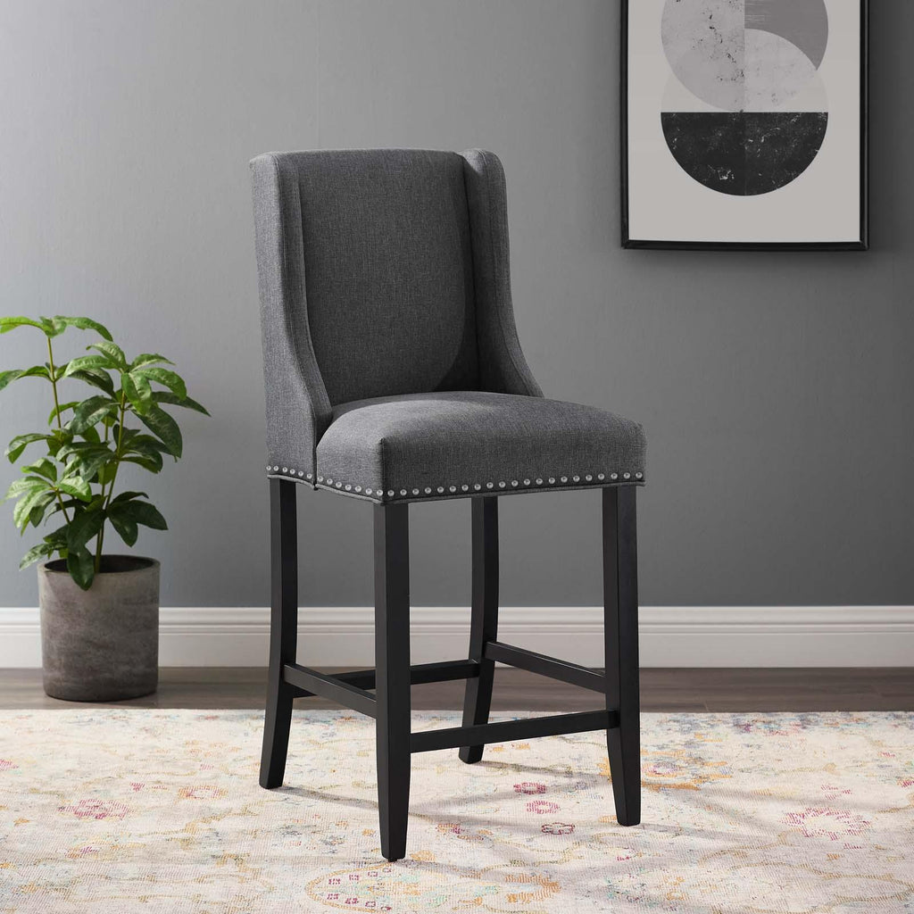 Explore the vast riches of a treasured heritage with the Baron Upholstered Fabric Counter Stool. Baron is an exceptionally made modern counter stool with an elegant back, polished nailhead trim, and footstool support. This kitchen counter stool features dense foam padding with a sinuous spring support system for added comfort and support. Boasting a solid wood frame with tapered legs and non-marking foot caps, Baron is a stylish upholstered fabric counter stool perfect for the apartment or home. Counter Stool Weight Capacity: 500 lbs.