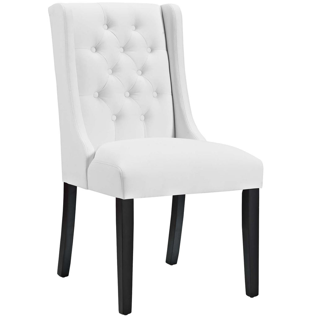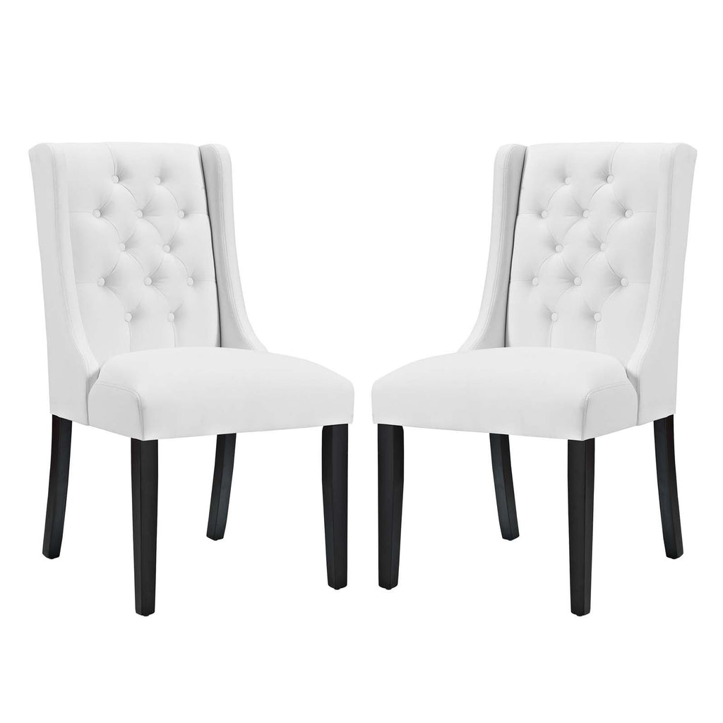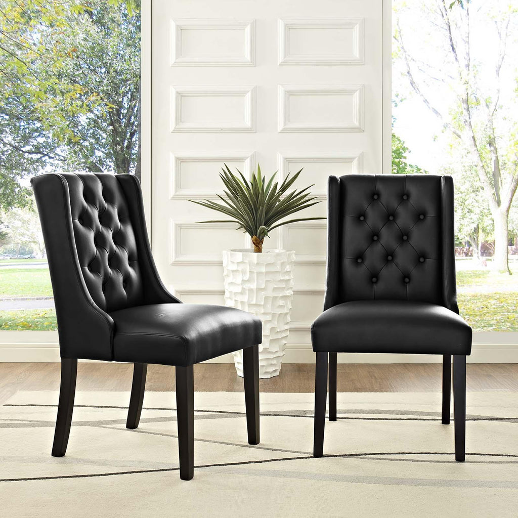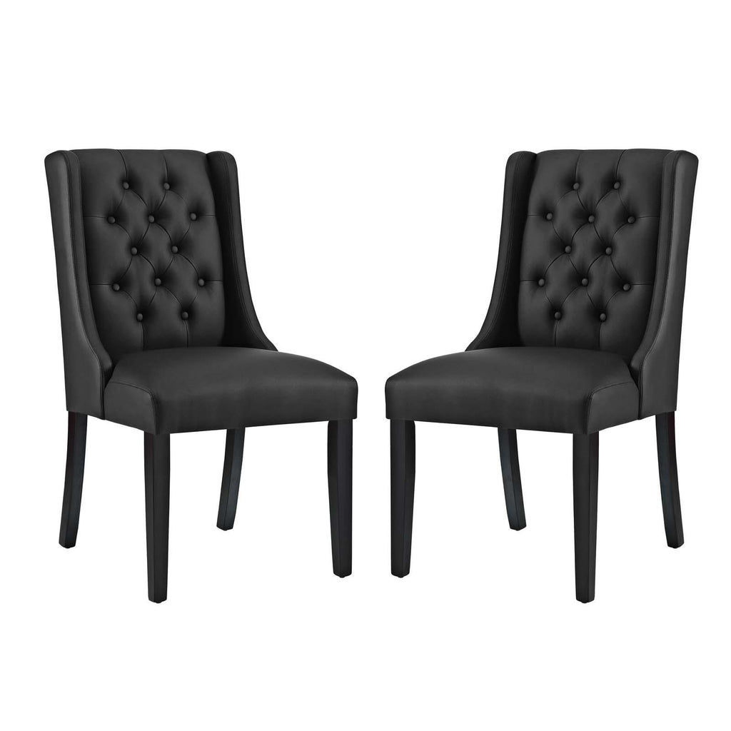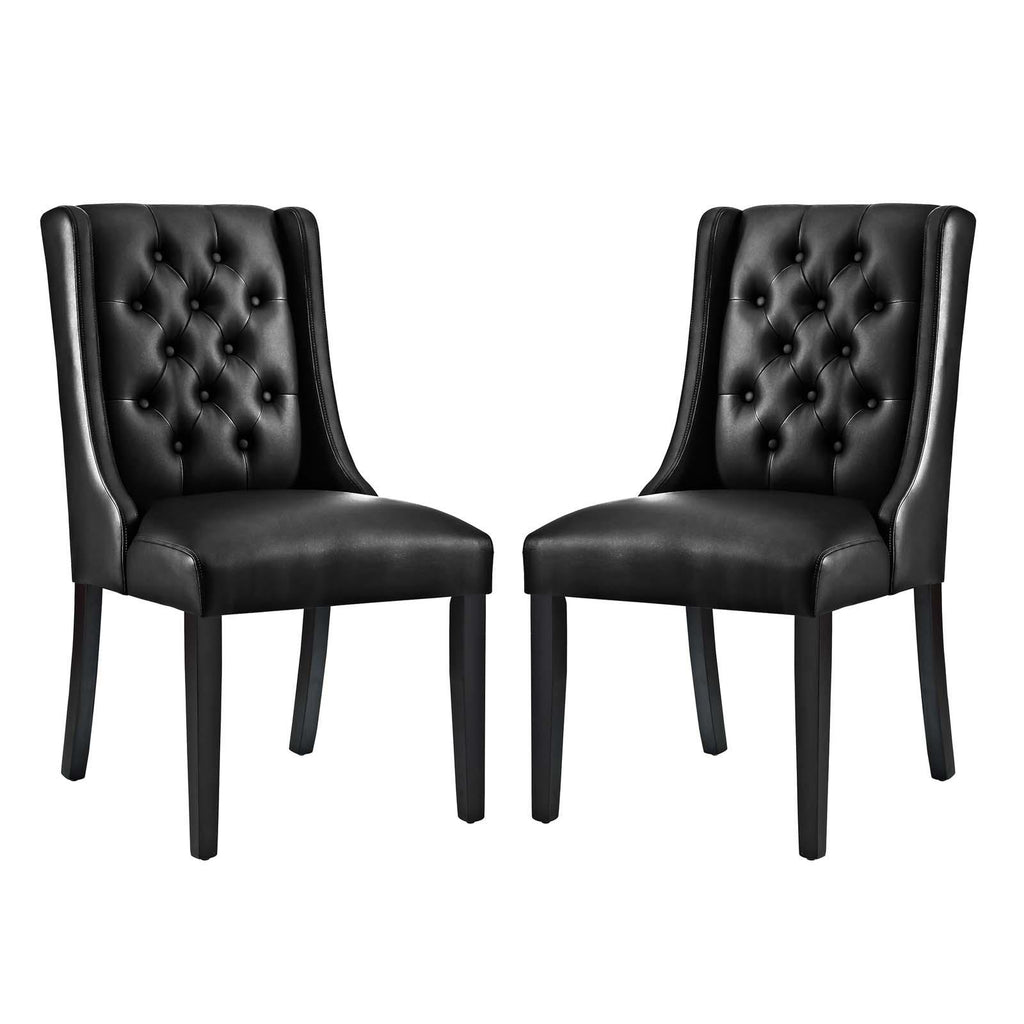 Bestow splendor with Baronet. Charm and elegance adorn this luxurious button tufted dining chair complete with sleek curves and dignified form. Featuring dense foam padding, fine vinyl upholstery, a solid wood frame, and non-marking foot glides, Baronet is a stylish dining chair perfect for the modern home. Set Includes: Two - Baronet Dining Chair Elegant Modern Dining Side Chair Dense Foam Padding for Comfort Solid Rubberwood Legs Non-Marking Foot Caps Fine Vinyl Upholstery Chair Weight Capacity: 286 lbs Assembly Required Overall Product Dimensions: 26.5"L x 21"W x 38.5"H Overall Dining Chair Dimensions: 26.5"L x 21"W x 38.5"H Seat Dimensions: 18"L x 21"W x 20"H Backrest Dimensions: 5.5"L x 18.5"W x 18.5"H Cushion thickness: .5"H Base Dimensions: 21.5"L x 20"W