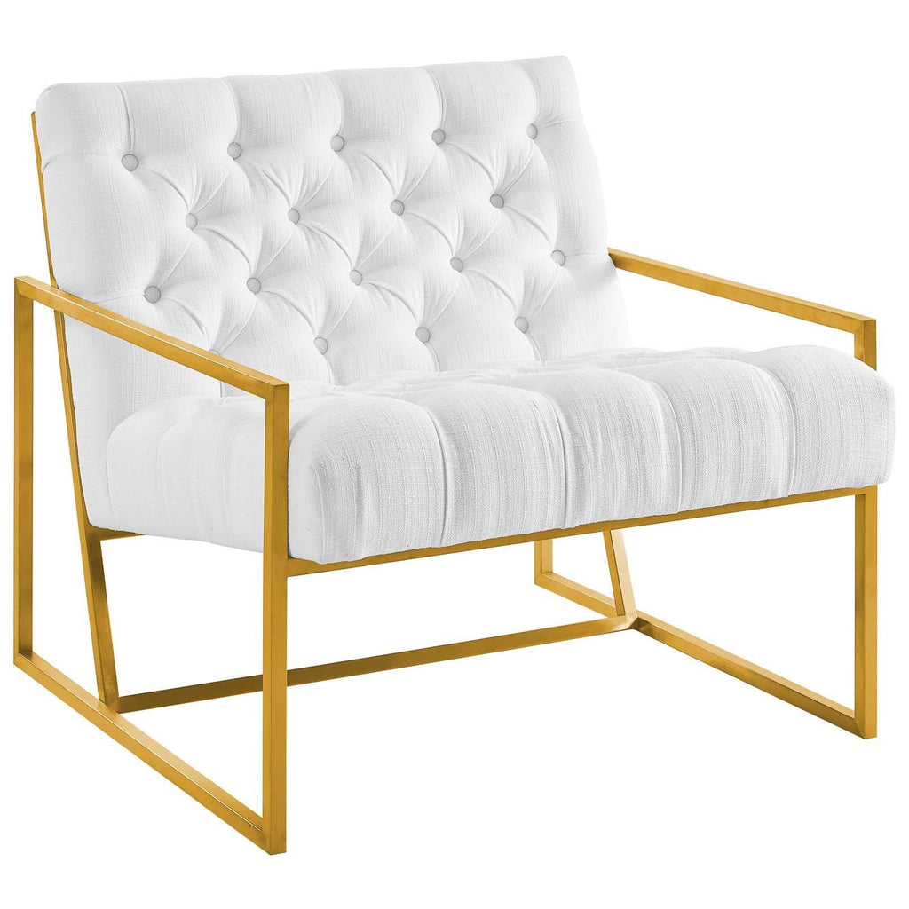 Welcome leisure time with the artfully designed Bequest Accent Lounge Chair. Boasting a striking gold stainless steel metal frame, upholstered in polyester fabric with deep button tufting with plush dense foam padding, Bequest elevates home and apartment decor with its glam aesthetic, sleek profile, cozy comfort, and ergonomic support. Chair Weight Limit: 331 lbs. Comes Fully Assembled. Set Includes: One - Bequest Gold Stainless Steel Accent Chair Modern Button Tufted Accent Chair Gold Stainless Steel Frame Elegant Deep Button Tufting Soft Polyester Fabric Dense Foam Padding Chair Weight Limit: 331 lbs. Comes Fully Assembled Overall Product Dimensions: 30.5"L x 30.5"W x 28.5"H Seat Dimensions: 21"L x 28.5"W x 17.5"H Armrest Dimension: 19"H Armrest Height from Seat: 1.5"H Backrest Dimensions: 6"L x 29"W