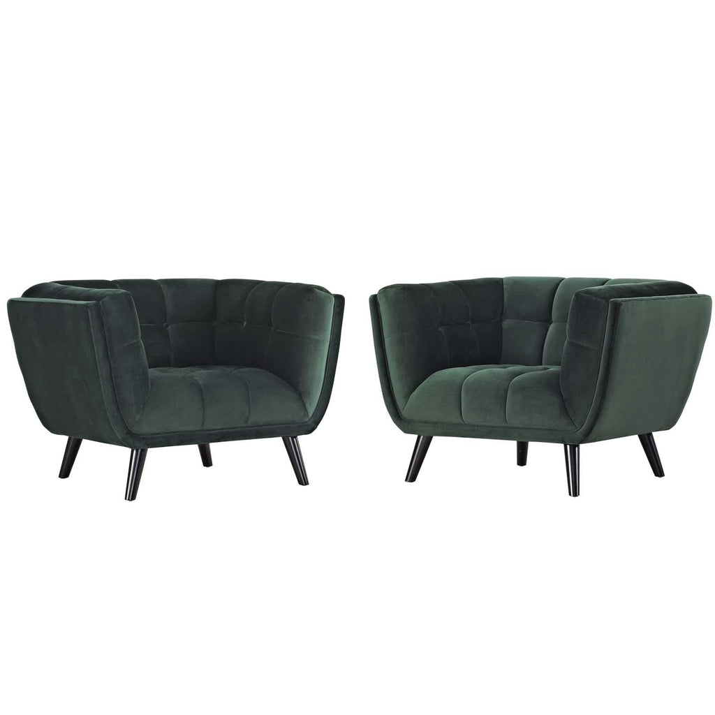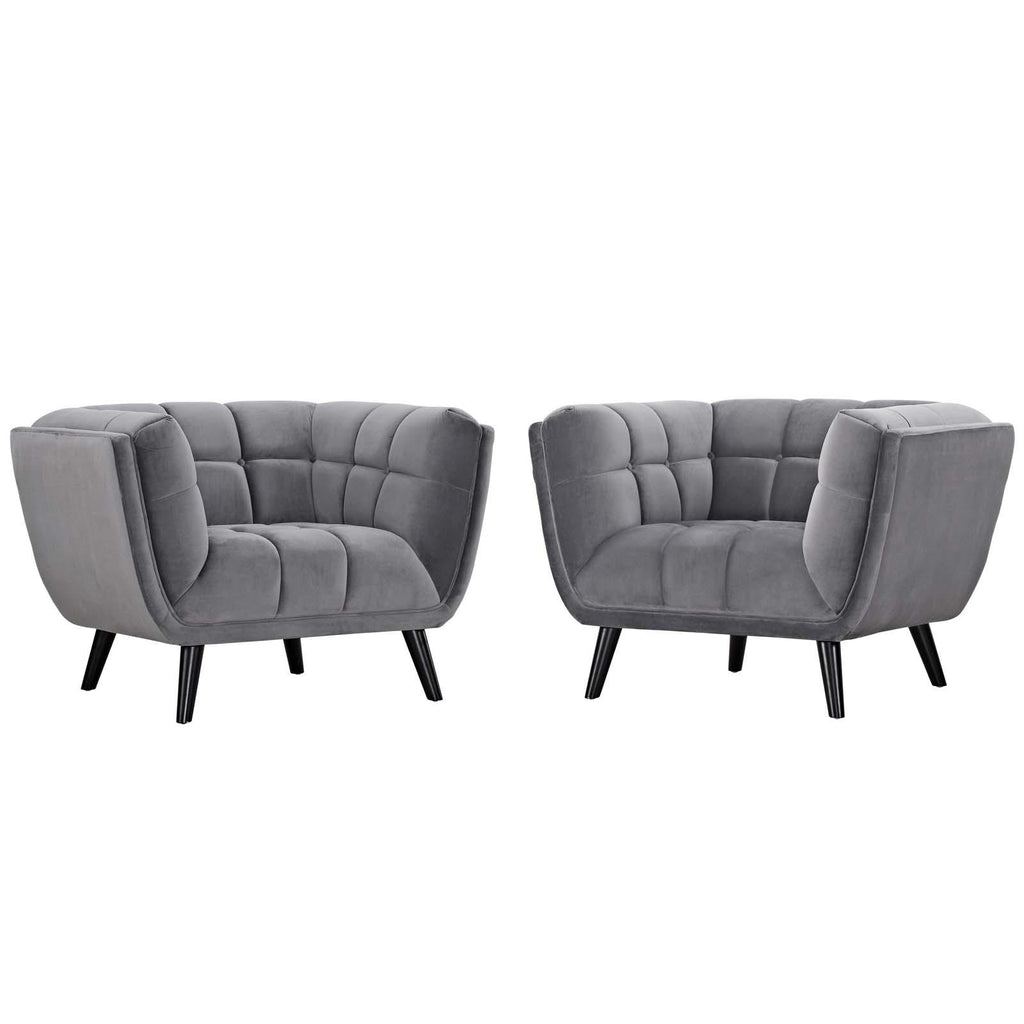 Generously update your d�cor with Bestow Performance Velvet Armchair Set. Uniquely designed with a striking broad profile, Bestow comes in soft, stain-resistant performance velvet polyester upholstery with dense foam padding and elegant button tufting. Sturdily positioned on splayed and tapered black finish wood legs with non-marking foot caps, Bestow boasts a bountiful living room seating design brimming with possibilities. With ample seat depth and overscaled frame, invite all your guests to sit comfortably in this 12" high back and arm rest collection perfect for mid-century, modern farmhouse or contemporary decors.