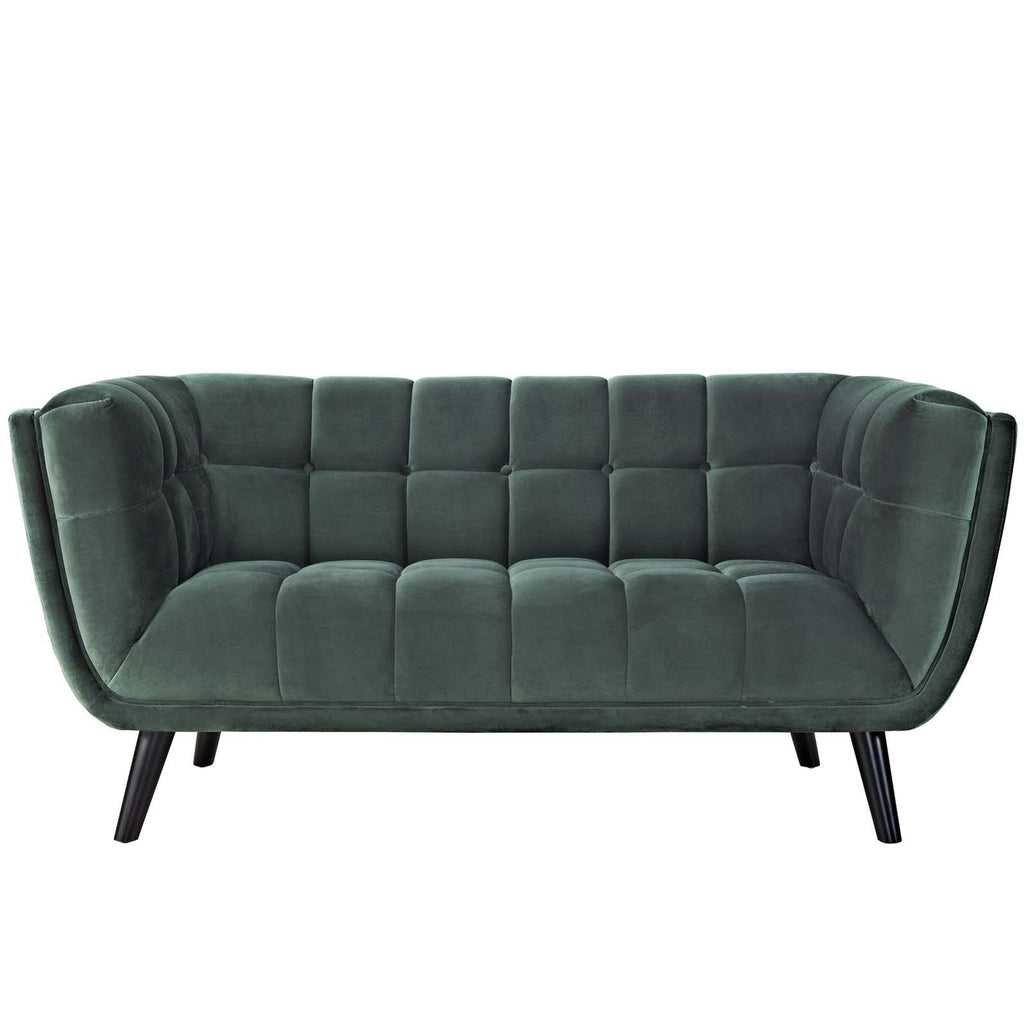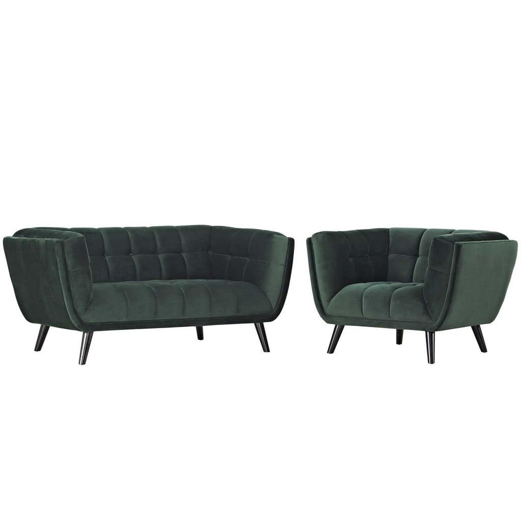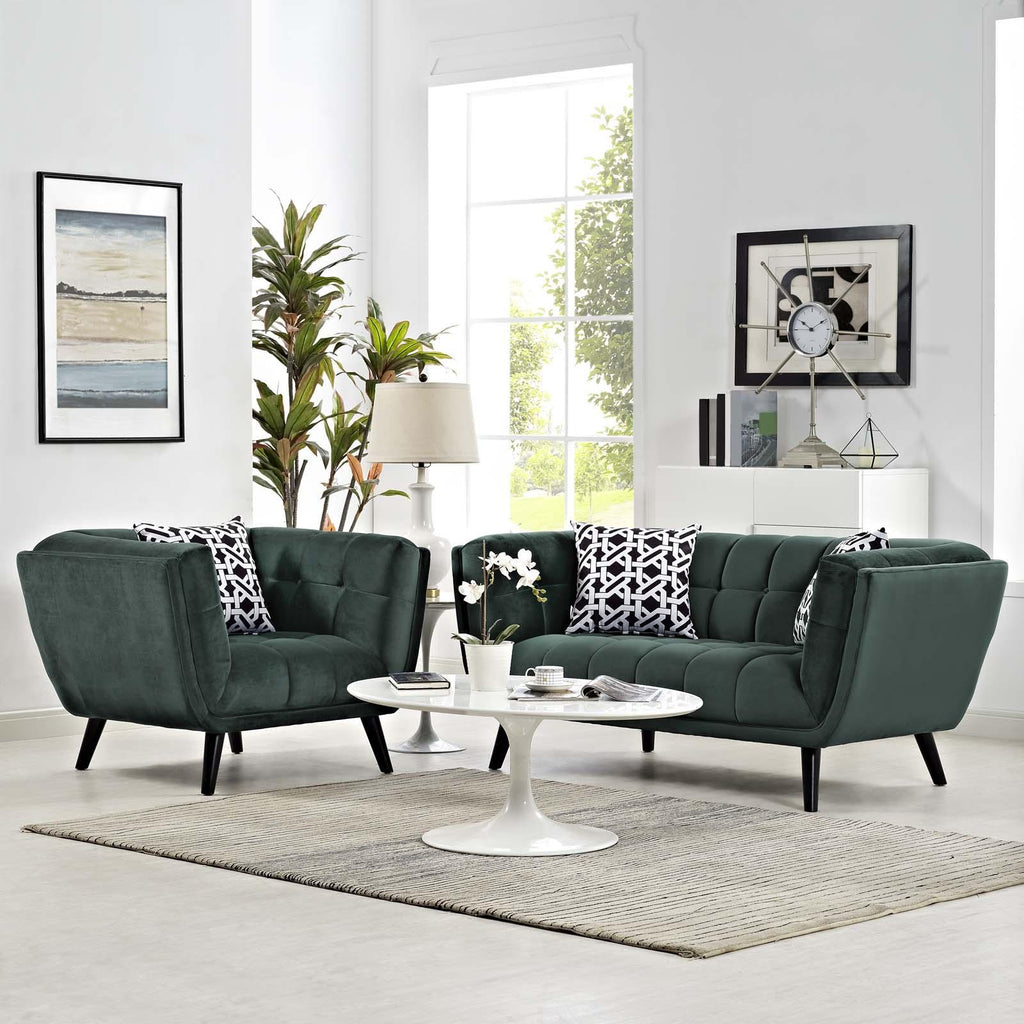 Generously update your d�cor with Bestow Performance Velvet Living Room Set. Uniquely designed with a striking broad profile, Bestow comes in soft, stain-resistant velvet polyester upholstery with dense foam padding and elegant button tufting. Sturdily positioned on splayed and tapered black finish wood legs with non-marking foot caps, Bestow boasts a bountiful living room seating design brimming with possibilities. With ample seat depth and overscaled frame, invite all your guests to sit comfortably in this 12" high back and arm rest collection perfect for mid-century, modern farmhouse or contemporary decors.