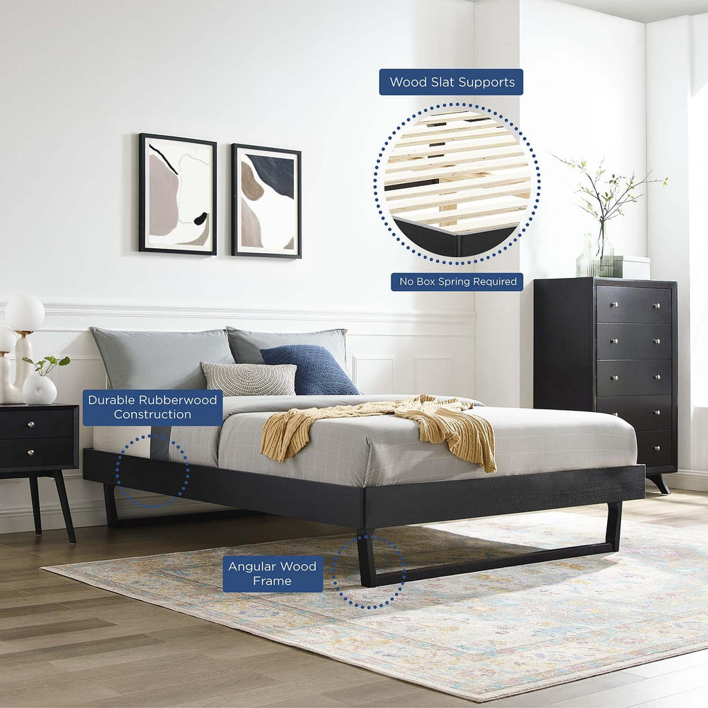 Set the stage for modern style and comfortable sleep with the Billie Twin Platform Bed. Inspired by mid-century design, this twin size bed frame boasts retro detail with contemporary accents and organic aesthetics to bring trending modernity to a guest bedroom or kid's bedroom. Adapting to any decor theme with the option of interchangeable headboards, this bed frame is compatible with the Robbie, Draper, Archie, and Collins headboard collections. This platform bed frame is a sturdy addition to the bedroom with a durable wood, MDF, and veneer construction and angular rubberwood legs. Eliminating the need for a box spring, this twin bed is complete with a wood slat support system, reinforced center beam, and supporting legs that make it a lasting mattress foundation for memory foam, latex, innerspring, and hybrid mattresses. Assembly required. Twin Bed Frame Weight Capacity: 601 lbs.