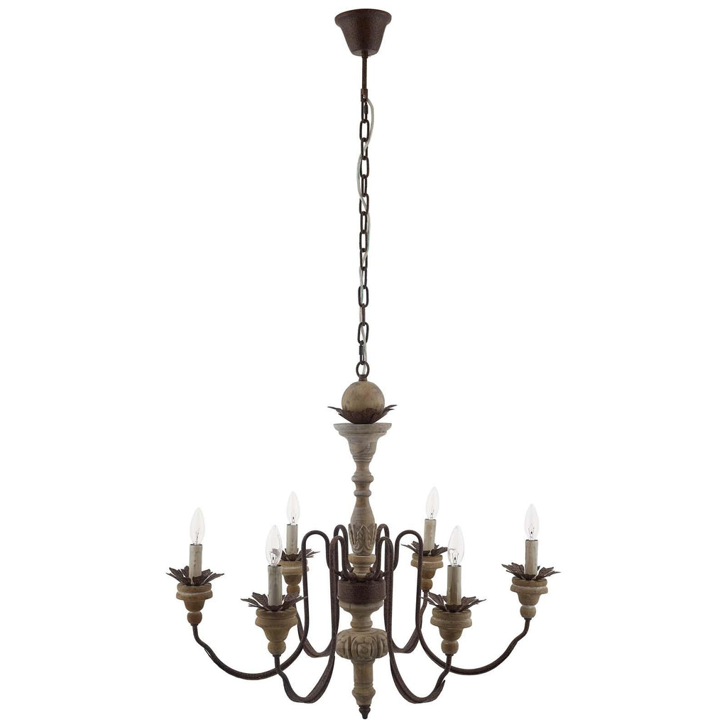 Elevate your home with the timeless elegance of the Bountiful Vintage French Pendant Ceiling Light Candelabra Chandelier. A vibrant addition to your living room, bedroom, foyer, or dining room, this modern farmhouse pendant light candelabra chandelier features sweeping metal arms, a beautifully carved natural wood center column, and candle-style light holders each surrounded by an ornate leaf design. Bountiful hangs from a 49" metal chain with a flush wall mount and grants chateau charm to your home. This rustic pendant light fixture requires six E12 25-watt light bulbs (not included). Set Includes: One - Bountiful Vintage French Pendant Ceiling Light Candelabra Chandelier Vintage French Candelabra Chandelier Distressed Solid Wood Frame Antique Metal Arms Needs 6 E12 25W Bulbs (not included) 49" Chain with Flush Wall Mount UL Listed and Approved Requires Professional Installation Overall Product Dimensions: 32.5"L x 32.5"W x 84.5"H