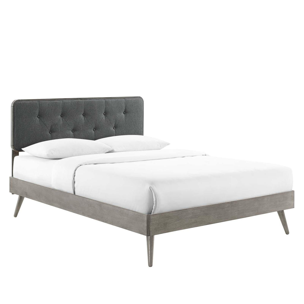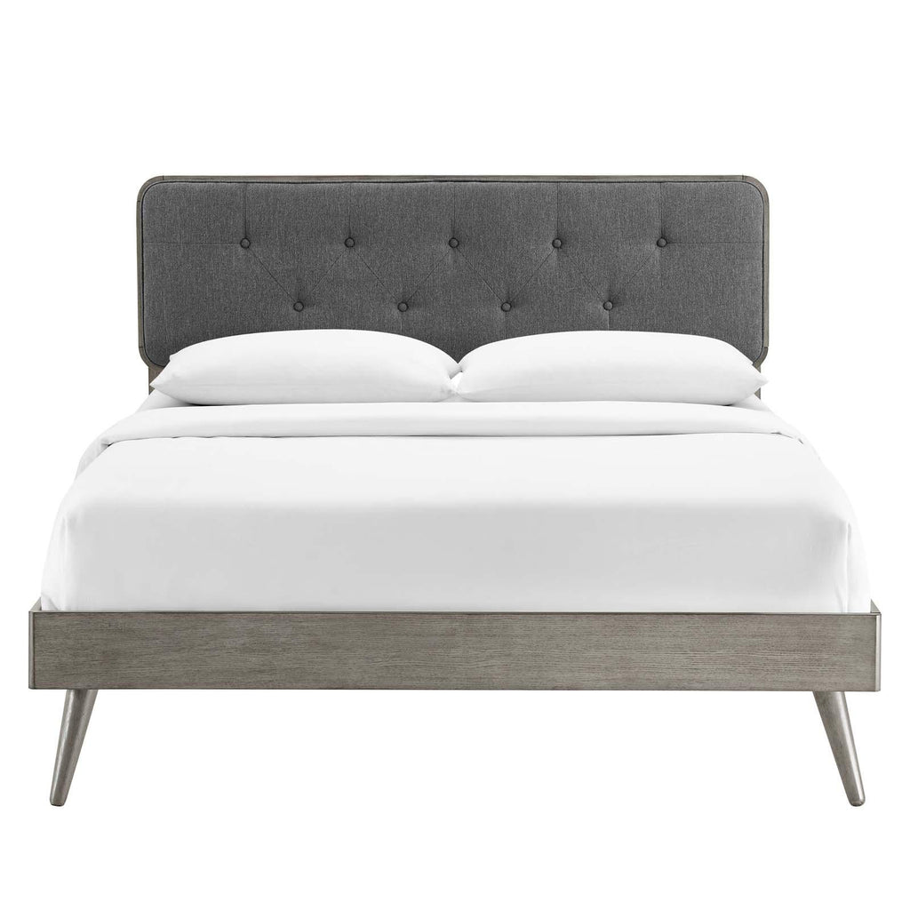 Infuse modern style into your master bedroom or guest room decor with the retro detail and organic aesthetics of the Bridgette Tufted Wood Twin Platform Bed. Inspired by mid-century style, the upholstered headboard on this twin bed frame features a classic button tufted design framed in rich wood grain. This platform bed frame is a sturdy addition to the bedroom with a durable wood, MDF, and veneer construction and splayed rubberwood legs. Eliminating the need for a box spring, this twin bed is complete with a wood slat support system, reinforced center beam, and supporting legs that make it a lasting mattress foundation for memory foam, latex, innerspring, and hybrid mattresses. Assembly required. Twin Bed Frame Weight Capacity: 601 lbs.
