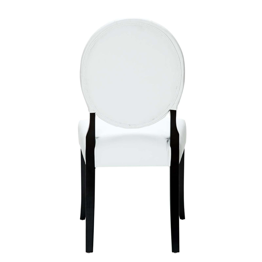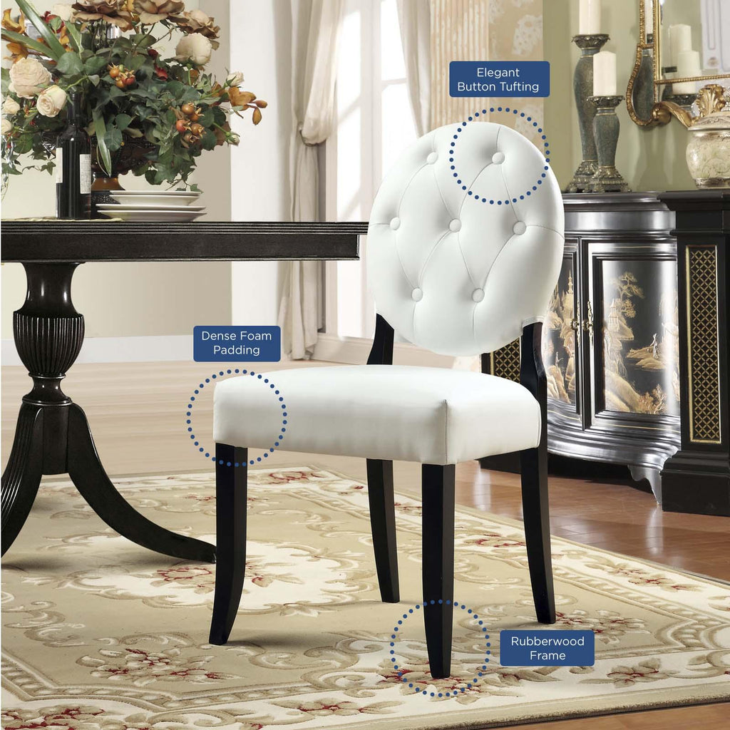 Playing off whimsical spatial elements the Button Faux Leather Upholstered Tufted Dining Side Chair, gives vintage glamour style a home. Bring light-filled moments inward with laughter and delight as you situate yourself with a softly luxurious dining chair seat. Generously dense foam padding and durable faux leather upholstery cover the solidly constructed wood frame of Button Dining Side Chair. With its padded faux leather seat and black wooden tapered legs, merge fancy and opposites as you uncover yet greater horizons with the Button Faux Leather Dining Side Chair.