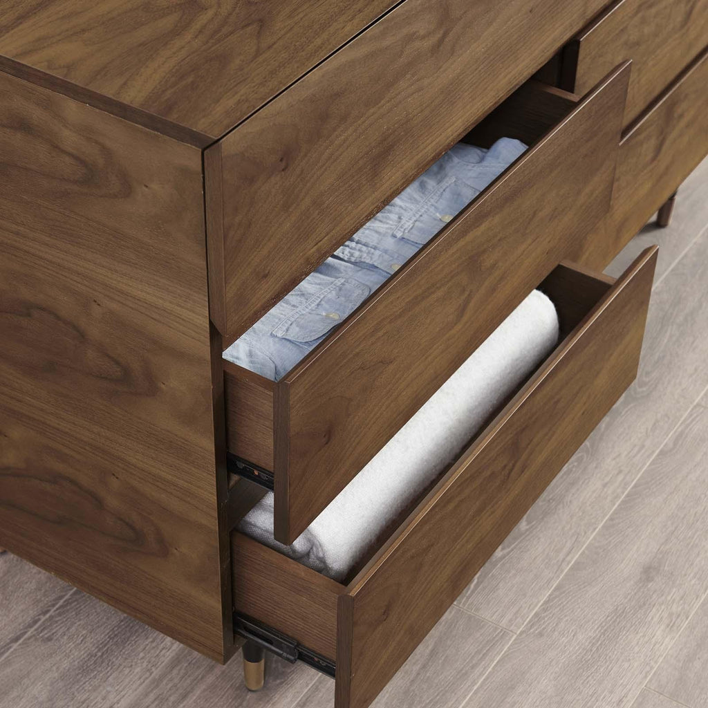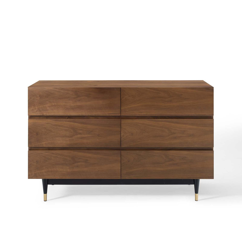 Introduce opulent energy to your bedroom decor with the elegantly distinguished Caima Dresser. Solidly constructed with MDF boasting beautifully grained brown walnut veneer, the Caima Dresser claims center stage in your master suite or guest room setting. The Caima Dresser has six soft-close easy glide drawers for storage and rests atop tapered black legs with a rose gold metallic finish and non-marking foot caps to protect your flooring. Rustic appeal exudes from the sleek dresser, allowing this wooden accent piece to support your master suite and guest room needs. Assembly required. Set Includes: One - Caima 6-Drawer Dresser Mid-Century Dresser Six Storage Drawers Solidly Constructed Brown Walnut Veneer Black Tapered Legs Rose Gold Metallic Accents Assembly Required Overall Product Dimensions: 17.5"L x 47"W x 29.5"H Table Top Thickness: 0.5"H Inner Drawer Dimensions: 12.5"L x 20.5"W x 3.5"H Drawer Frame Dimensions: 0.5"W x 4"H