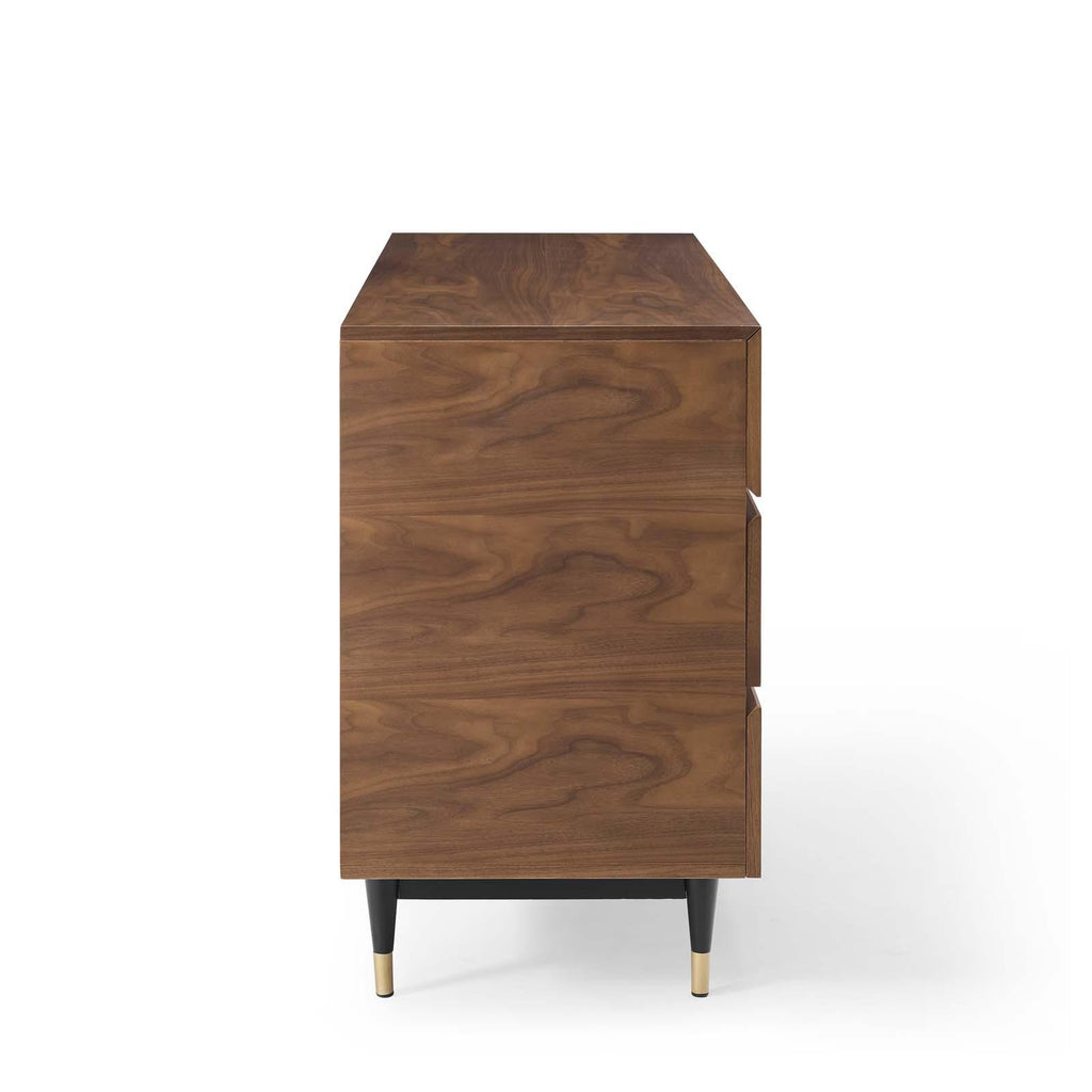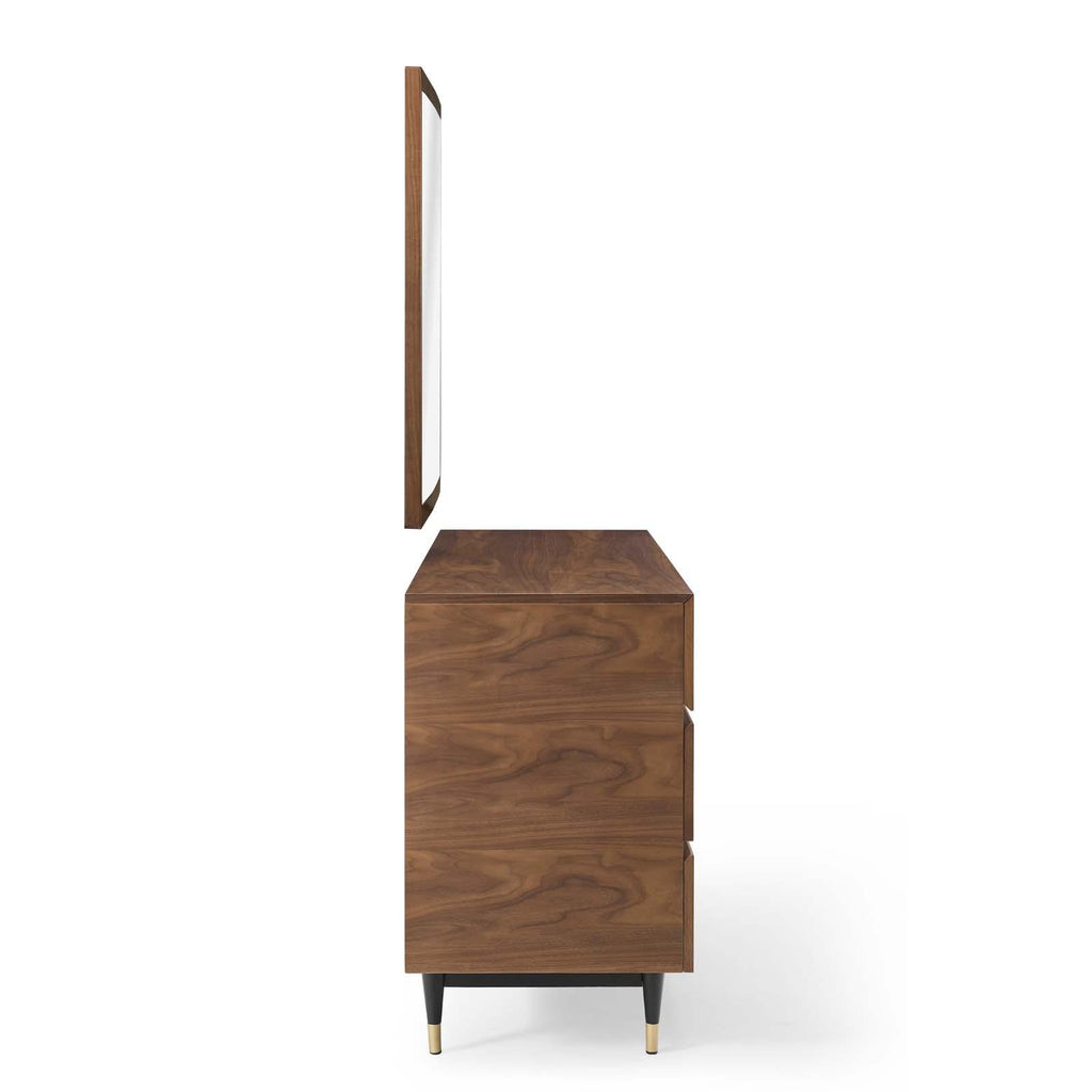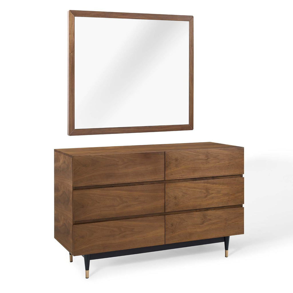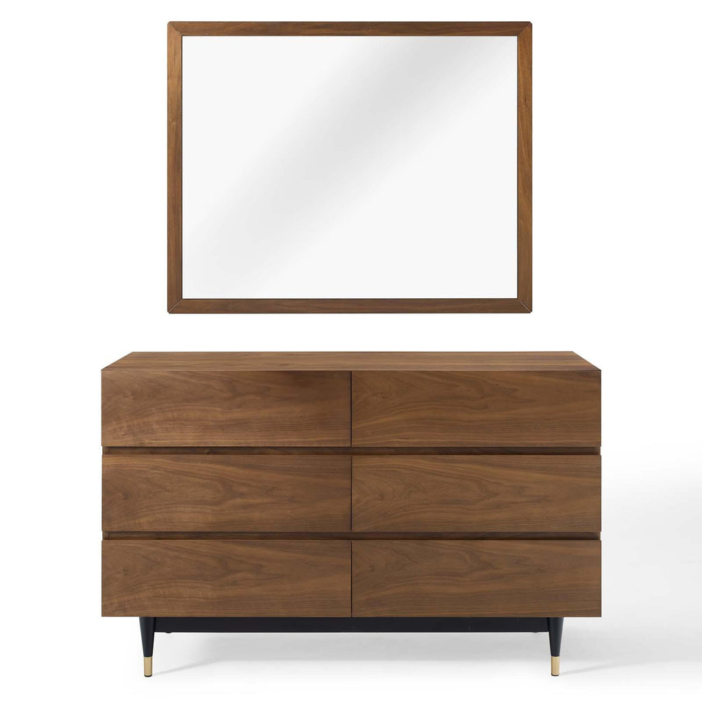 Introduce opulent energy to your bedroom decor with the elegantly distinguished Caima Dresser/Accent Mirror. Solidly constructed with MDF boasting beautifully grained brown walnut veneer, the Caima Dresser/Accent Mirror claims center stage in your master suite or guest room setting. The Caima Dresser has six soft-close easy glide drawers for storage and rests atop tapered black legs with a rose gold metallic finish and non-marking foot caps to protect your flooring. Rustic appeal exudes from the sleek dresser, allowing this wooden accent piece to support your master suite and guest room needs. Assembly required. Set Includes: One - Caima 6-Drawer Dresser One - Caima Mirror Mid-Century Dresser/Urban Accent Mirror Six Storage Drawers Solidly Constructed Brown Walnut Veneer Black Tapered Legs Rose Gold Metallic Accents MDF Frame Assembly Required Overall Dresser Dimensions: 17.5"L x 47"W x 29.5"H Table Top Thickness: 0.5"H Inner Drawer Dimensions: 12.5"L x 20.5"W x 3.5"H Drawer Frame Dimensions: 0.5"W x 4"H Overall Mirror Dimensions: 0.5"L x 31.5"W x 39.5"H Overall Product Dimensions: 17.5"L x 47"W x 69"H