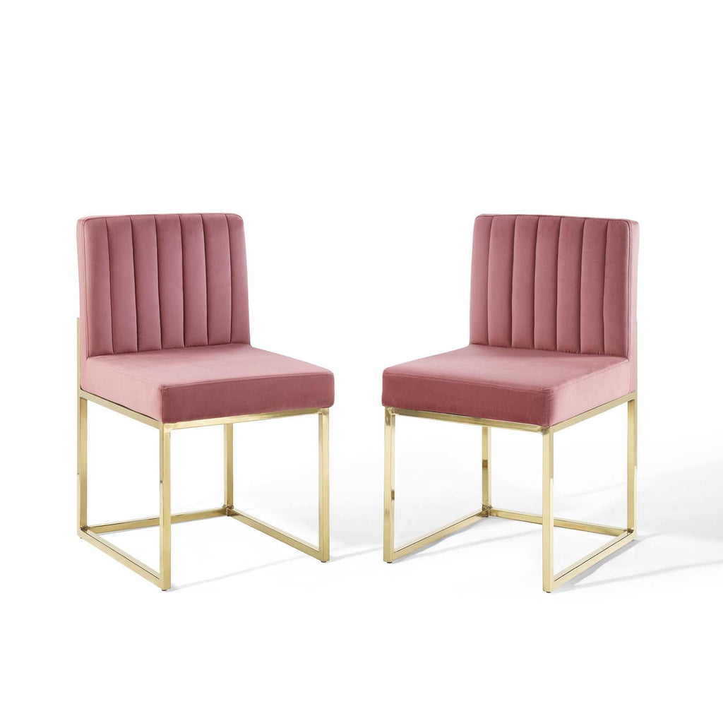 When your dining room decor calls for a striking statement, usher in the bold design of the Carriage Channel Tufted Performance Velvet Upholstered Sled Base Dining Chair. Crisp lines flow with the gold stainless steel sled base of this dining accent chair. Soft and stain-resistant performance velvet polyester upholstery covers the dense foam padding while vertical channel tufting add depth to this glam deco dining chair. The Carriage Dining Side Chair enhances any decor scheme in your dining room, living room, lounge room or office. Chair Weight Capacity: 331 lbs. Assembly Required.
