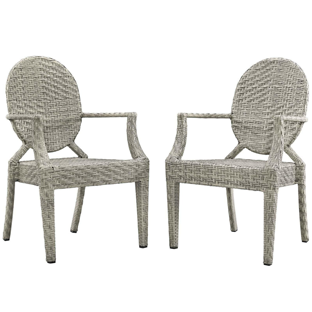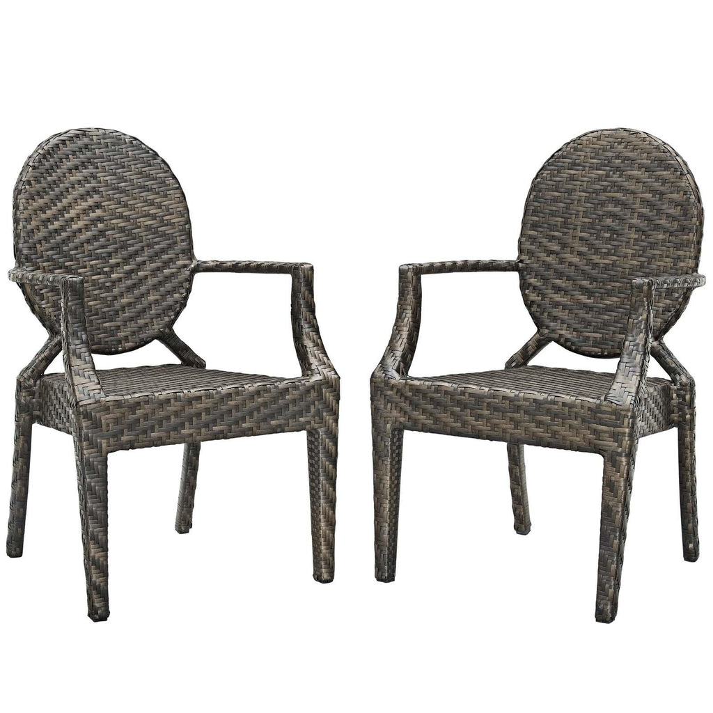 This Casper Outdoor Patio Rattan Dining Arm Chair Set of 2 will revolutionize your patio arrangement with functional grace and artistic harmony. Made of weather tested dual-gray synthetic rattan, Casper Outdoor Dining Chairs will become the favorite resting point for scenic admiration and memorable moments.