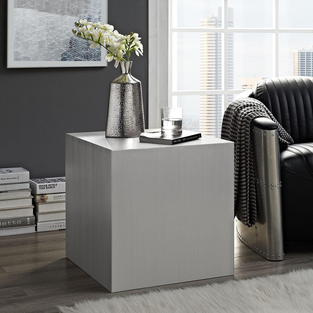 Forge a molten form molded out of modernity. The Cast Side Table is comprised of brushed stainless steel sheets and skillfully welded into one seamless design. Center your visual space with a piece that delivers an inherently pleasing aesthetic. Perfect for contemporary living rooms and lounge spaces. Set Includes: One - Cast Side Table Contemporary Side Table Brushed Stainless Steel Sheets Non-Marking Foot Glides No Assembly Required Overall Product Dimensions: 19.5"L x 19.5"W x 19.5"H