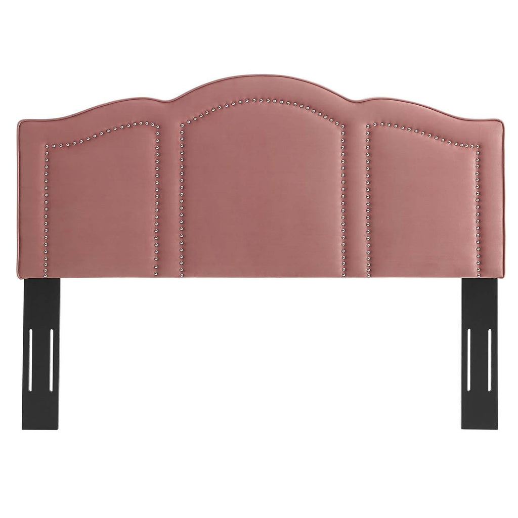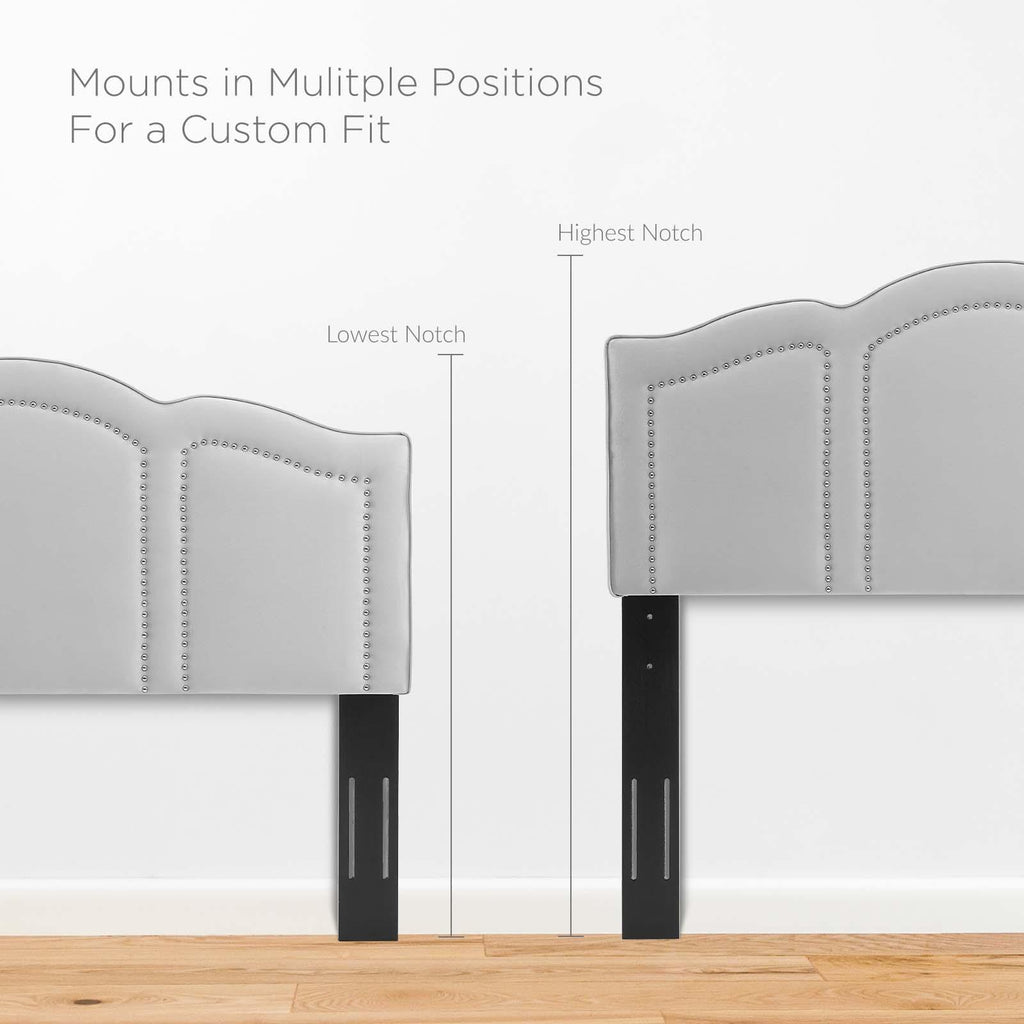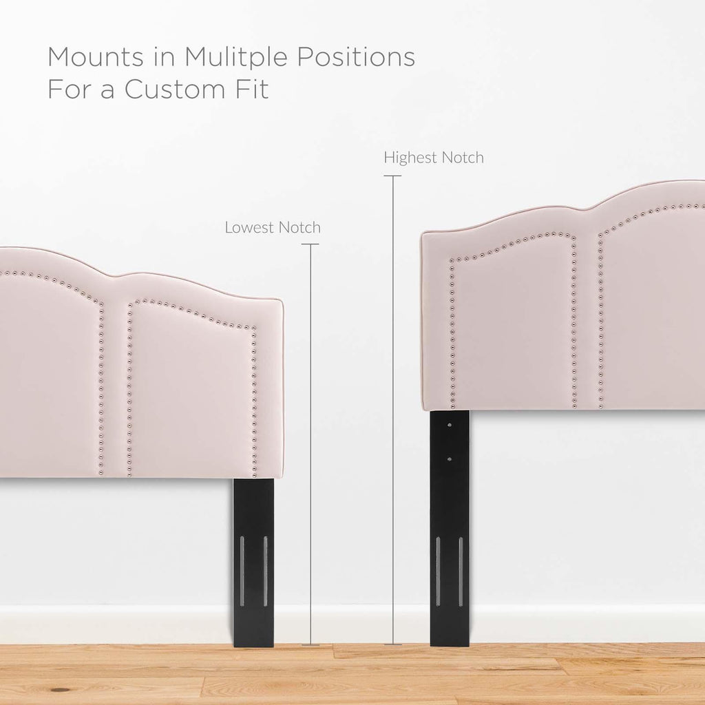 Reimagine the master bedroom or guest bedroom with the glam deco style of the Cecilia Performance Velvet King/California King Headboard. A focal point in the bedroom, this king/Cali king size headboard features classic nailhead trim creating arched window designs that pairs beautifully with its curved silhouette. Covered in soft, stain-resistant performance velvet, this upholstered headboard is padded in dense foam to offer supportive comfort while sitting up in bed reading, relaxing, or watching TV. The perfect backdrop for a variety of bedding and sham styles, this height-adjustable headboard fits king or California king size bed frames with its three mounting positions. Assembly required. Set Includes: One - Cecilia King/California King Headboard King/California King Size Headboard Performance Velvet Upholstery Durable Stain-Resistant Fabric Nailhead Trim Dense Foam Padding 3 Mounting Positions Assembly Required Overall Product Dimensions: 3"L x 78.5"W x 26"H Floor to Bottom of Headboard: 19.5 - 27.5"H