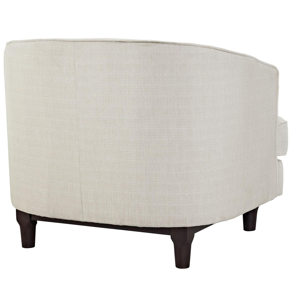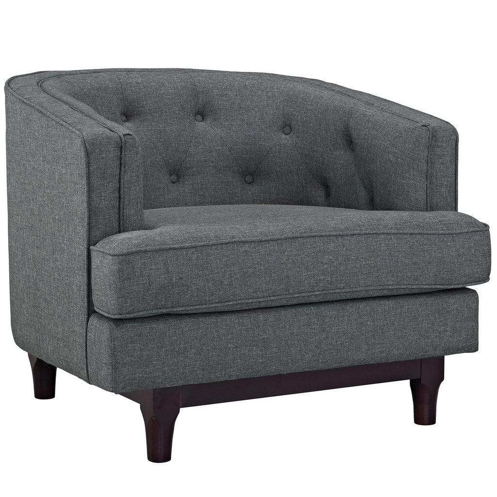 Sale the tide of elegance with Coast. Buoyed with exquisite deep button tufting and fine trim, Coast comes upholstered in polyester with a walnut stained wood leg base with non-marking foot glides. Solidly made with exceptional support, Coast features dense foam cushioning, removable seat covers for easy cleaning and generous seating space. Combining mid-century style with ageless nobility, the Coast armchair is perfect for modern and eclectic living rooms, lounge spaces, and reception areas.