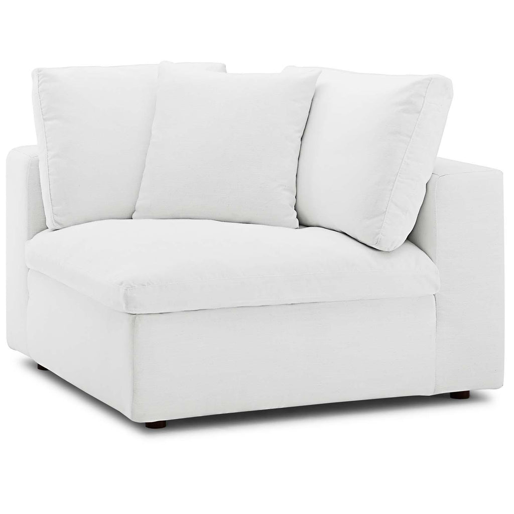 A haven for cozy relaxation, Commix features plush comfort, clean-lined design, and spacious profile, that makes an attractive statement in the modern home. Upholstered in soft polyester fabric, this contemporary corner comes with solid wood construction and cotton and down cushions for a luxurious sink-in feel. Commix comes with generously padded down feather and cotton cushions, and padded foam bases, making this sectional sofa collection perfect for the living room, family room, or game room. Made for sprawling out or curling up, Commix beckons you and guests to sit and stay a while. Includes plastic foot glides. Corner piece includes two back pillows and a throw pillow. Weight Capacity: 331 lbs. Set Includes: One - Commix Down Filled Overstuffed Corner Chair Contemporary Modern Corner Seat 85% Polyester/15% Linen Fabric Upholstery Density Foam Seat Down Feather and Cotton Cushions Solid Wood Construction Assembly Required Chair Weight Capacity: 331 lbs. Overall Product Dimensions: 40"L x 40"W x 35"H Armrest Height: 22.5"H Leg Dimensions: 2"W x 2"H Seat Dimensions: 24.5"L x 24.5"W x 19"H