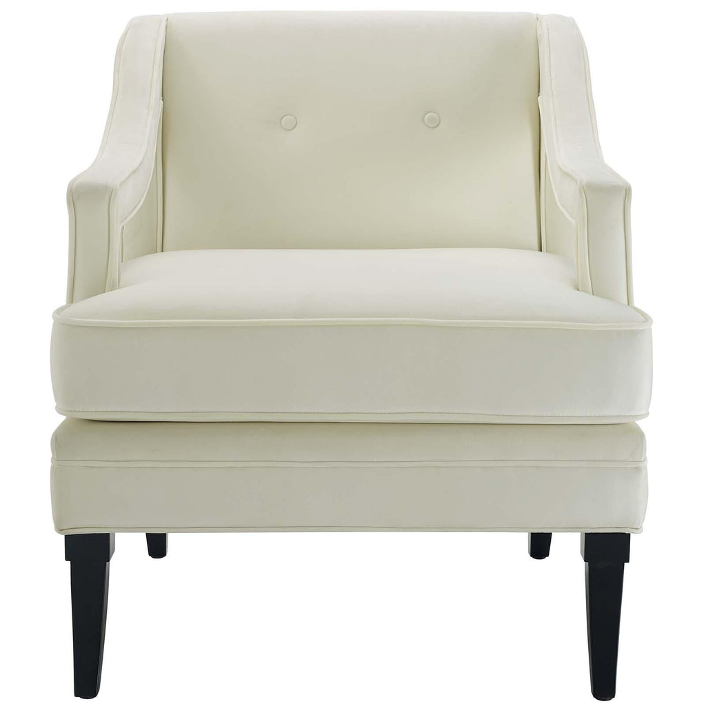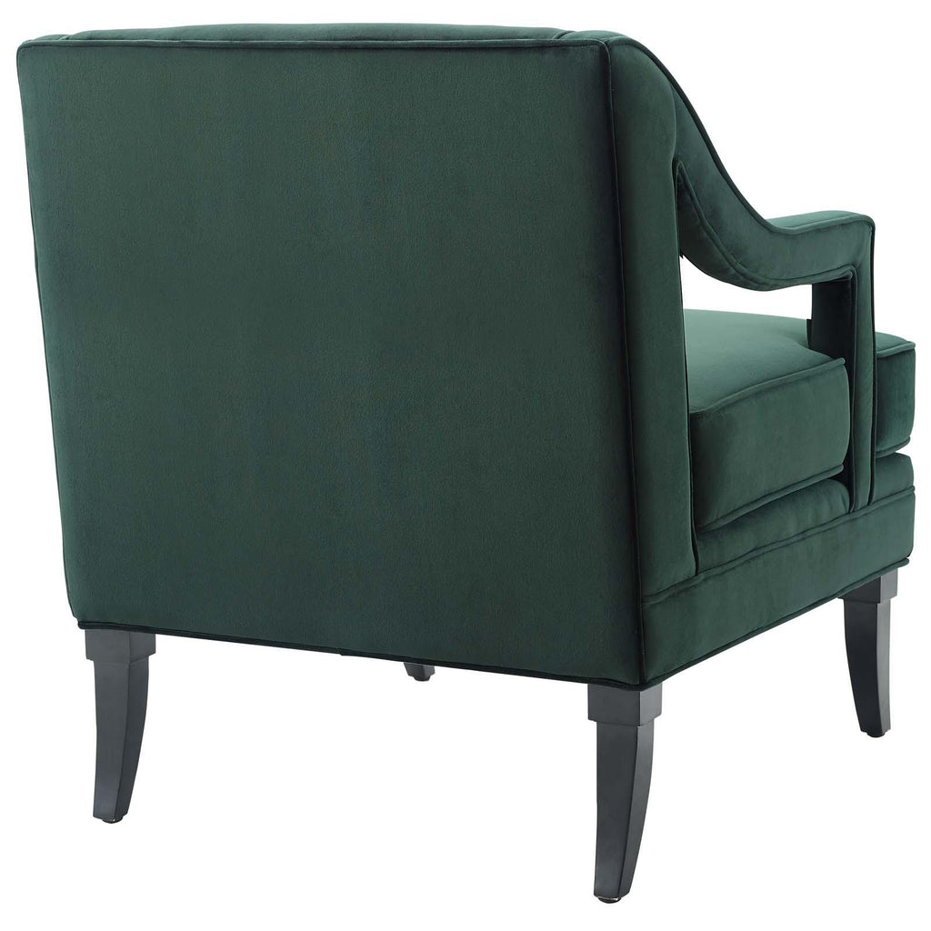 Elevate your home with the streamlined, chic cutout profile of the Concur Performance Velvet Armchair. Upholstered in soft, stain-resistant performance velvet, Concur comes with a plush, 6" thick seat cushion, machine washable cover, and solid birch wood saber legs with non-marking foot caps. Adorned with sloping armrests, a tailored profile, and classic button tufting, this upholstered living room, accent or lounge chair makes a striking statement in a variety of modern and mid-century themed decors. Chair Weight Capacity: 331 lbs.