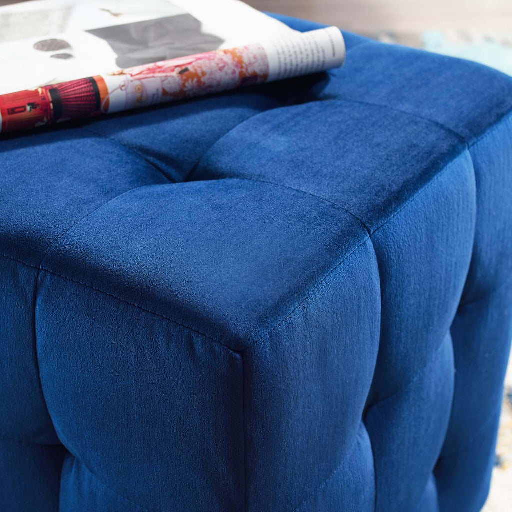Accent your home decor with the Contour Performance Velvet Ottoman. Cube-shaped with button tufting details, Contour is solidly constructed with a plywood frame covered in dense foam padding with performance velvet upholstery. This tufted ottoman comes with soft and durable stain-resistant fabric, non-marking foot caps, and can support up 441 pounds. Perfect for the living room, lounge room, entryway, dorm room, bedroom, or home office, Contour is a versatile accent piece that also serves as a footrest or extra seat. Comes fully assembled.