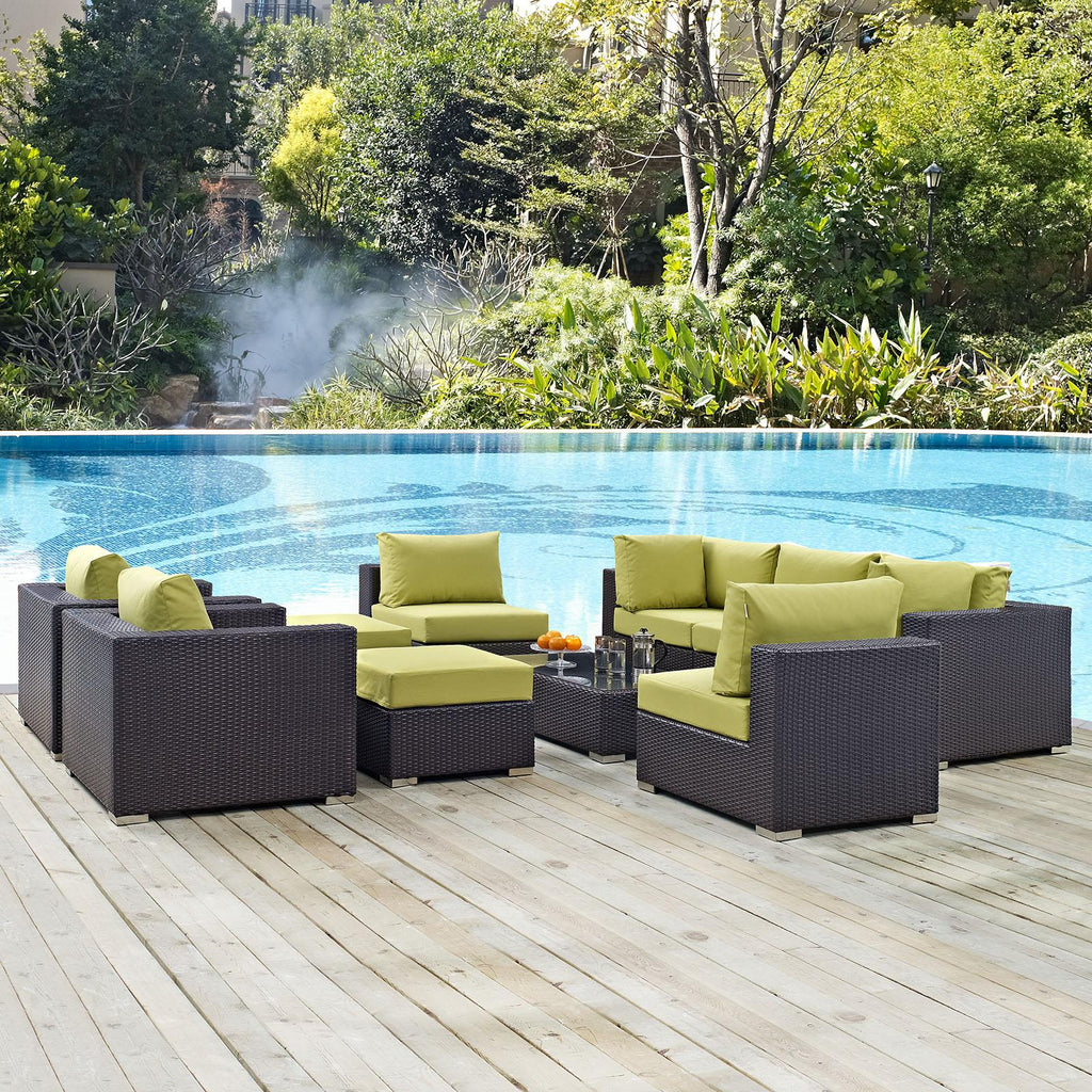Gather stages of sensitivity with the Convene Outdoor Sectional series. Made with a synthetic rattan weave and a powder-coated aluminum frame, Convene is a versatile outdoor furniture set that shifts and combines according to the spontaneous needs of the moment. Outfitted with all-weather fabric cushions, leave a positive impression on friends and family while enhancing your patio, backyard, or poolside repast in this series of palpable distinction. This installment of the series is an Outdoor Patio Sectional Sofa Set.