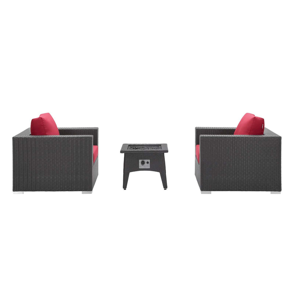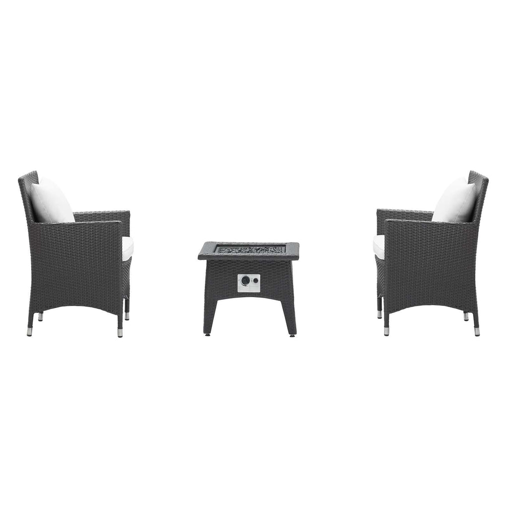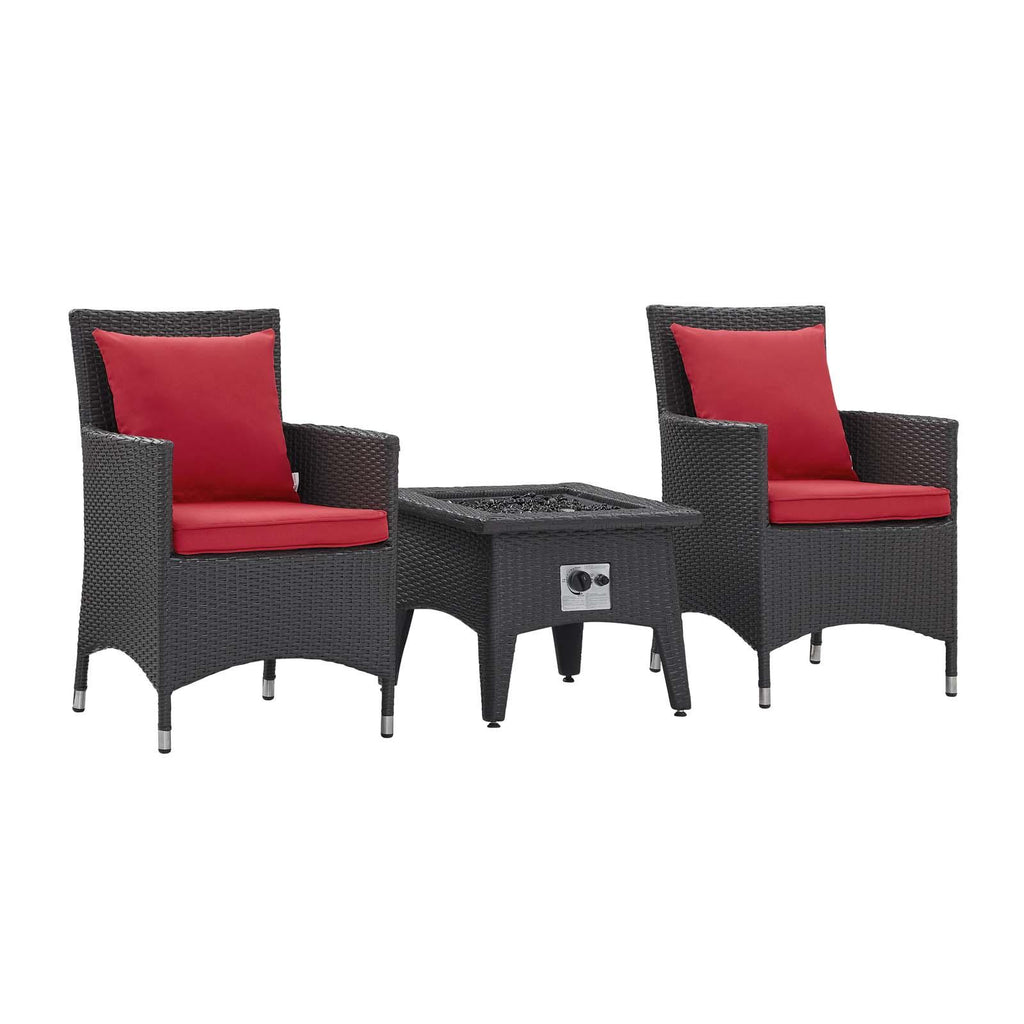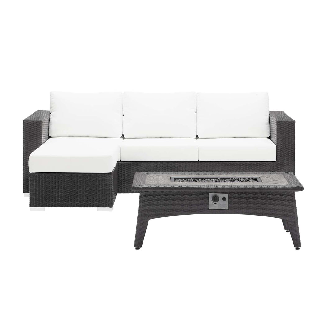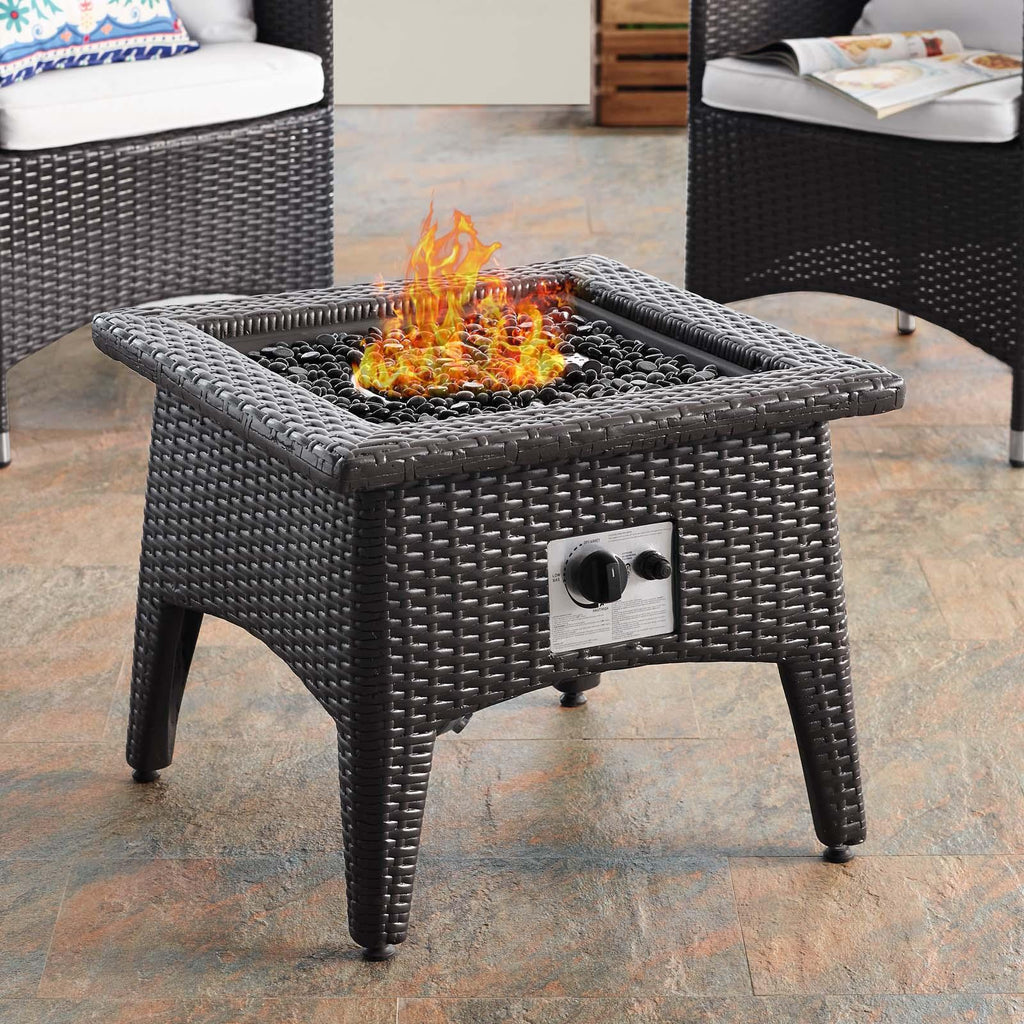 Enjoy the flickering flames of a warm fire or soak up the sunshine with family and friends with the Convene Outdoor Patio Furniture Set and Fire Table. A contemporary update to your outdoor living area, this patio set comes complete with durable aluminum frames wrapped in synthetic wicker rattan and densely padded foam cushions covered in water and UV-resistant covers that offer a serene lounging experience. The propane gas fire pit table features a magnesium oxide molding that mimics the look of rattan and wood with tempered glass beads to fill the center of the rectangular pit. Sturdy and safe, this fire table has a 40,000 BTU burner that creates a smoke-free flame, is CSA certified, easy to control, user-friendly with the turn of a knob and touch of an ignition button, and burns up to 8 hours on high or up to 16 hours on low. Designed for the backyard, patio, or poolside, this outdoor set is perfect for entertainment or relaxation and brings style and modern aesthetics to your outdoor space.