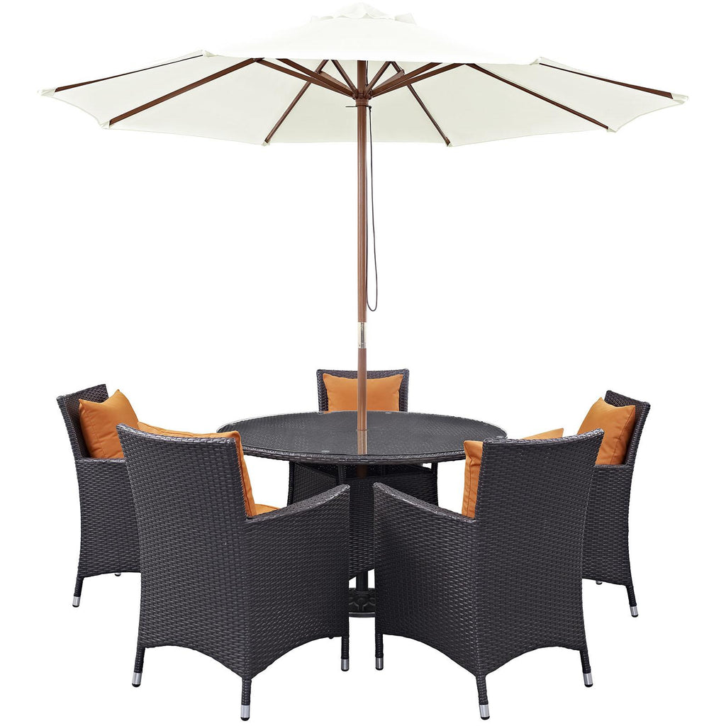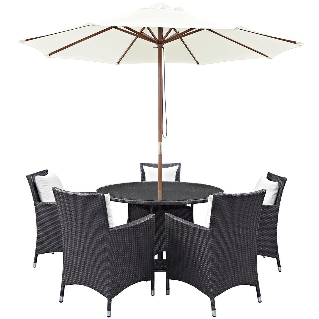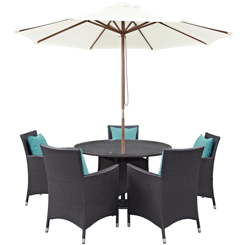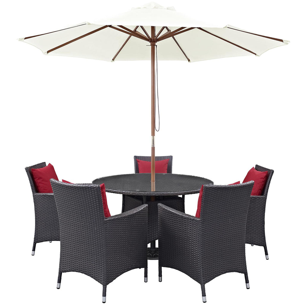 Gather stages of sensitivity with the Convene Outdoor Sectional series. Made with a synthetic rattan weave and a powder-coated aluminum frame, Convene is a versatile outdoor collection that shifts and combines according to the spontaneous needs of the moment. Outfitted with all-weather fabric cushions, leave a positive impression on friends and family while enhancing your patio, backyard, or poolside repast in this series of palpable distinction. This installment of the series is an Outdoor Patio Dining Table and Umbrella Set.