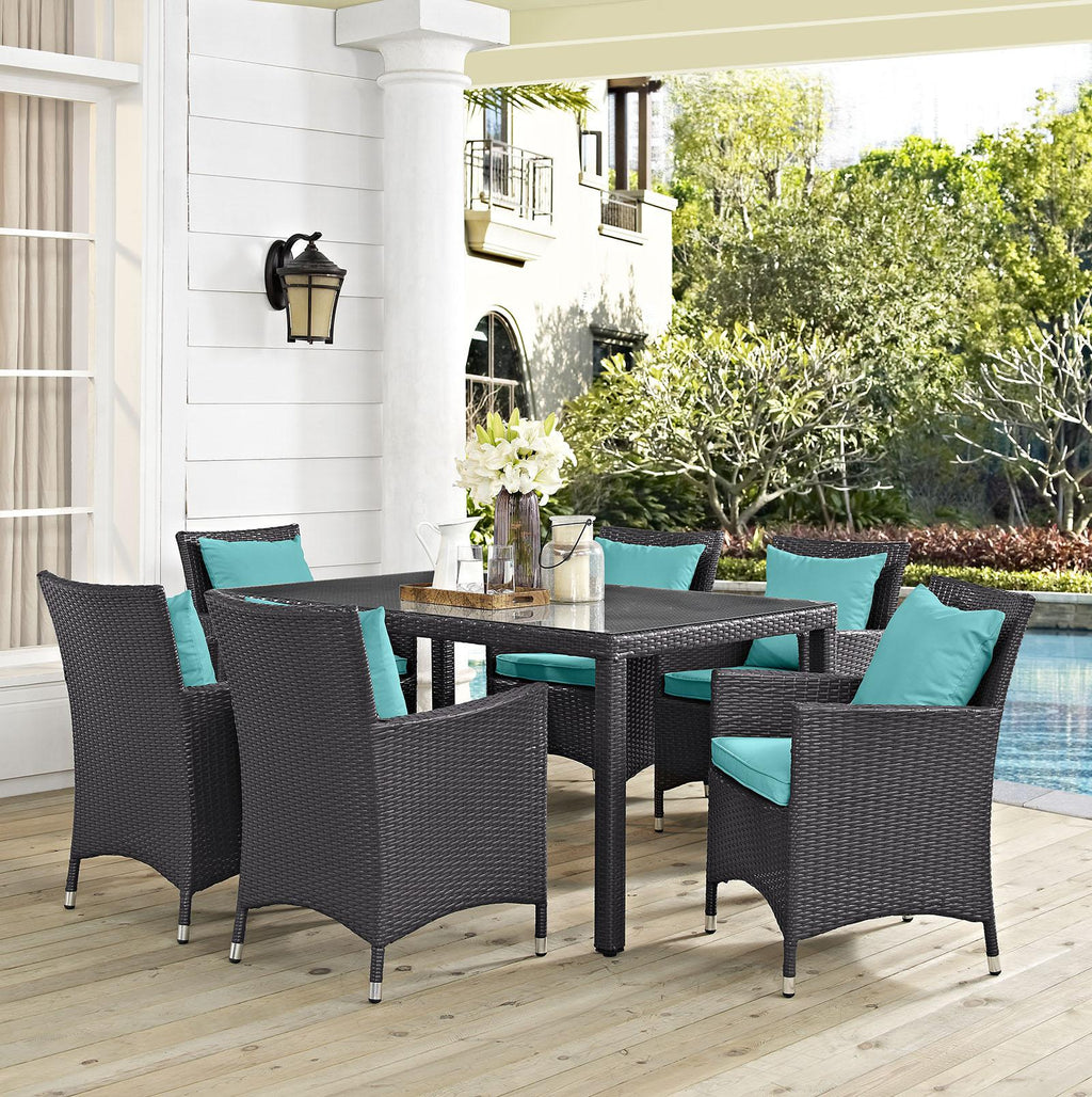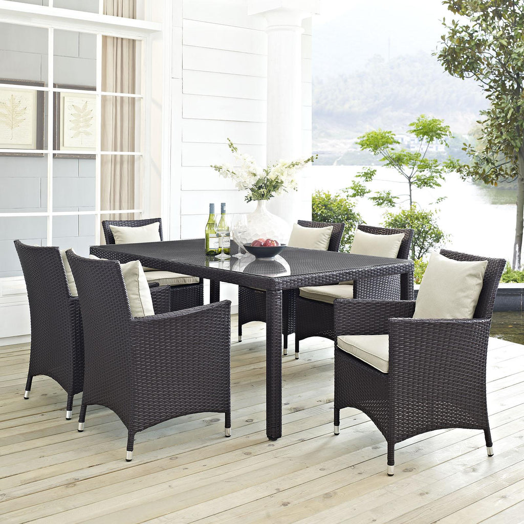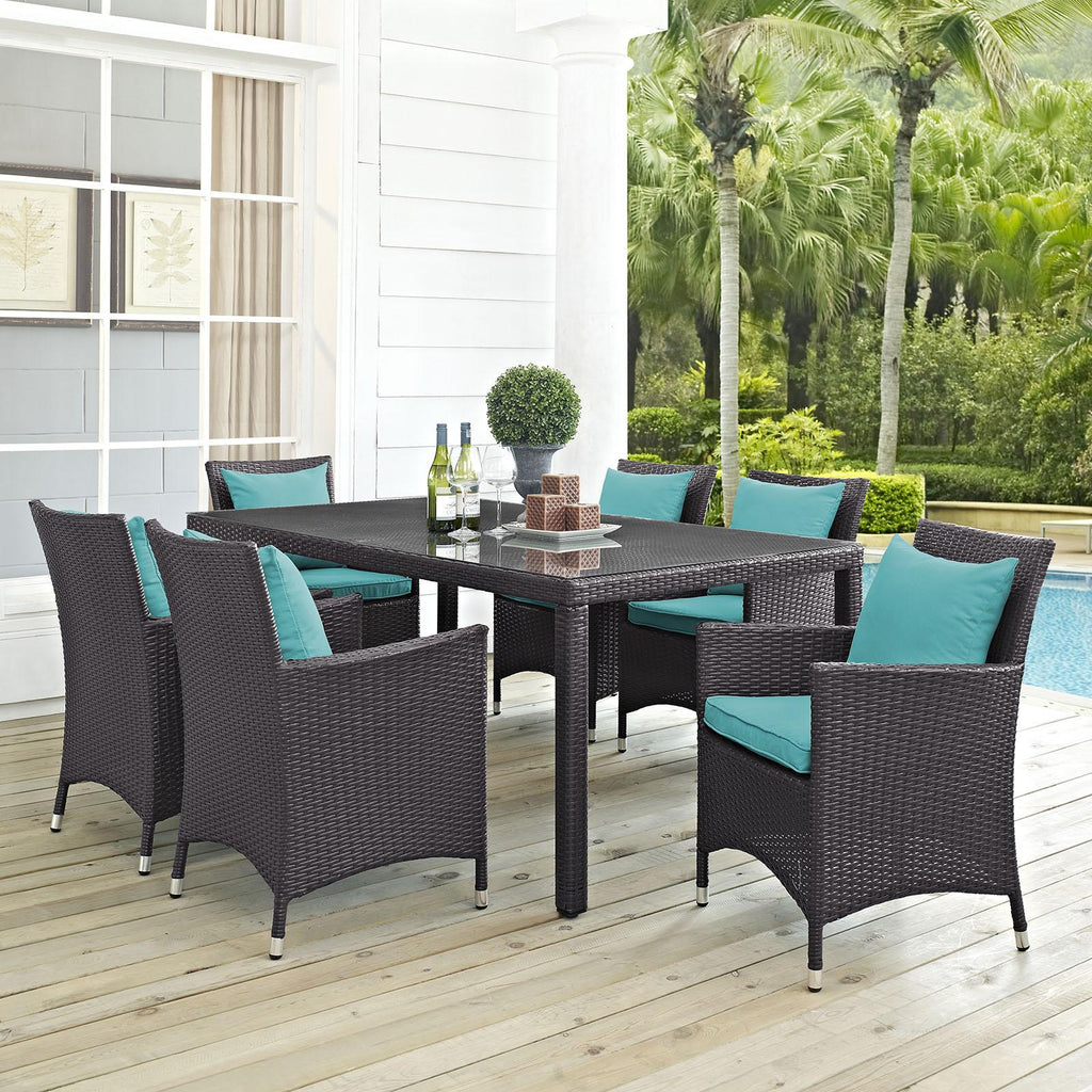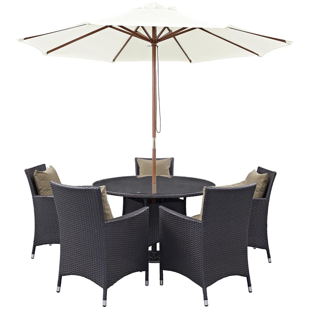 Gather stages of sensitivity with the Convene Outdoor Sectional series. Made with a synthetic rattan weave and a powder-coated aluminum frame, Convene is a versatile outdoor collection that shifts and combines according to the spontaneous needs of the moment. Outfitted with all-weather fabric cushions, leave a positive impression on friends and family while enhancing your patio, backyard, or poolside repast in this series of palpable distinction. This installment of the series is an Outdoor Patio Dining Table and Umbrella Set.