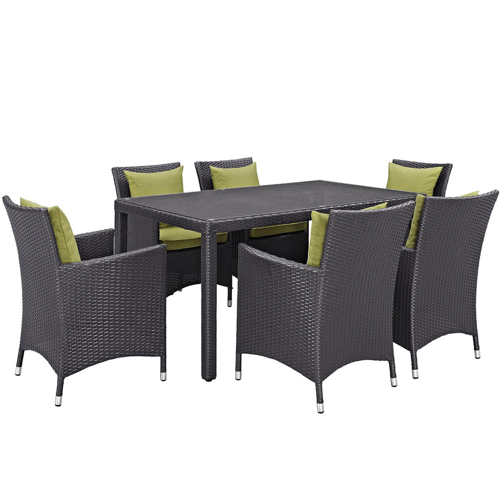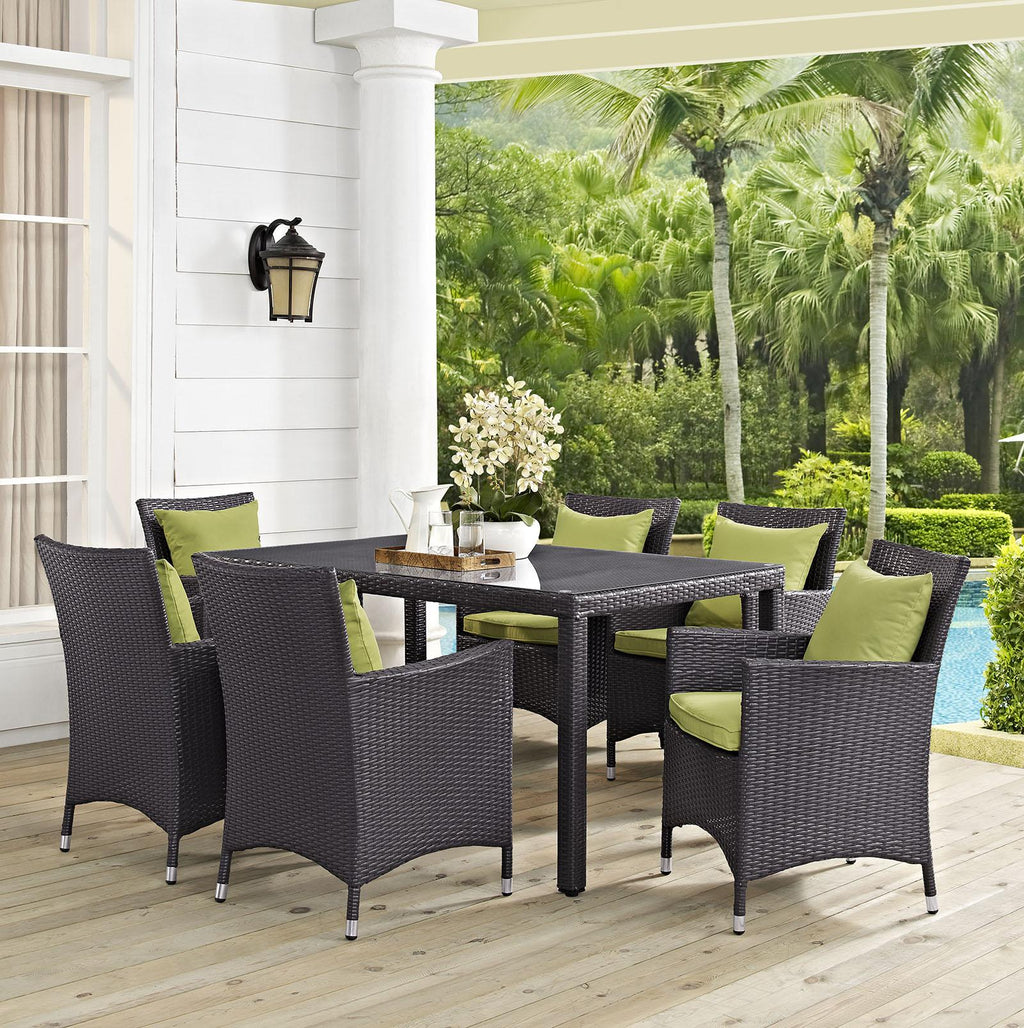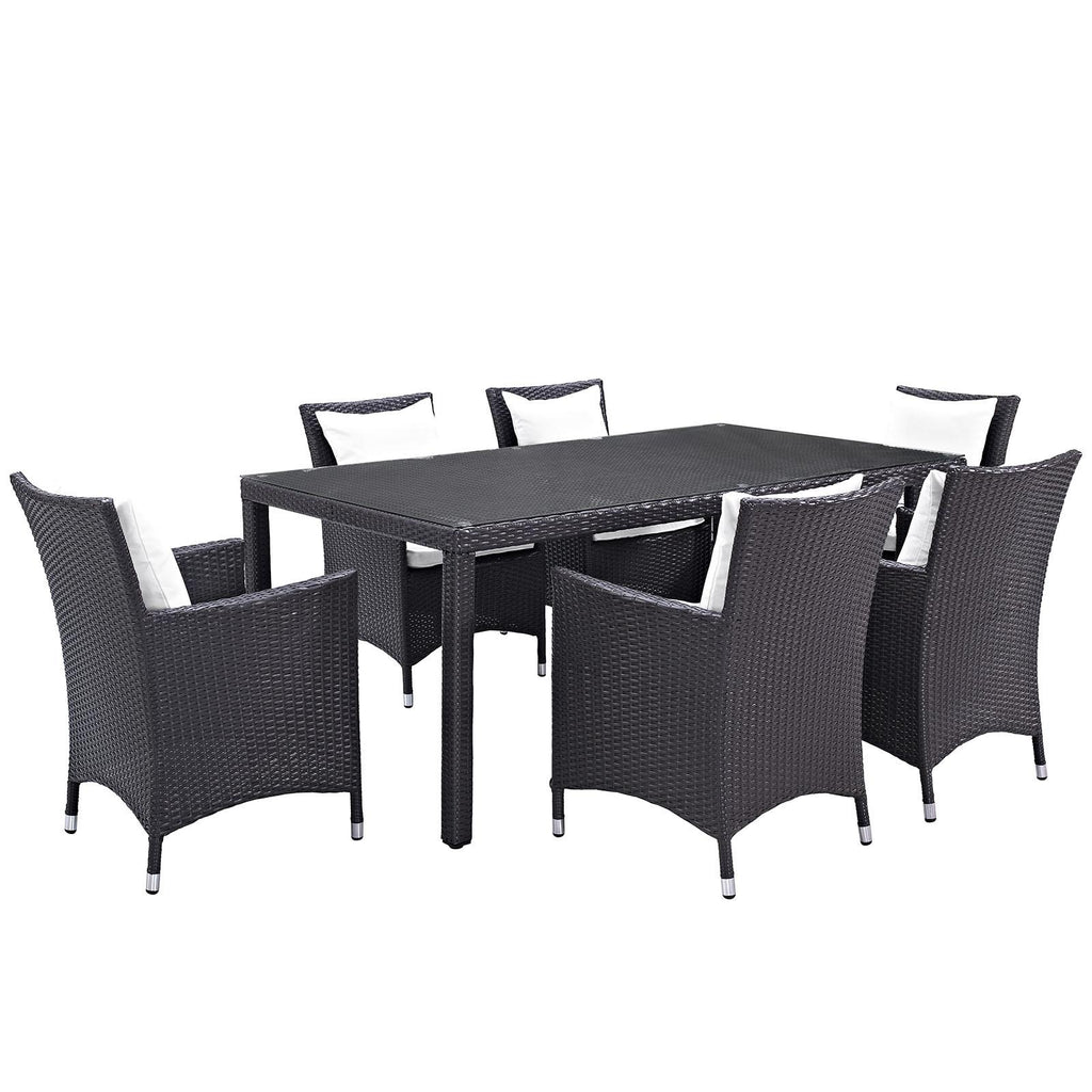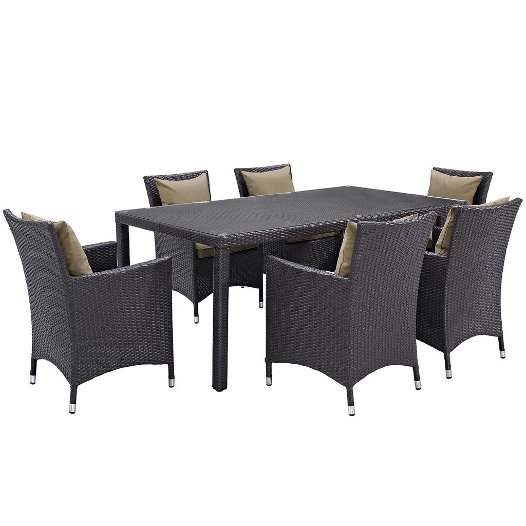 Gather stages of sensitivity with the Convene Outdoor Sectional series. Made with a synthetic rattan weave and a powder-coated aluminum frame, Convene is a versatile outdoor collection that shifts and combines according to the spontaneous needs of the moment. Outfitted with all-weather fabric cushions, leave a positive impression on friends and family while enhancing your patio, backyard, or poolside repast in this series of palpable distinction. This installment of the series is an Outdoor Patio Dining Table and Umbrella Set.