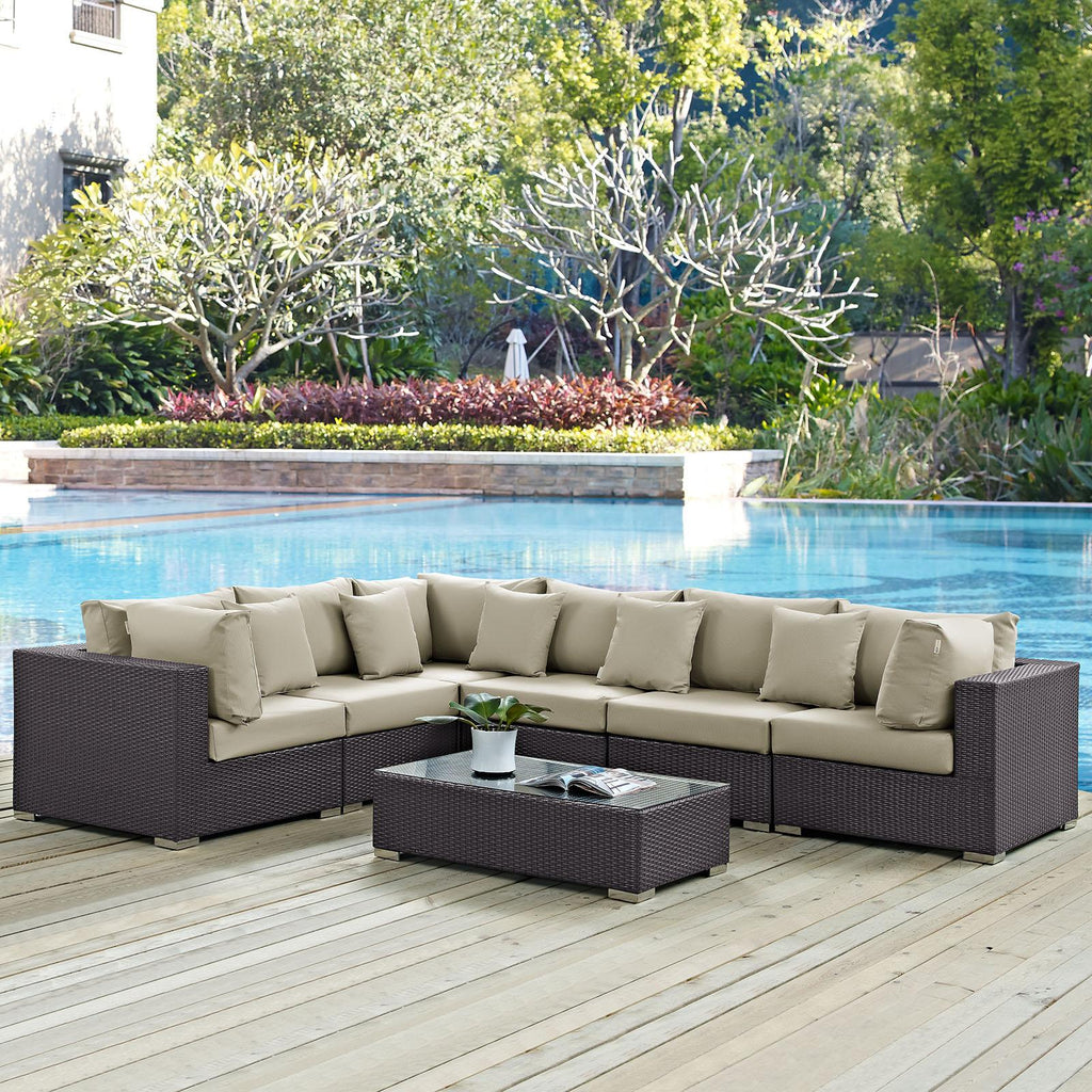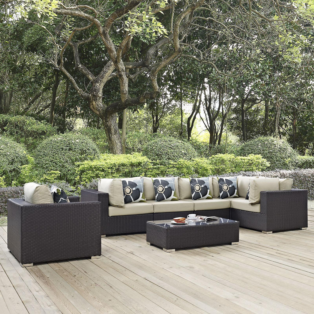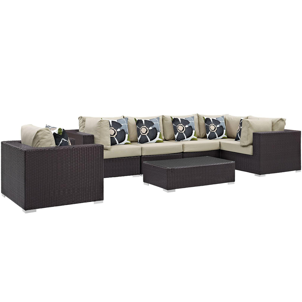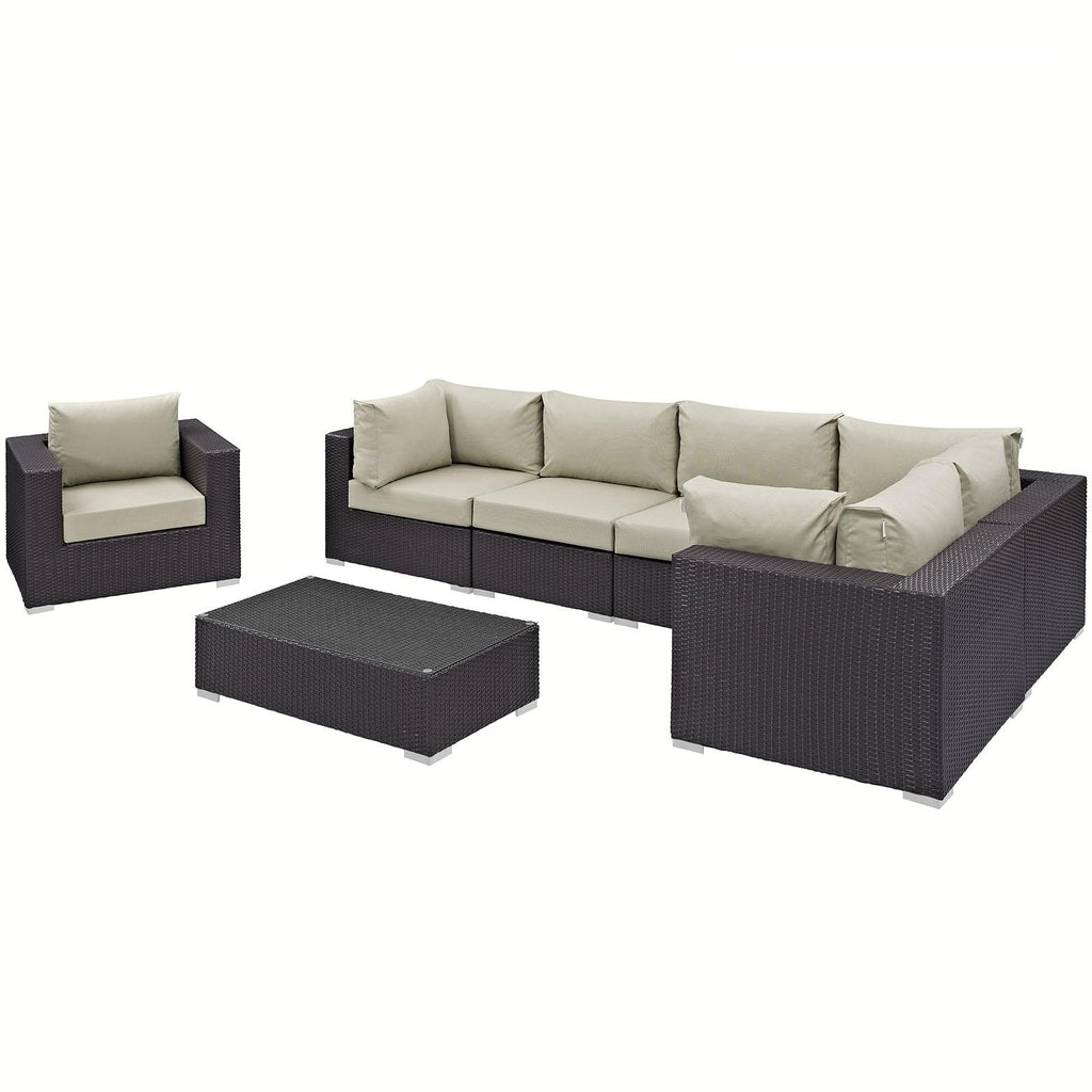 Gather stages of sensitivity with the Convene Outdoor Sectional series. Made with a synthetic rattan weave and a powder-coated aluminum frame, Convene is a versatile outdoor furniture set that shifts and combines according to the spontaneous needs of the moment. Outfitted with all-weather fabric cushions, leave a positive impression on friends and family while enhancing your patio, backyard, or poolside repast in this series of palpable distinction. This installment of the series is an Outdoor Patio Sectional Set.
