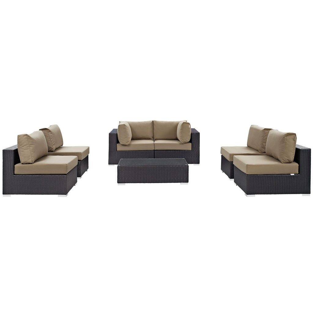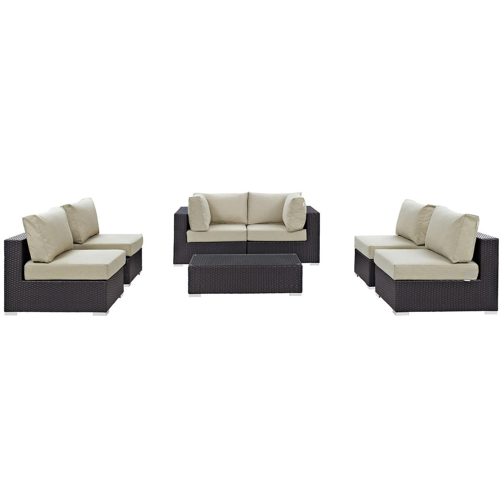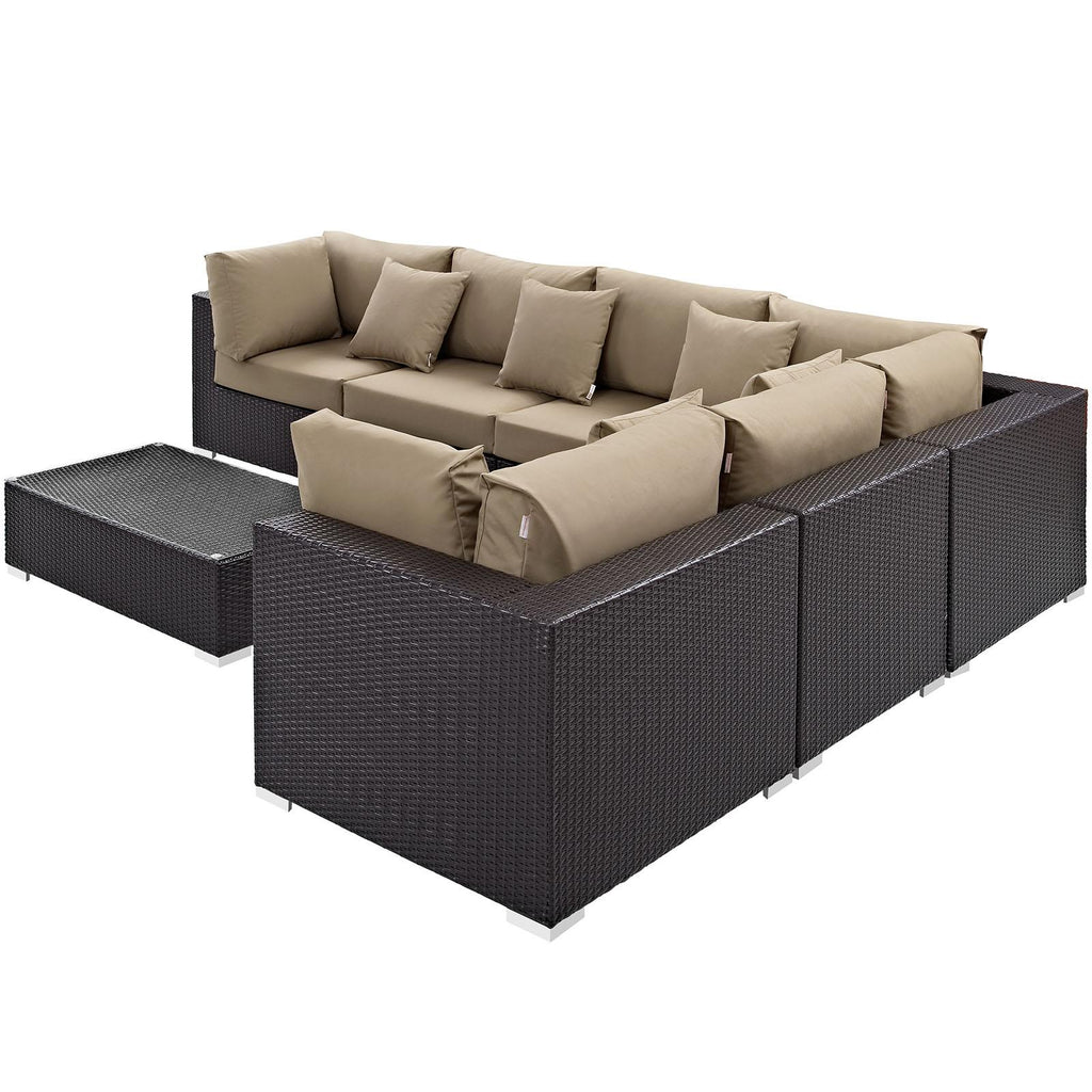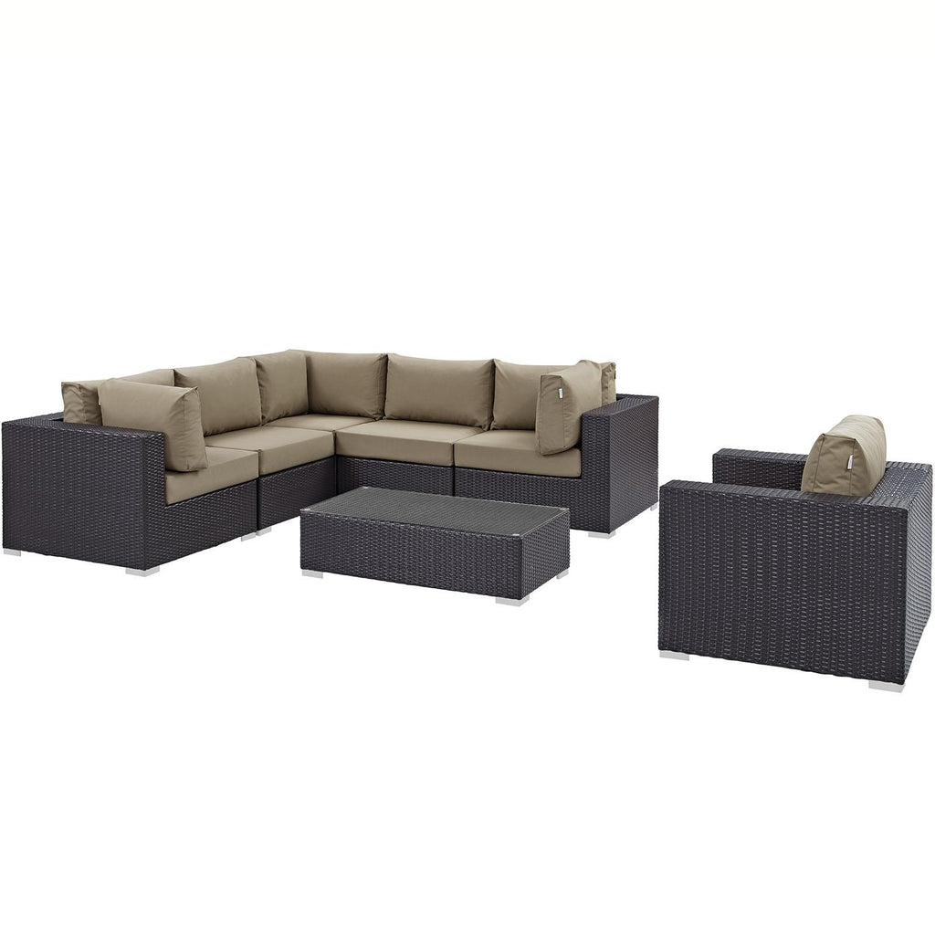 Gather stages of sensitivity with the Convene Outdoor Sectional series. Made with a synthetic rattan weave and a powder-coated aluminum frame, Convene is a versatile outdoor furniture set that shifts and combines according to the spontaneous needs of the moment. Outfitted with all-weather fabric cushions, leave a positive impression on friends and family while enhancing your patio, backyard, or poolside repast in this series of palpable distinction. This installment of the series is an Outdoor Patio Sectional Set.