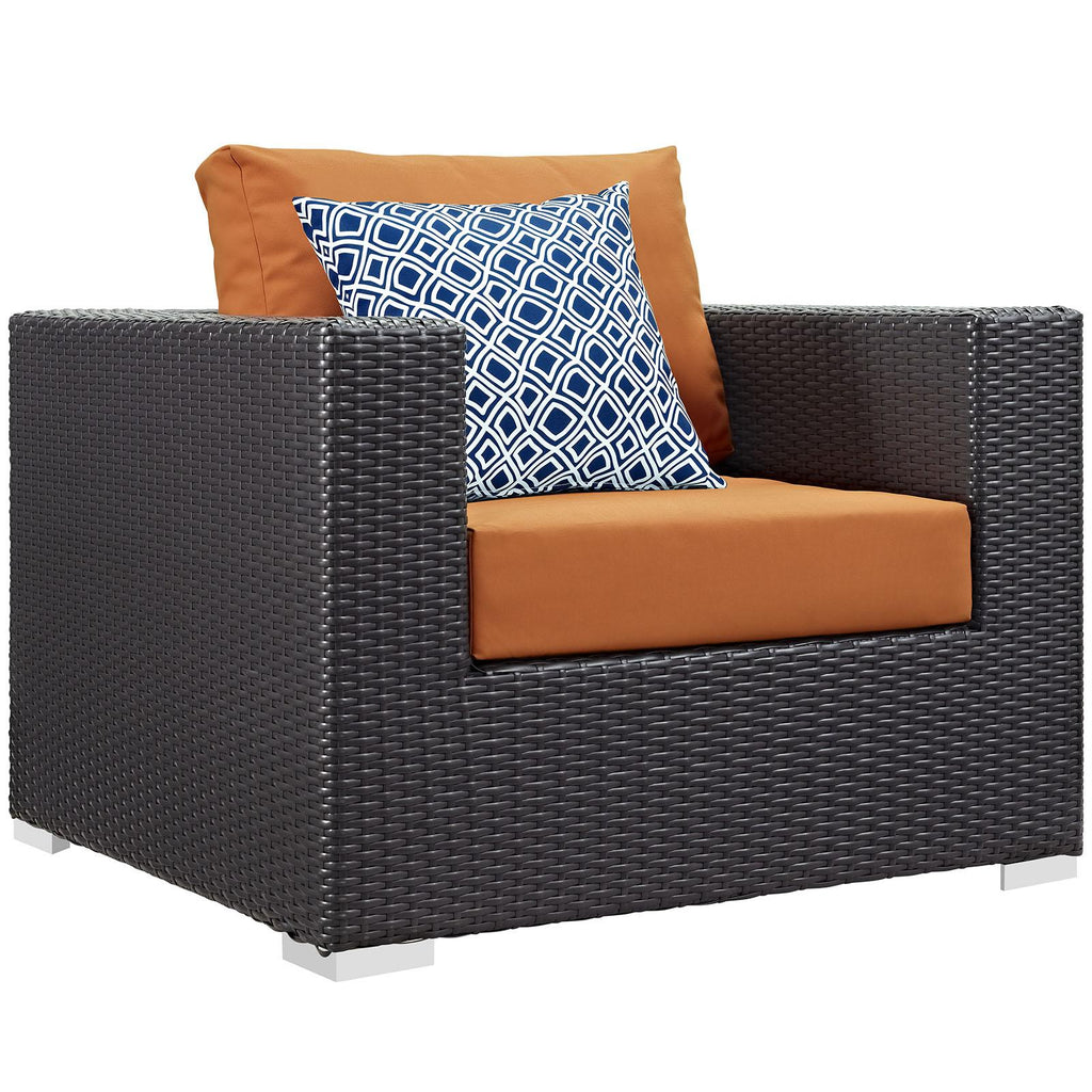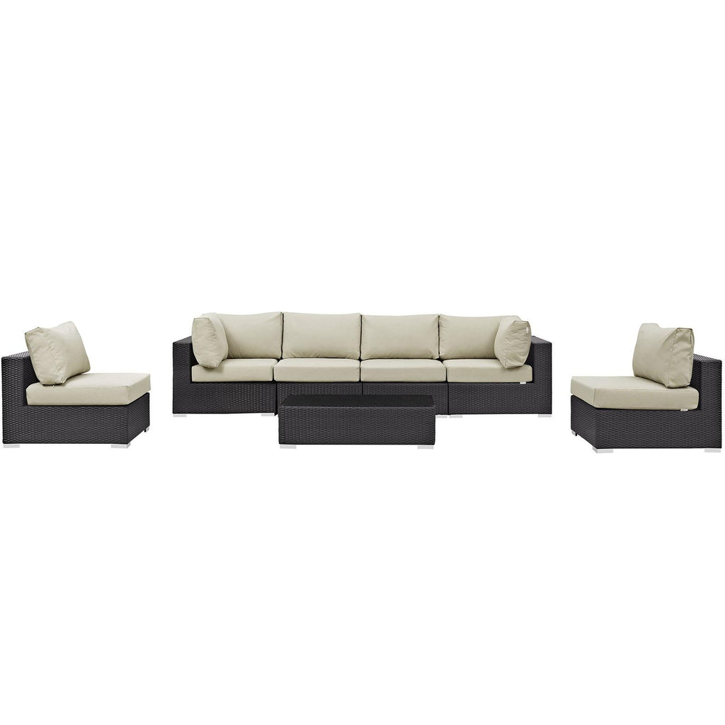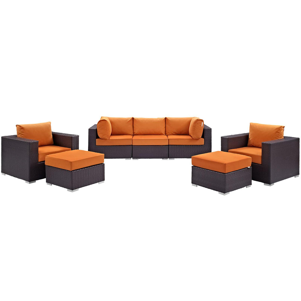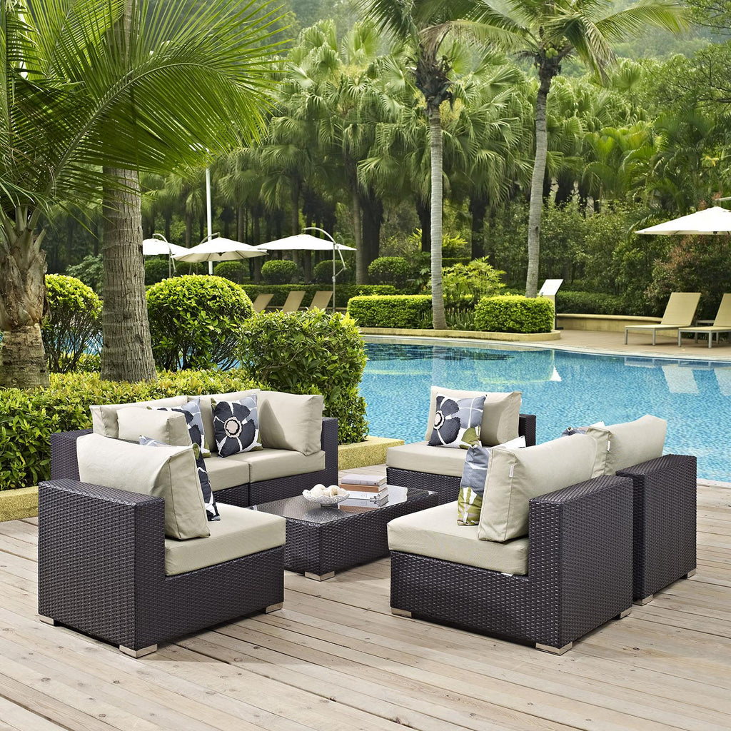 Gather stages of sensitivity with the Convene Outdoor Sectional series. Made with a synthetic rattan weave and a powder-coated aluminum frame, Convene is a versatile outdoor furniture set that shifts and combines according to the spontaneous needs of the moment. Outfitted with all-weather fabric cushions, leave a positive impression on friends and family while enhancing your patio, backyard, or poolside repast in this series of palpable distinction. This installment of the series is an Outdoor Patio Sectional Set.