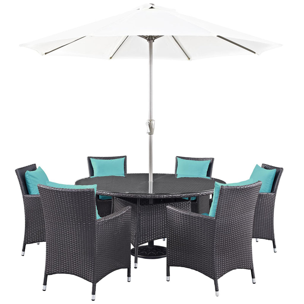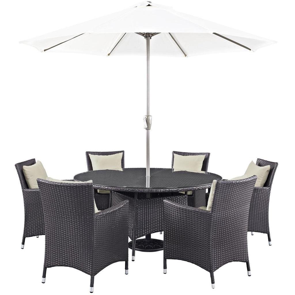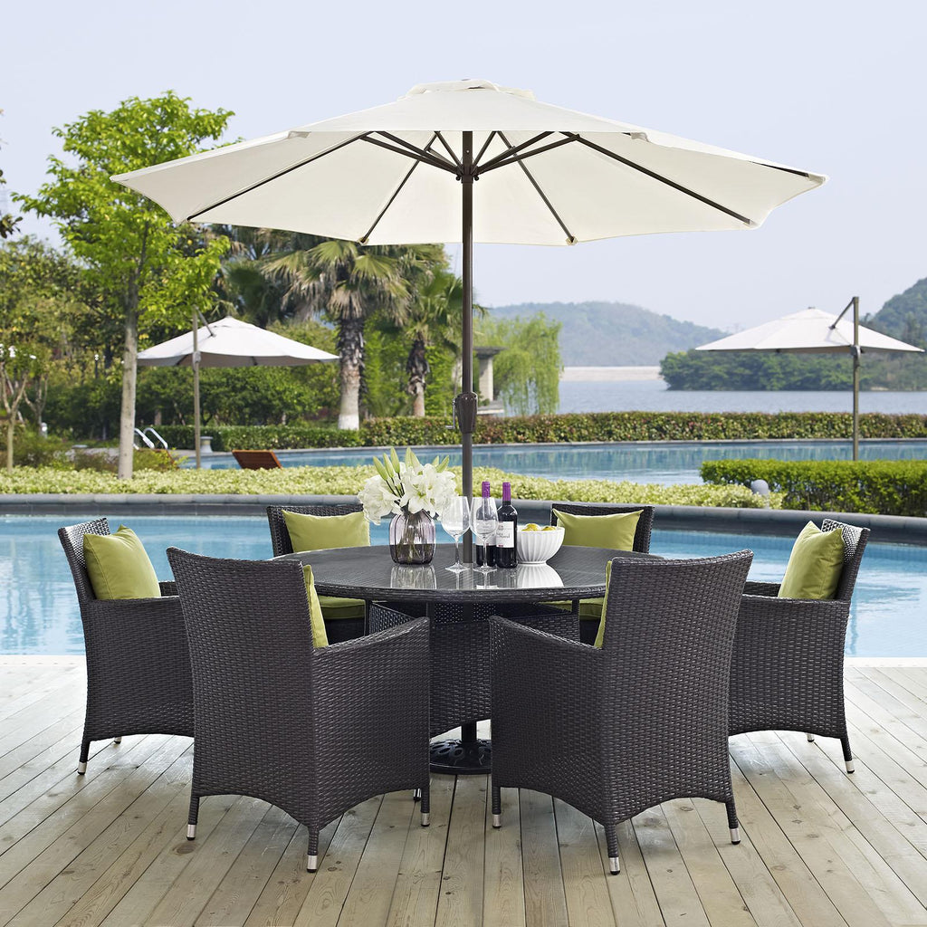 Gather stages of sensitivity with the Convene Outdoor Sectional series. Made with a synthetic rattan weave and a powder-coated aluminum frame, Convene is a versatile outdoor collection that shifts and combines according to the spontaneous needs of the moment. Outfitted with all-weather fabric cushions, leave a positive impression on friends and family while enhancing your patio, backyard, or poolside repast in this series of palpable distinction. This installment of the series is an Outdoor Patio Dining Table and Umbrella Set. Set Includes: One - 300cm - 118" Umbrella and Metal Pole One - Convene 59" Round Dining Table Six - Convene Dining Armchair Synthetic Rattan Weave Powder Coated Aluminum Frame Water & UV Resistant Machine Washable Cushion Covers Ships Pre-Assembled Overall Product Dimensions: 118"L x 118"W x 94.5"H Overall Table Dimensions: 59"L x 59"W x 29"H Overall Armchair Dimensions: 25.5"L x 24.5"W x 34.5"H Seat Dimensions: 19.5"L x 19"W x 16.5"H Armrest Dimensions: 25.5"H Backrest Dimensions: 18"H Armrest Height from Seat: 9"H Base Dimensions: 23"L x 21.5"W