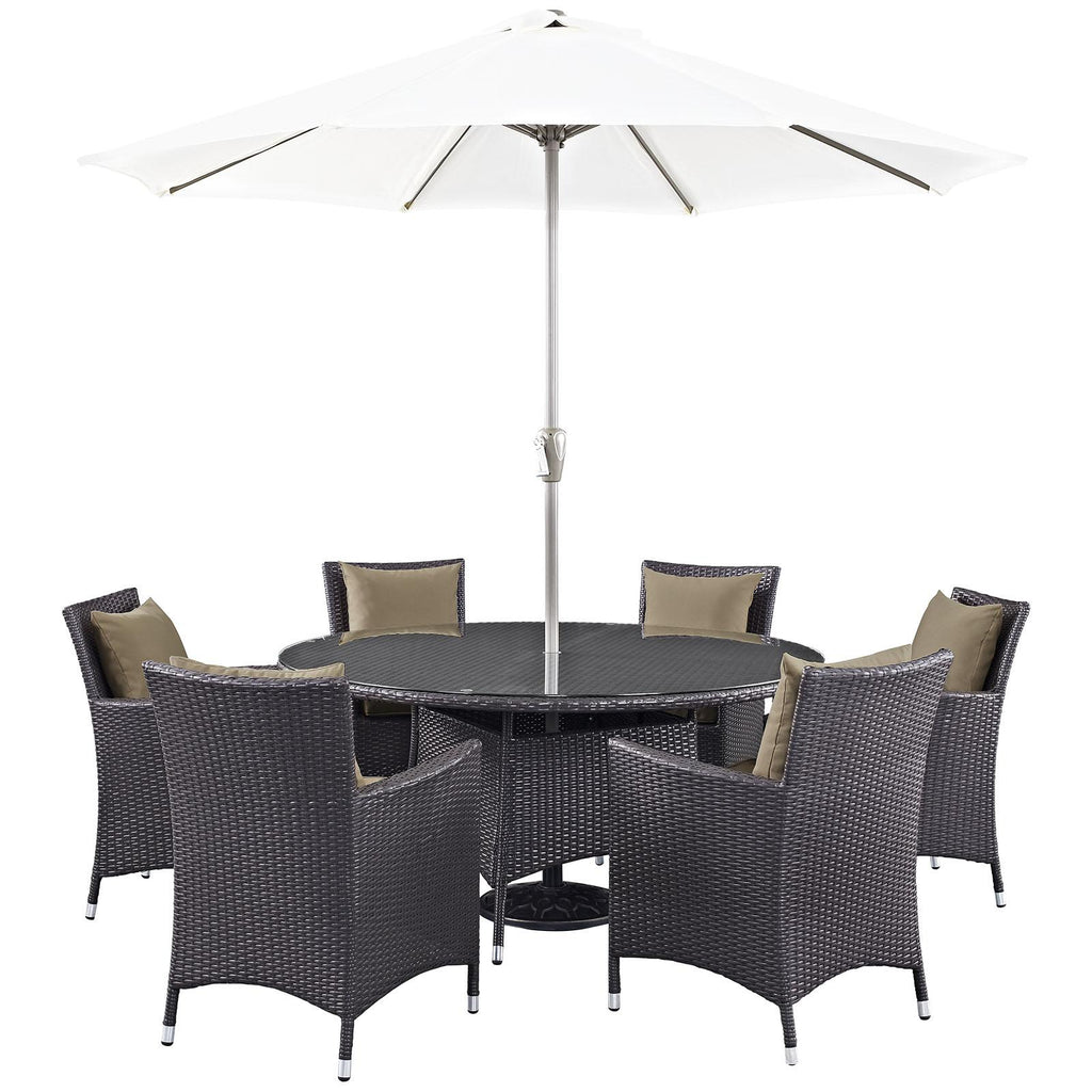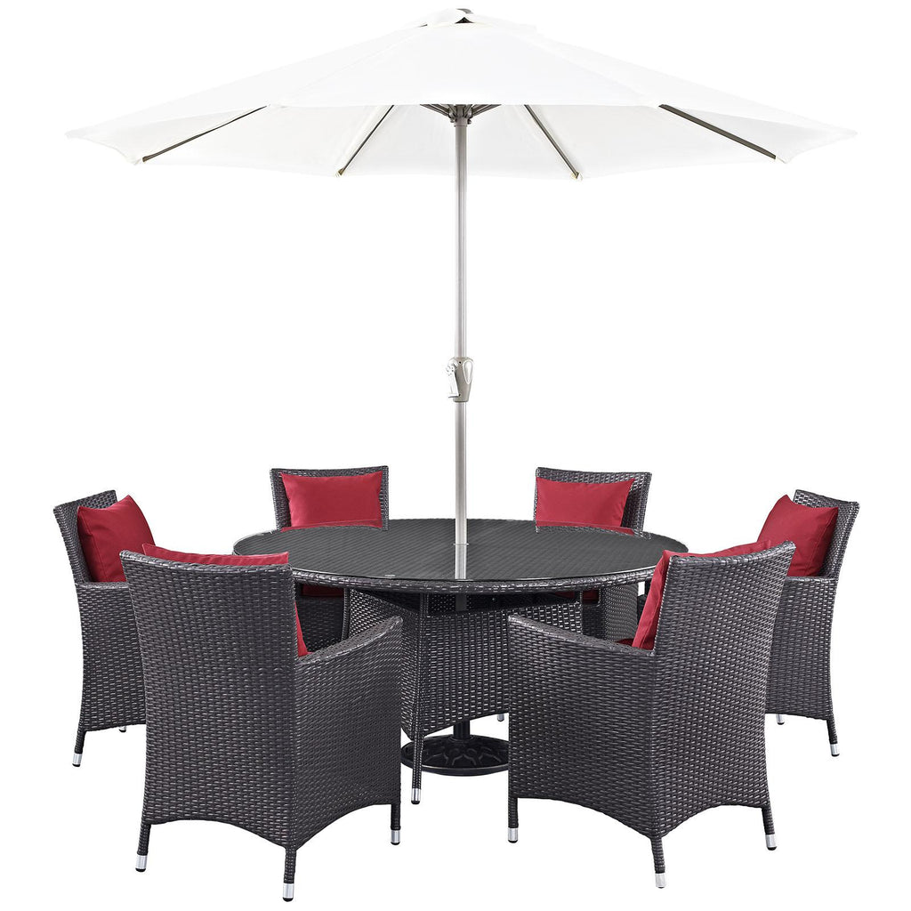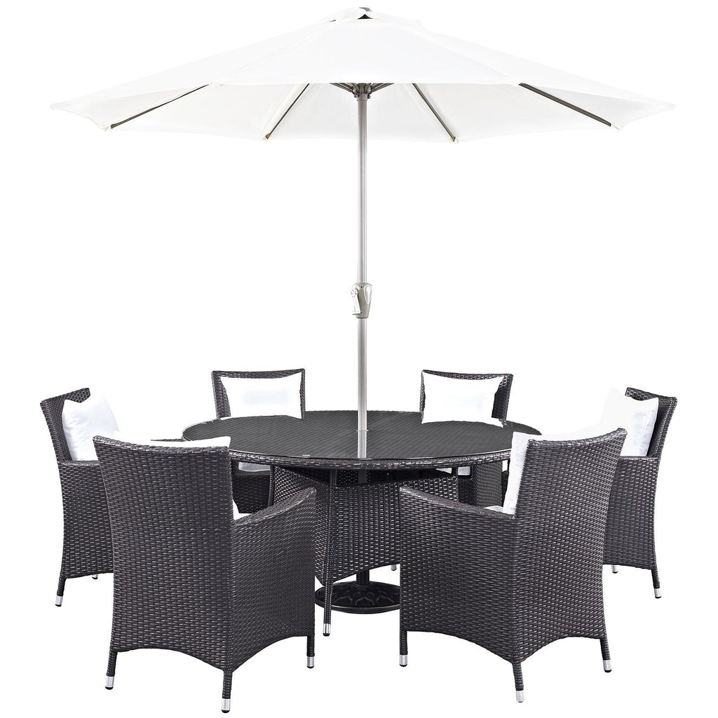 Gather stages of sensitivity with the Convene Outdoor Sectional series. Made with a synthetic rattan weave and a powder-coated aluminum frame, Convene is a versatile outdoor collection that shifts and combines according to the spontaneous needs of the moment. Outfitted with all-weather fabric cushions, leave a positive impression on friends and family while enhancing your patio, backyard, or poolside repast in this series of palpable distinction. This installment of the series is an Outdoor Patio Dining Table and Umbrella Set. Set Includes: One - 300cm - 118" Umbrella and Metal Pole One - Convene 59" Round Dining Table Six - Convene Dining Armchair Synthetic Rattan Weave Powder Coated Aluminum Frame Water & UV Resistant Machine Washable Cushion Covers Ships Pre-Assembled Overall Product Dimensions: 118"L x 118"W x 94.5"H Overall Table Dimensions: 59"L x 59"W x 29"H Overall Armchair Dimensions: 25.5"L x 24.5"W x 34.5"H Seat Dimensions: 19.5"L x 19"W x 16.5"H Armrest Dimensions: 25.5"H Backrest Dimensions: 18"H Armrest Height from Seat: 9"H Base Dimensions: 23"L x 21.5"W