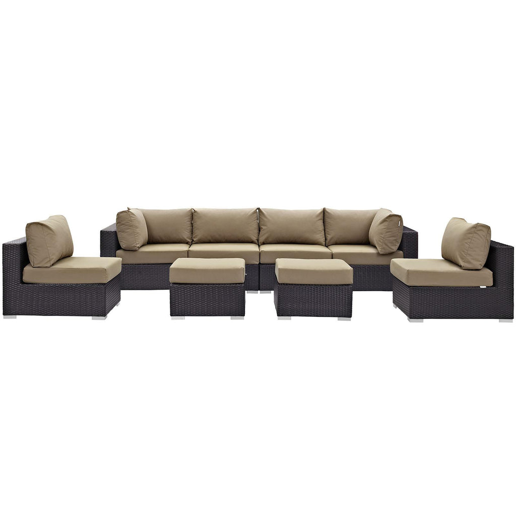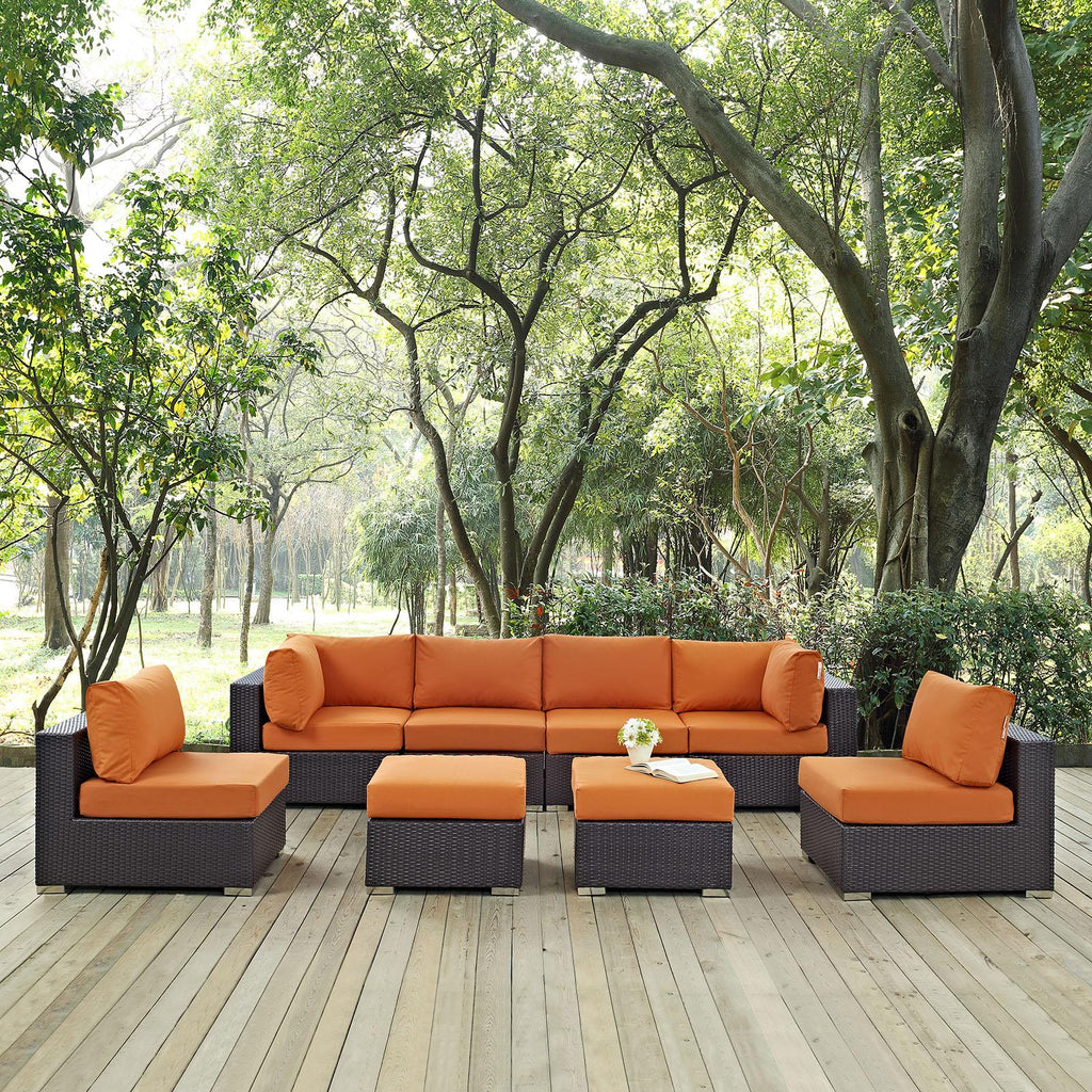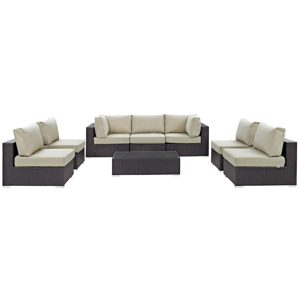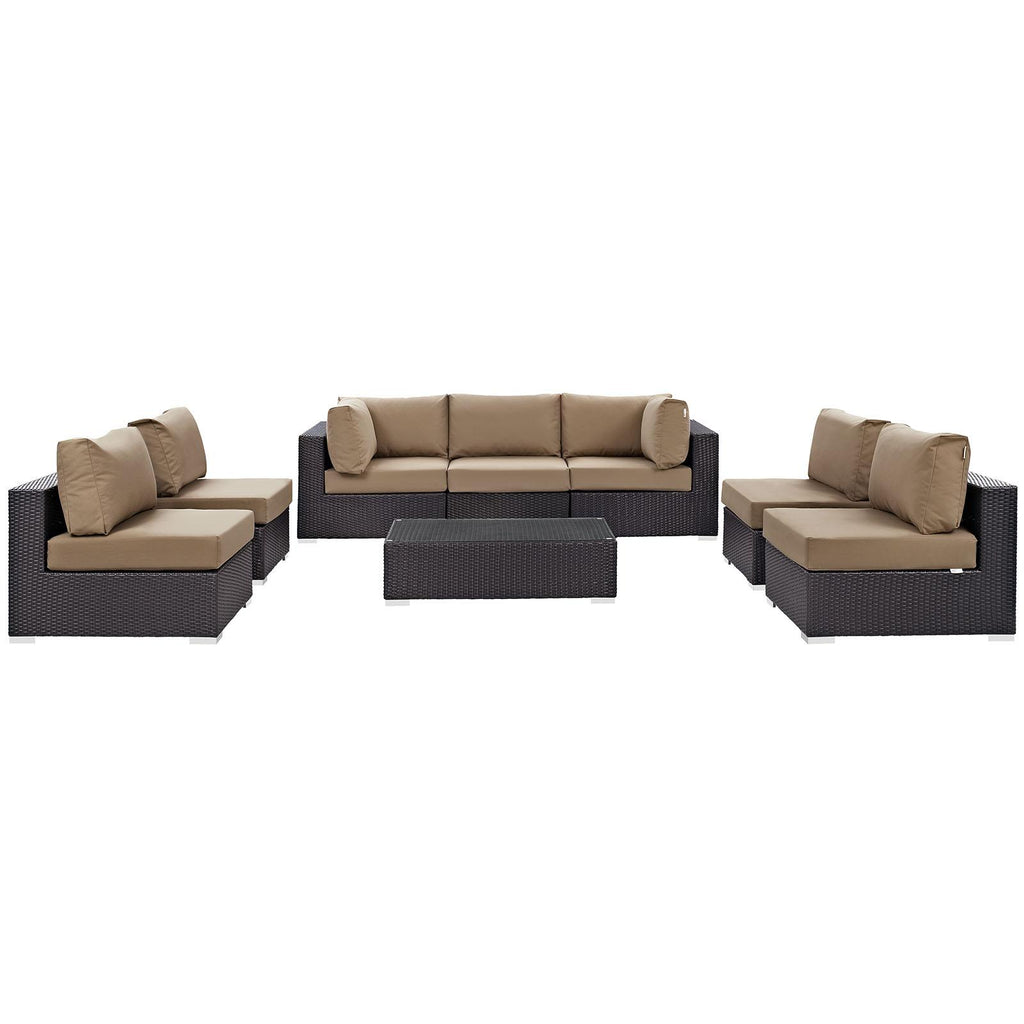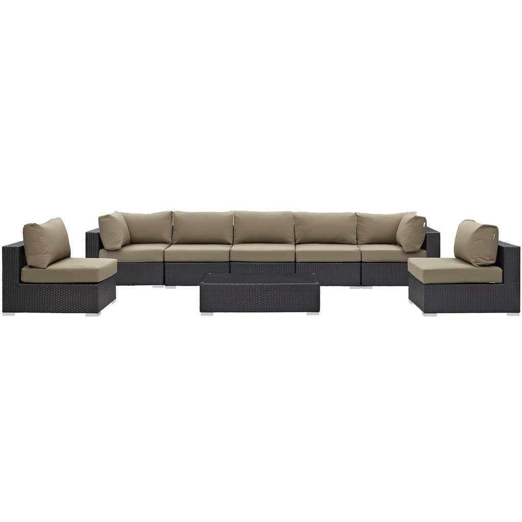 Gather stages of sensitivity with the Convene Outdoor Sectional series. Made with a synthetic rattan weave and a powder-coated aluminum frame, Convene is a versatile outdoor furniture set that shifts and combines according to the spontaneous needs of the moment. Outfitted with all-weather fabric cushions, leave a positive impression on friends and family while enhancing your patio, backyard, or poolside repast in this series of palpable distinction. This installment of the series is an Outdoor Patio Sectional Sofa Set.
