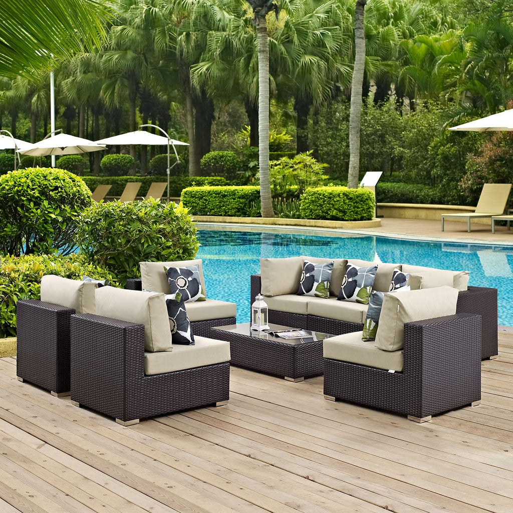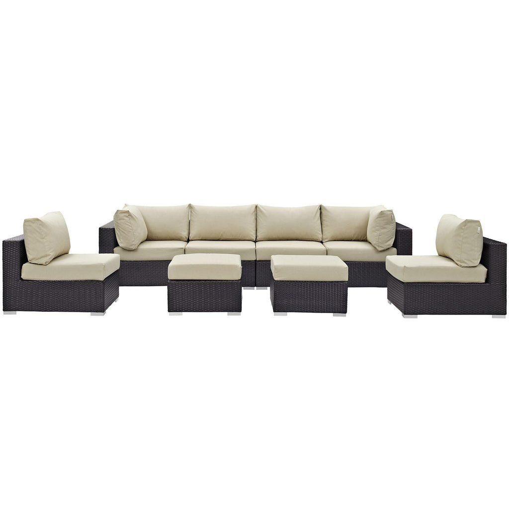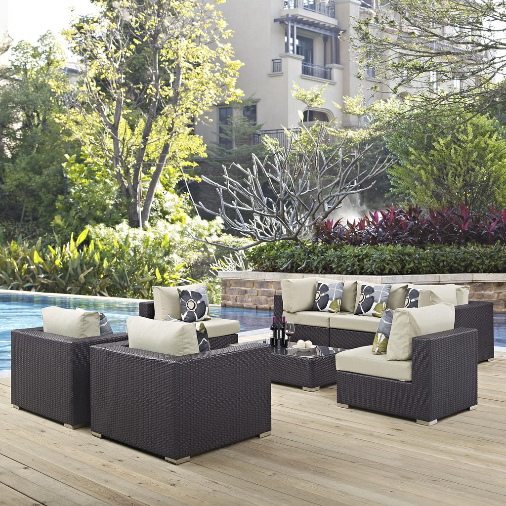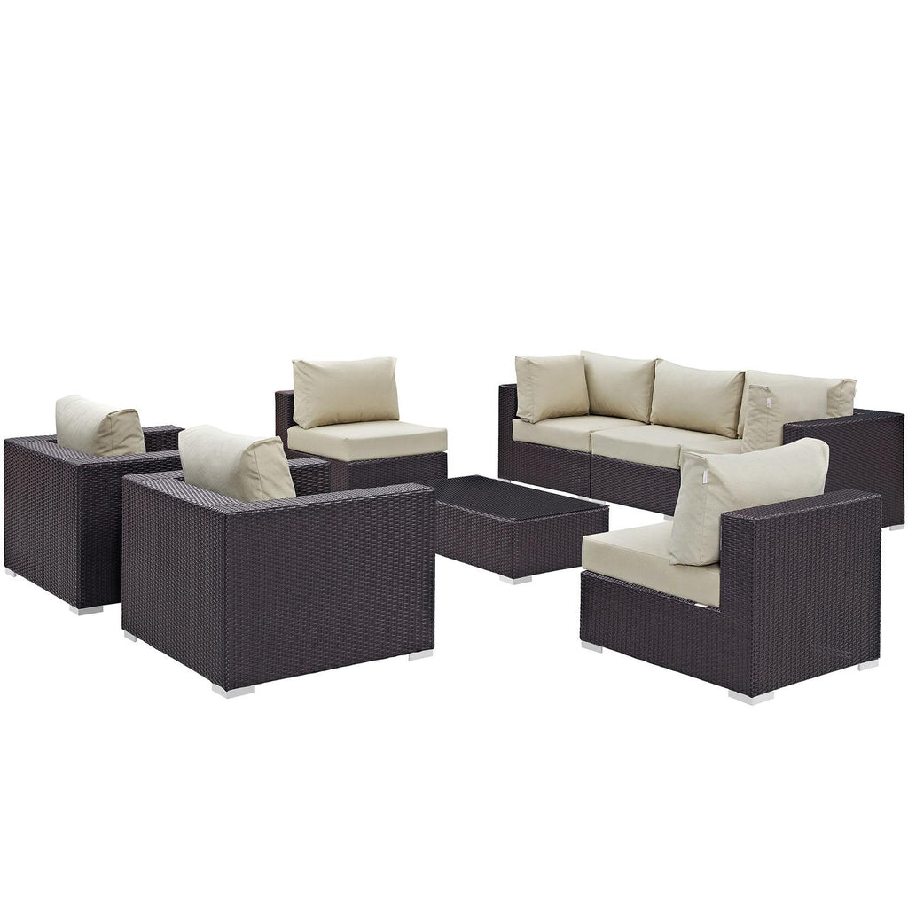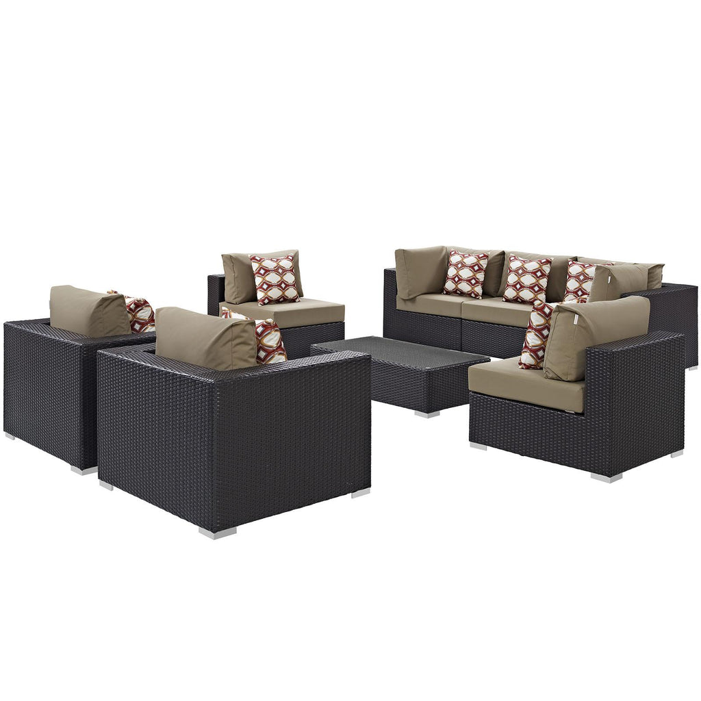 Gather stages of sensitivity with the Convene Outdoor Sectional series. Made with a synthetic rattan weave and a powder-coated aluminum frame, Convene is a versatile outdoor furniture set that shifts and combines according to the spontaneous needs of the moment. Outfitted with all-weather fabric cushions, leave a positive impression on friends and family while enhancing your patio, backyard, or poolside repast in this series of palpable distinction. This installment of the series is an Outdoor Patio Sectional Sofa Set.