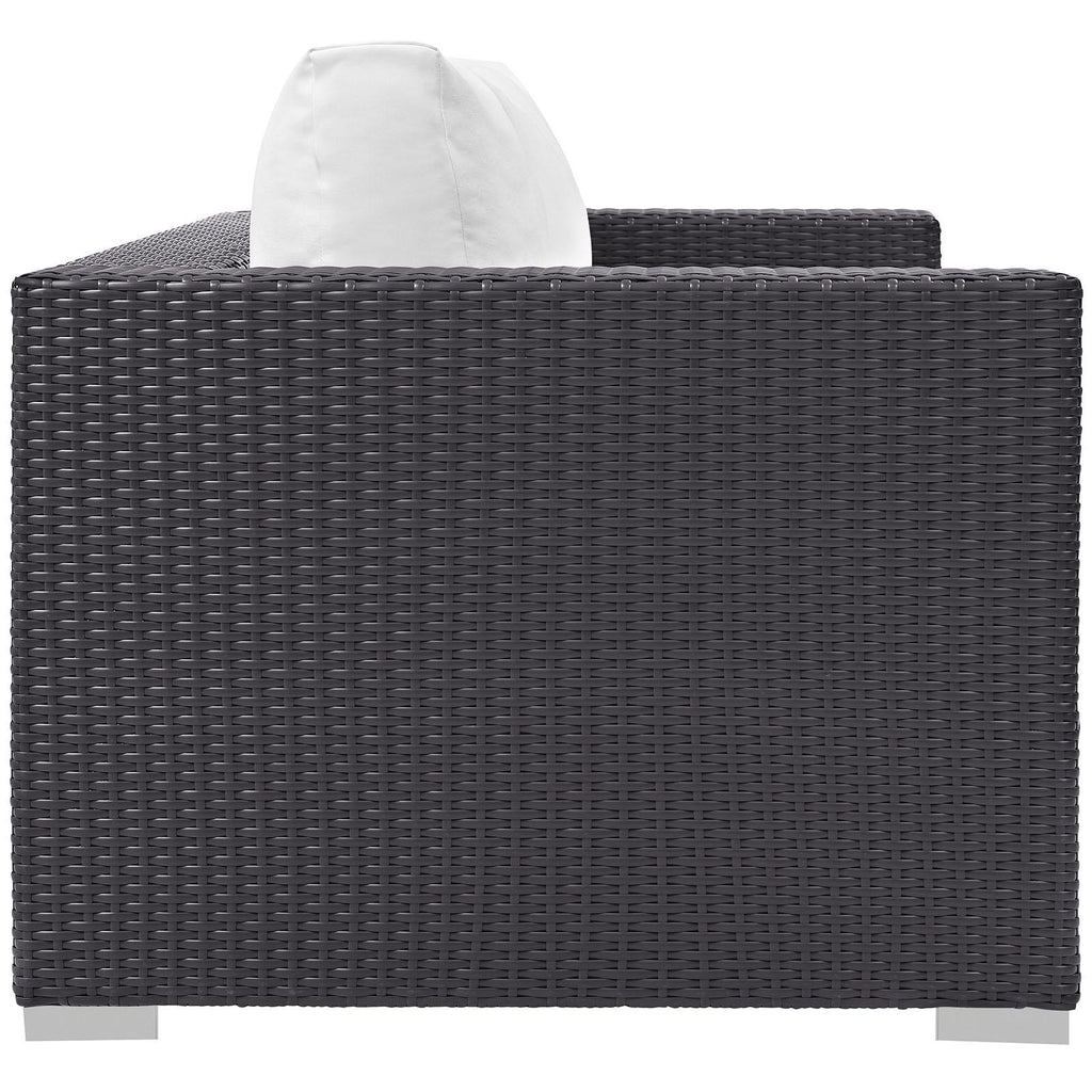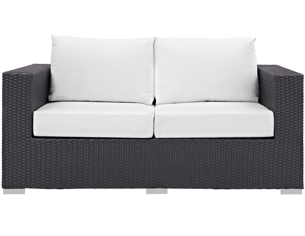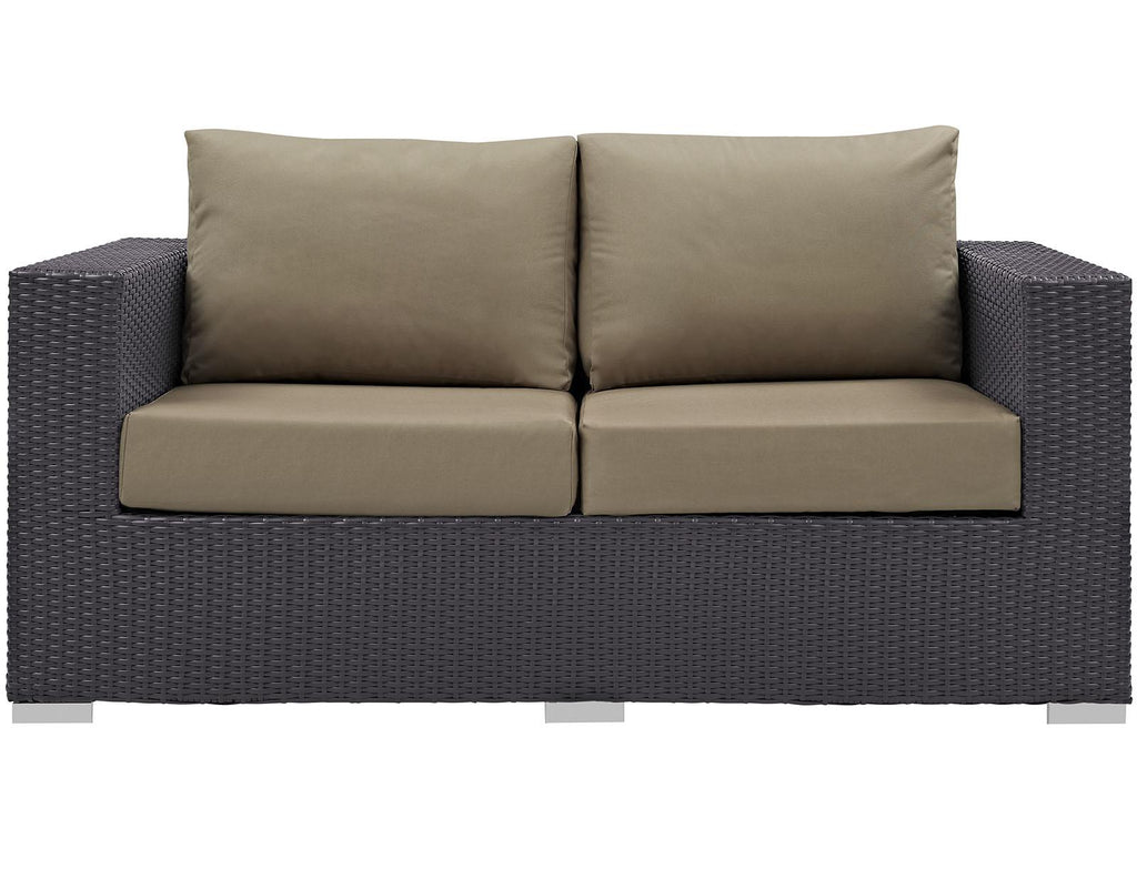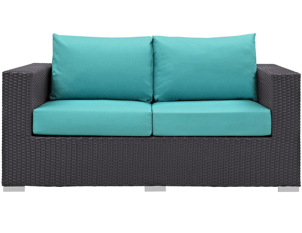 Gather stages of sensitivity with the Convene Outdoor Sectional series. Made with a synthetic rattan weave and a powder-coated aluminum frame, Convene is a versatile patio loveseat from an outdoor collection that shifts and combines according to the spontaneous needs of the moment. Outfitted with all-weather fabric cushions, Convene Rattan Loveseat leaves a positive impression on friends and family while enhancing your patio, backyard, or poolside repast in this series of palpable distinction. This installment of the series is an Outdoor Patio Loveseat.