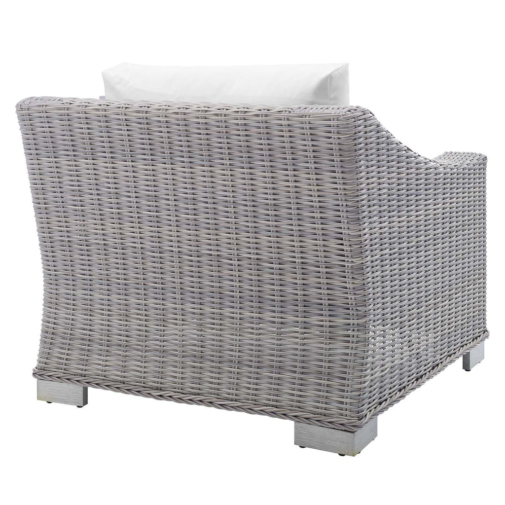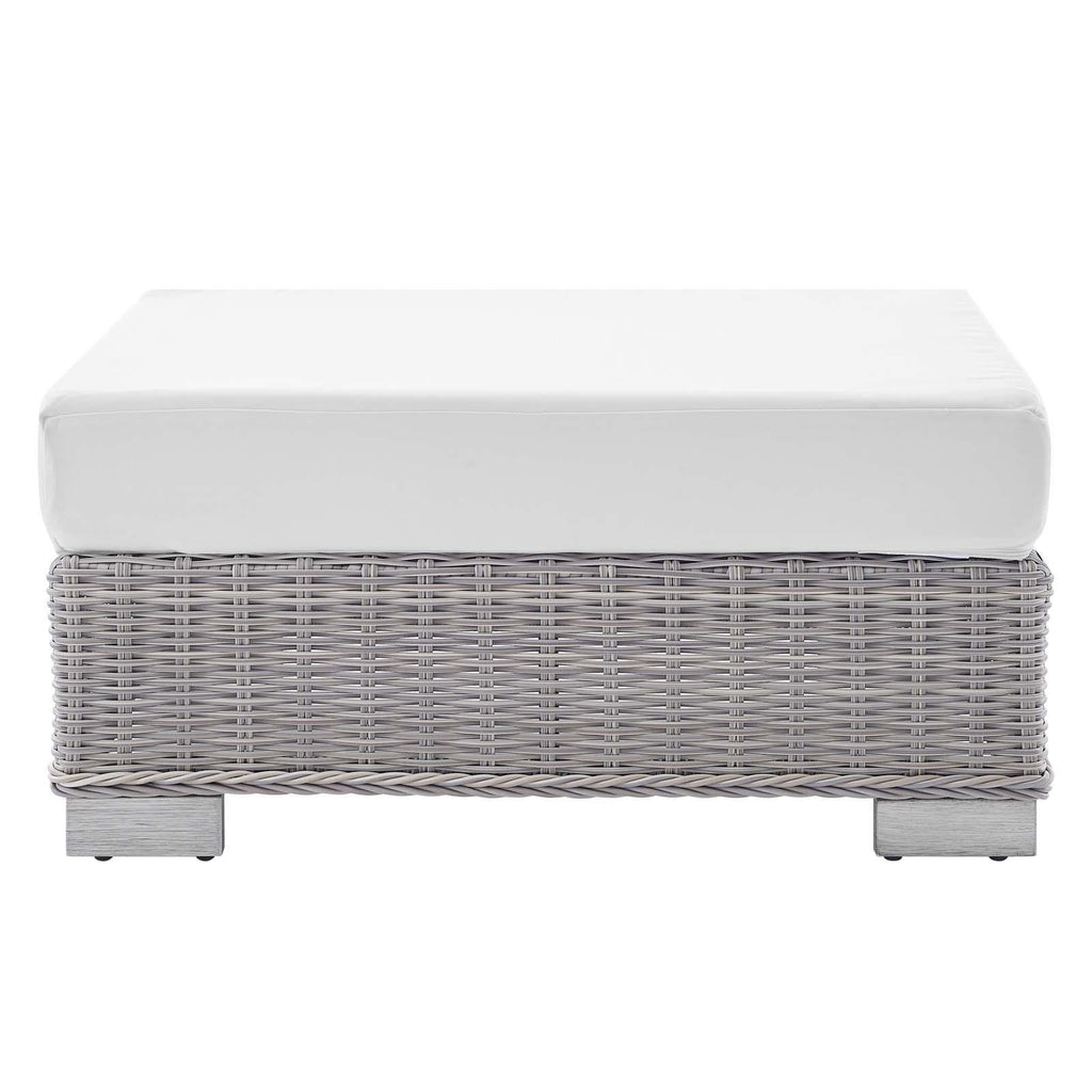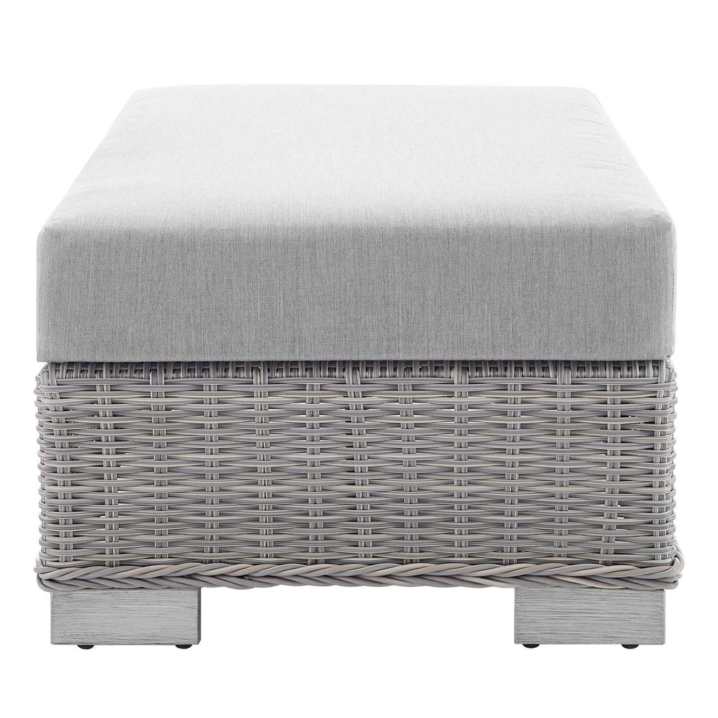 Enjoy fresh air and alfresco relaxation with the Conway Outdoor Patio Sunbrella� Wicker Rattan 2-Piece Armchair and Ottoman Set. Wrapped in UV-resistant light gray synthetic wicker rattan, this patio chair and ottoman set boasts organic texture and a neutral hue that brings a calming presence to your outdoor space. The frame of this outdoor chair and outdoor ottoman are crafted with durable powder-coated aluminum and rest on L-shaped legs with plastic foot glides. Thick foam padded cushions covered with washable water-resistant Sunbrella� fabric covers offer a comfortable seat and affix securely to the lounge chair with cord tension attachments. Trending aesthetics and a classic design define this outdoor patio furniture collection making it a beautiful addition to any outdoor space including the backyard, patio, porch, balcony, or poolside. Assembly required. Patio Chair Weight Capacity: 300 lbs. Patio Ottoman Weight Capacity: 300 lbs. Set Includes: One - Conway Sunbrella� Armchair One - Conway Sunbrella� Ottoman Outdoor Patio Chair and Ottoman Water and UV Resistant Light Gray Synthetic Rattan Powder-Coated Aluminum Frame Washable Sunbrella� Cushion Covers Non-Marking Foot Glides Each Piece Weight Capacity: 300 lbs. Overall Product Dimensions: 58"L x 32"W x 28"H Overall Armchair Dimensions: 36"L x 32"W x 28"H Seat Dimensions: 22.5"L x 22"W x 15"H Backrest Dimensions: 10"L x 22"W x 12"H Armrest Dimensions: 22.5"L x 5"W x 6"H Base Dimensions: 33.5"L x 31.5"W Overall Ottoman Dimensions: 22"L x 32"W x 15"H Cushion Thichkness: 5"H Leg Dimensions: 2"H