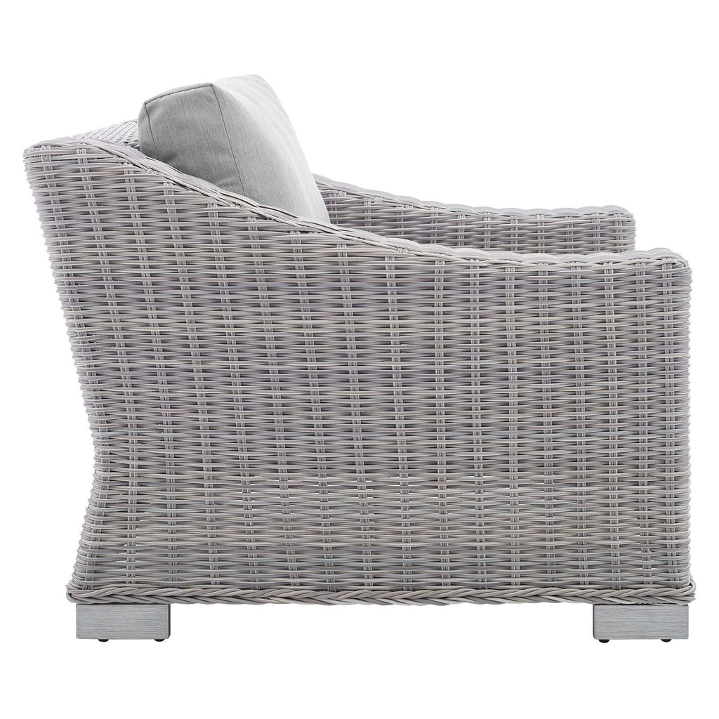 Enjoy fresh air and alfresco relaxation with the Conway Outdoor Patio Sunbrella� Wicker Rattan 4-Piece Furniture Set. Wrapped in UV-resistant light gray synthetic wicker rattan, this patio furniture set boasts organic texture and a neutral hue that brings a calming presence to your outdoor space. The frame of this outdoor furniture set and outdoor ottoman are crafted with durable powder-coated aluminum and rest on L-shaped legs with plastic foot glides. Thick foam padded cushions covered with washable water-resistant Sunbrella� covers offer a comfortable seat and affix securely to the lounge chair with cord tension attachments. Trending aesthetics and a classic design define this outdoor patio furniture collection making it a beautiful addition to any outdoor space including the backyard, patio, porch, balcony, or poolside. Assembly required. Set Includes: Sofa, Loveseat, Armchair, Coffee Table