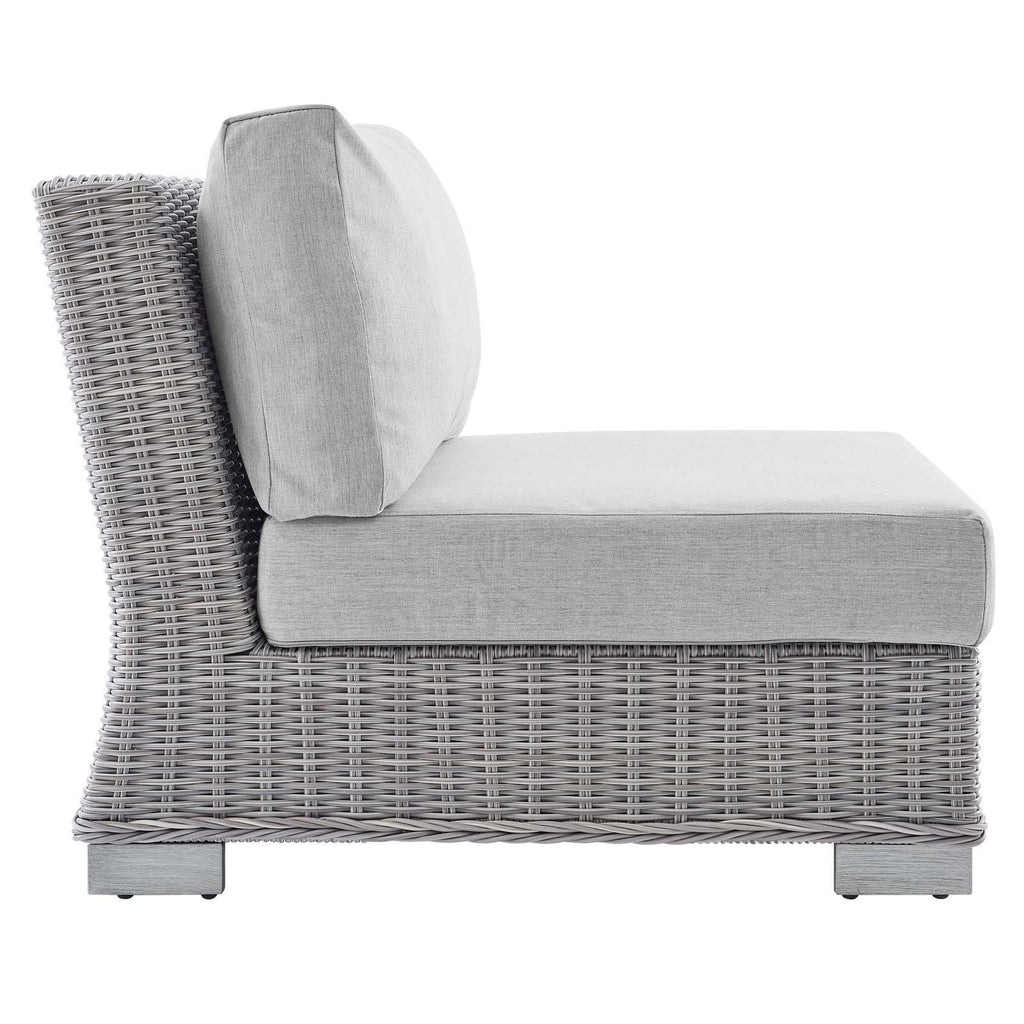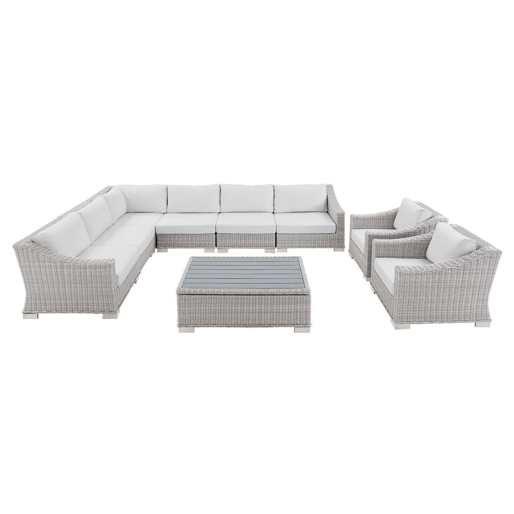 Enjoy fresh air and alfresco relaxation with the Conway Outdoor Patio Sunbrella� Wicker Rattan 9-Piece Sectional Sofa Furniture Set. Wrapped in UV-resistant light gray synthetic wicker rattan, this outdoor sectional sofa boasts organic texture and a neutral hue that brings a calming presence to your outdoor area with a modular design that adapts to variety of configurations to suit your space. The frames of this outdoor sofa set are crafted with durable powder-coated aluminum and rest on L-shaped legs with plastic foot glides. Thick foam padded cushions covered with washable water-resistant Sunbrella� covers offer a comfortable seat and affix securely to the patio sofa with cord tension attachments. Trending aesthetics and a classic design define this outdoor patio furniture collection making it a beautiful addition to any outdoor space including the backyard, patio, porch, balcony, or poolside. Assembly required. Set Includes: Corner Chair, Left-Arm Chair, Right-Arm Chair, 3 Armless Chairs, 2 Armchairs, Coffee Table
