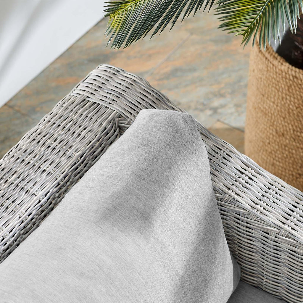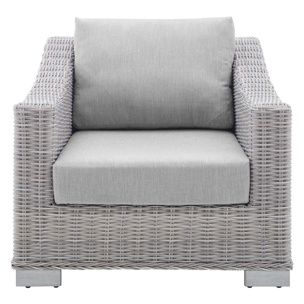 Enjoy fresh air and alfresco relaxation with the Conway Outdoor Patio Wicker Rattan Armchair. Wrapped in UV-resistant light gray synthetic wicker rattan, this patio chair boasts organic texture and a neutral hue that brings a calming presence to your outdoor space. The frame of this outdoor chair is crafted with durable powder-coated aluminum and rests on L-shaped legs with plastic foot glides. Thick foam padded cushions covered with washable water-resistant Sunbrella� fabric covers offer a comfortable seat and affix securely to the lounge chair with cord tension attachments. Trending aesthetics and a classic design define this outdoor patio furniture collection making it a beautiful addition to any outdoor space including the backyard, patio, porch, balcony, or poolside. Assembly required. Patio Chair Weight Capacity: 300 lbs. Set Includes: One - Conway Sunbrella� Armchair Outdoor Patio Chair Water and UV Resistant Light Gray Synthetic Rattan Powder-Coated Aluminum Frame Washable Sunbrella� Cushion Covers Non-Marking Foot Glides Chair Weight Capacity: 300 lbs. Overall Product Dimensions: 36"L x 32"W x 28"H Seat Dimensions: 22.5"L x 22"W x 15"H Backrest Dimensions: 10"L x 22"W x 12"H Armrest Dimensions: 22.5"L x 5"W x 6"H Base Dimensions: 33.5"L x 31.5"W