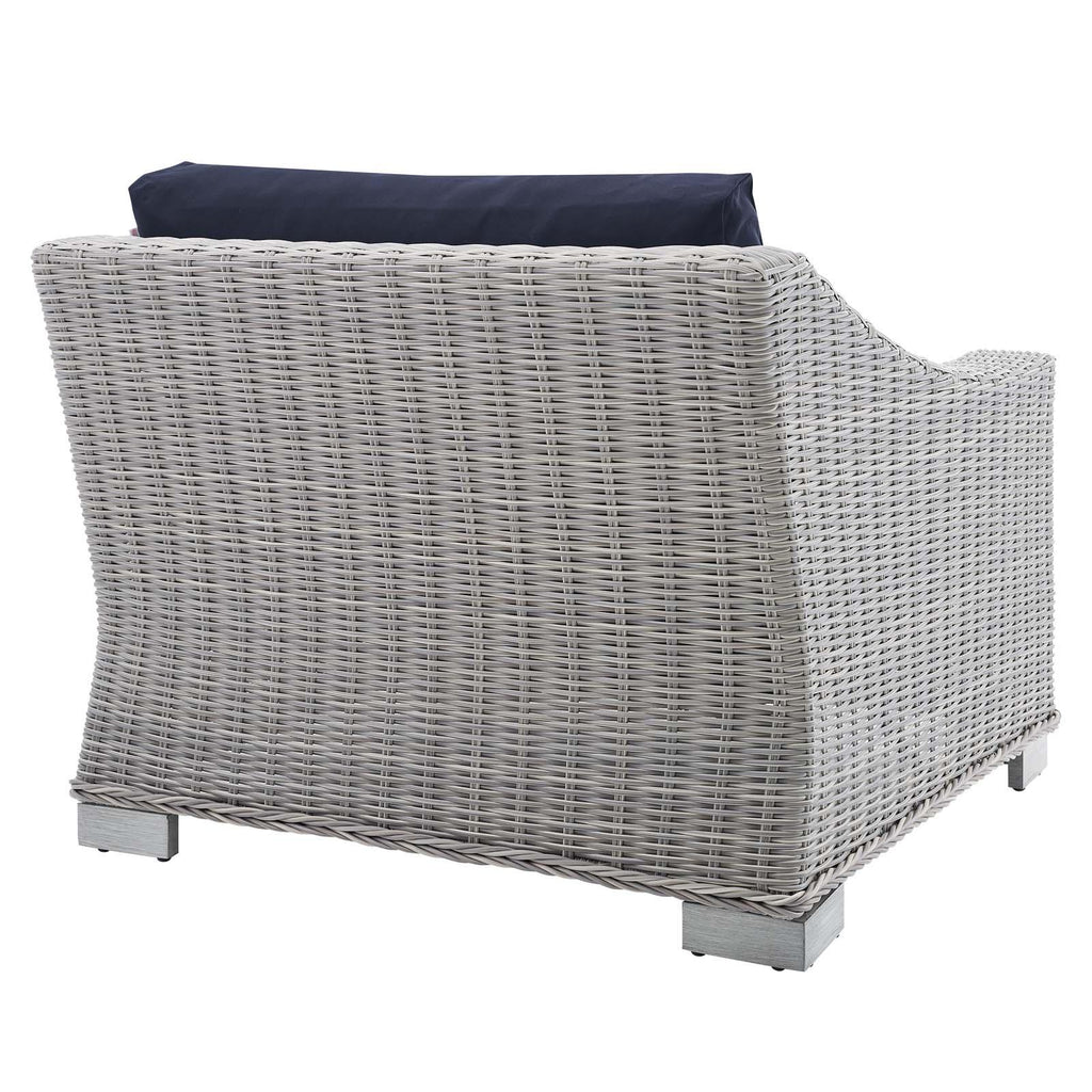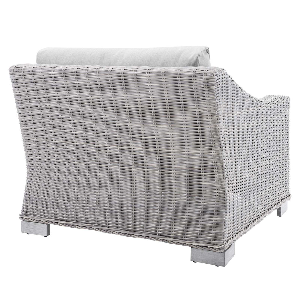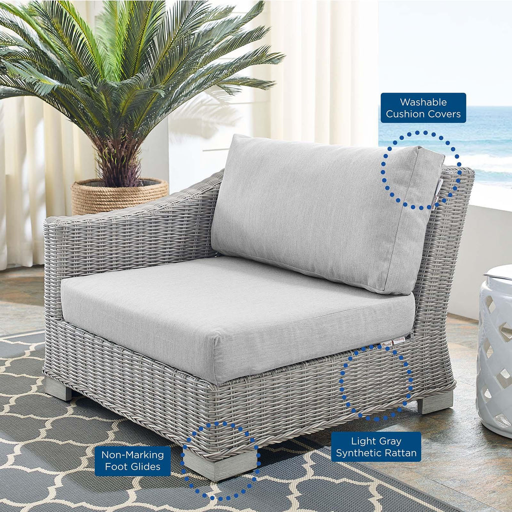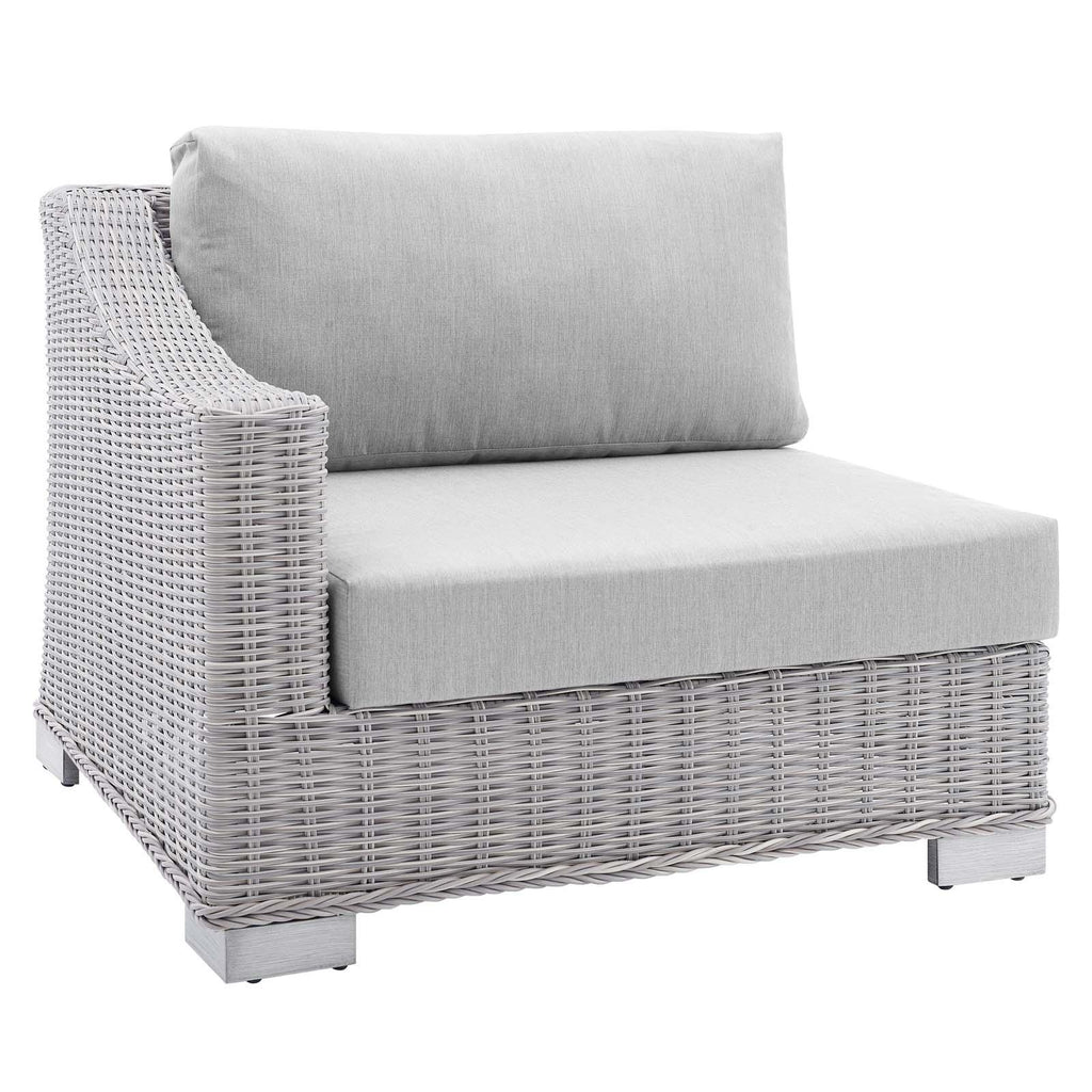 Enjoy fresh air and alfresco relaxation with the Conway Outdoor Patio Wicker Rattan Left-Arm Sectional Sofa Chair. Wrapped in UV-resistant light gray synthetic wicker rattan, this sectional sofa piece boasts organic texture and a neutral hue that brings a calming presence to your outdoor area with a modular design that adapts to variety of configurations to suit your space. The frame of this outdoor chair is crafted with durable powder-coated aluminum and rests on L-shaped legs with plastic foot glides. Thick foam padded cushions covered with washable water-resistant Sunbrella� fabric covers offer a comfortable seat and affix securely to the left-arm chair with cord tension attachments. Trending aesthetics and a classic design define this outdoor patio furniture collection making it a beautiful addition to any outdoor space including the backyard, patio, porch, balcony, or poolside. Assembly required. Patio Chair Weight Capacity: 300 lbs.
