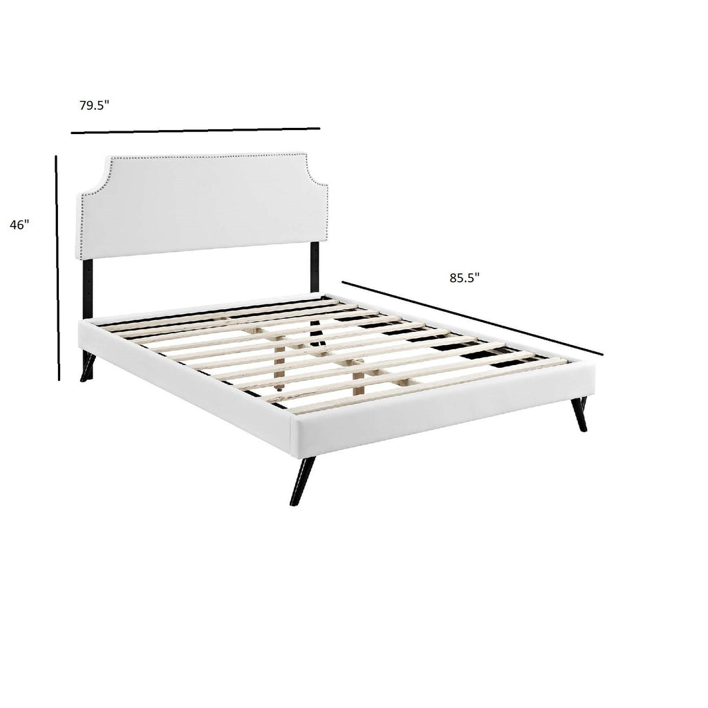 Accelerate your bedroom decor with the Corene Platform Bed. Made with a solid wood frame upholstered in vinyl, Corene features tapered wood legs, plastic foot glides, stylish headboard, and ten sturdy wood slats with a centered supporting bar and two support legs for enhanced stability. Due to the wooden slat support system, the use of a box spring is unnecessary. Corene supports memory foam mattresses such as our Aveline series. Perfect for mid-century modern, eclectic and contemporary bedrooms. Mattress not included. Assembly Required.