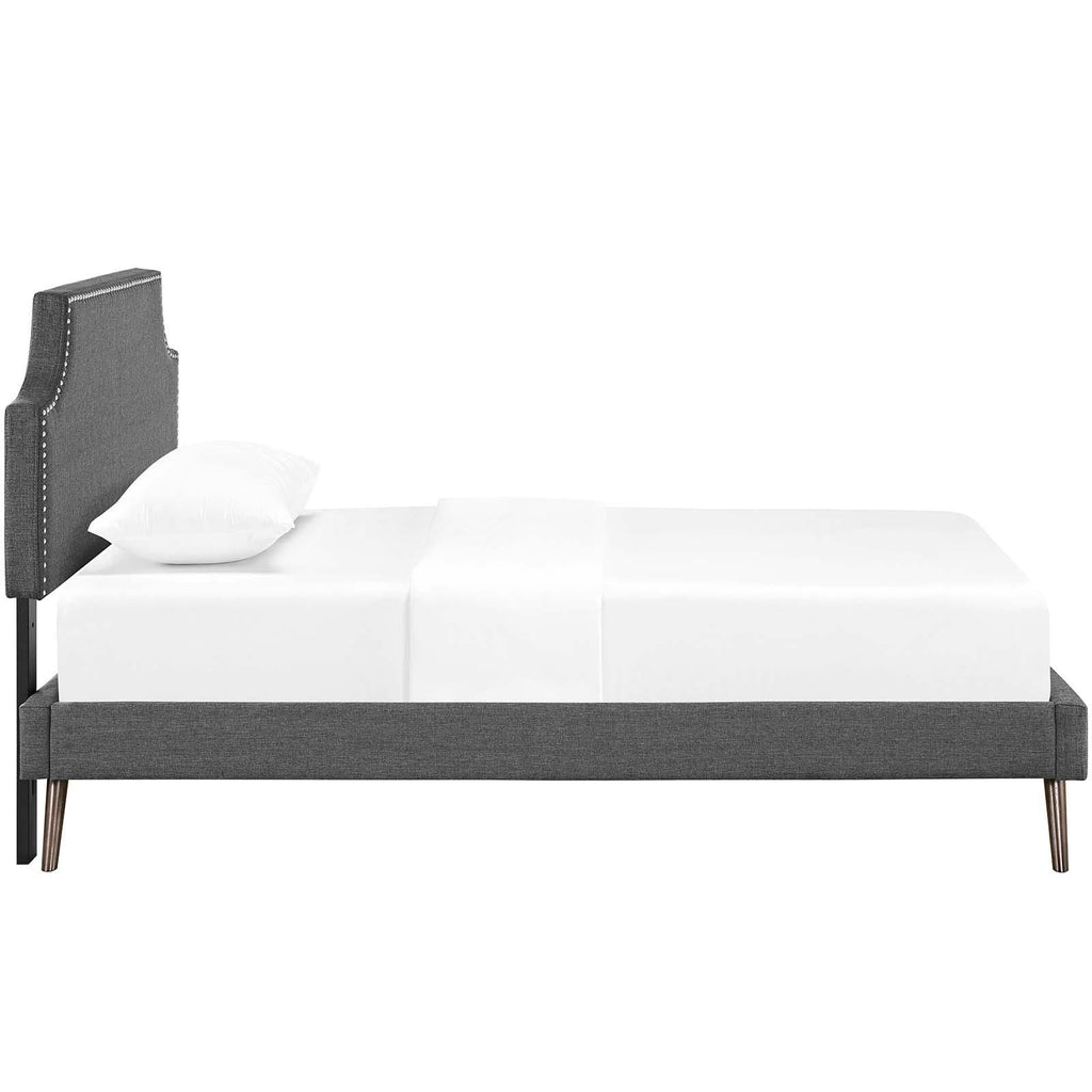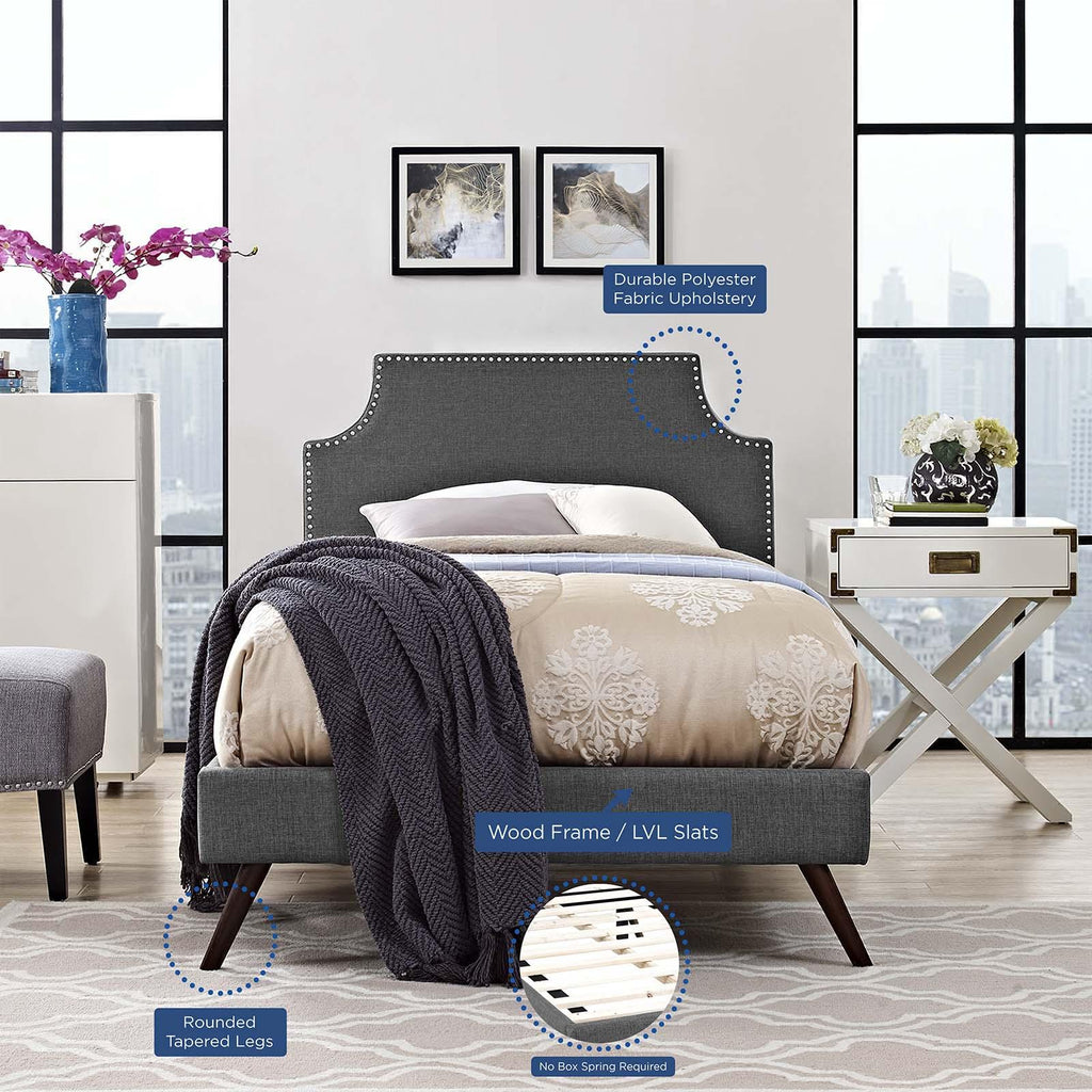 Accelerate your bedroom decor with the Corene Platform Bed. Made with a solid wood frame upholstered in polyester fabric, Corene features tapered wood legs, plastic foot glides, stylish headboard, and ten sturdy wood slats with a centered supporting bar and two support legs for enhanced stability. Due to the wooden slat support system, the use of a box spring is unnecessary. Corene supports memory foam mattresses such as our Aveline series. Perfect for mid-century modern, minimalist and contemporary bedrooms. Mattress not included. Assembly Required.