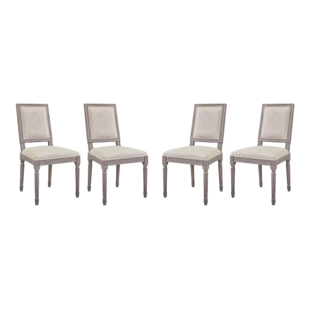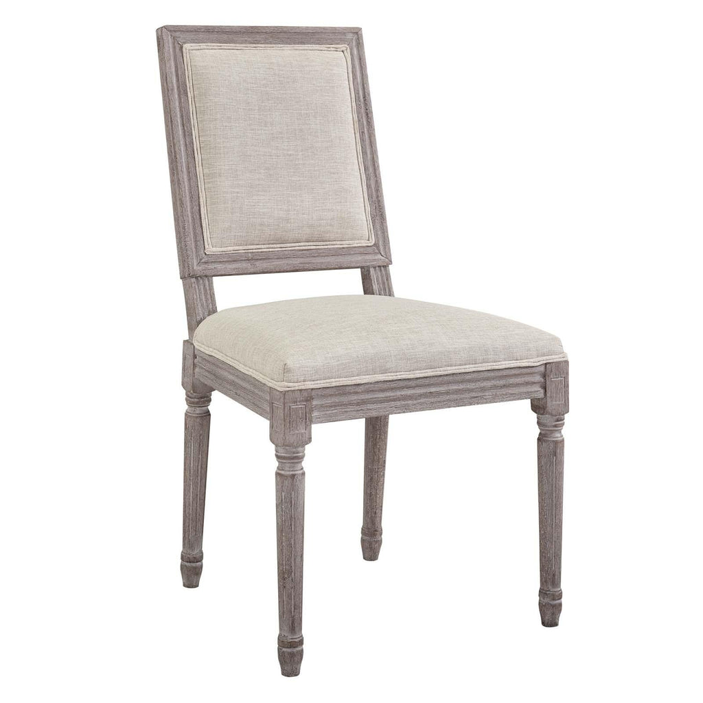 Revel in the whispered opulence of the Court Dining Side Chair. Featuring a fluted wood frame, dense foam upholstered fabric seat with elegant welting, this square back dining or accent chair harmoniously blends old world charm with modern intrigue. Designed with a weathered vintage French look and an undeniable appeal, Court supports up to 331 pounds and comes with foot pads to preserve flooring. Comes fully assembled.