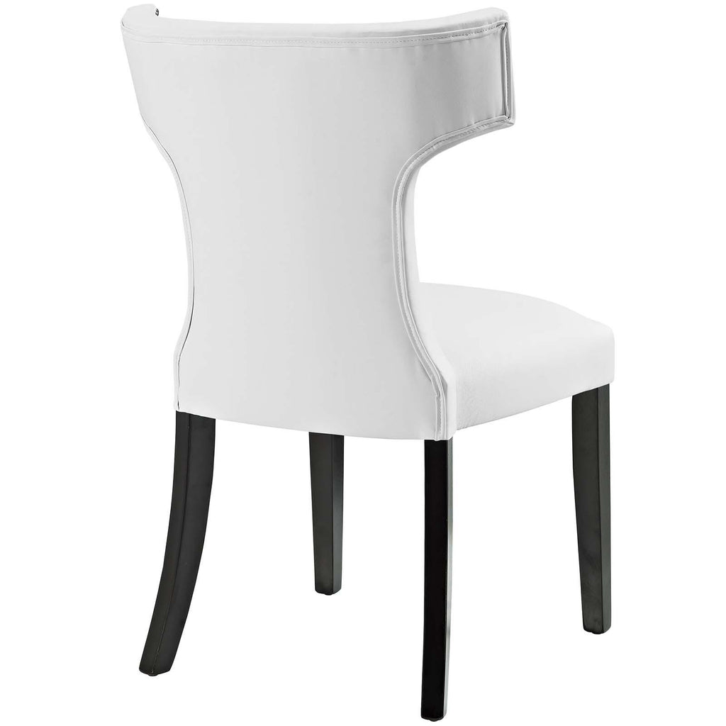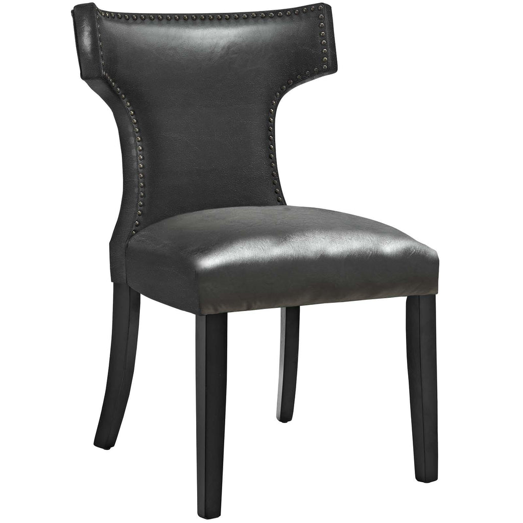 Transform your dining d�cor with the broadly designed Curve Dining Side Chair. Sweeping lines complement a minimalist shape for a chic look studded with nailhead trim. Curve comes generously padded with dense foam covered in vinyl, non-marking foot caps, and delivers just the right touch of finesse with tapered wood legs. Sporting an hourglass shape, Curve works well in a variety of dining room arrangements.