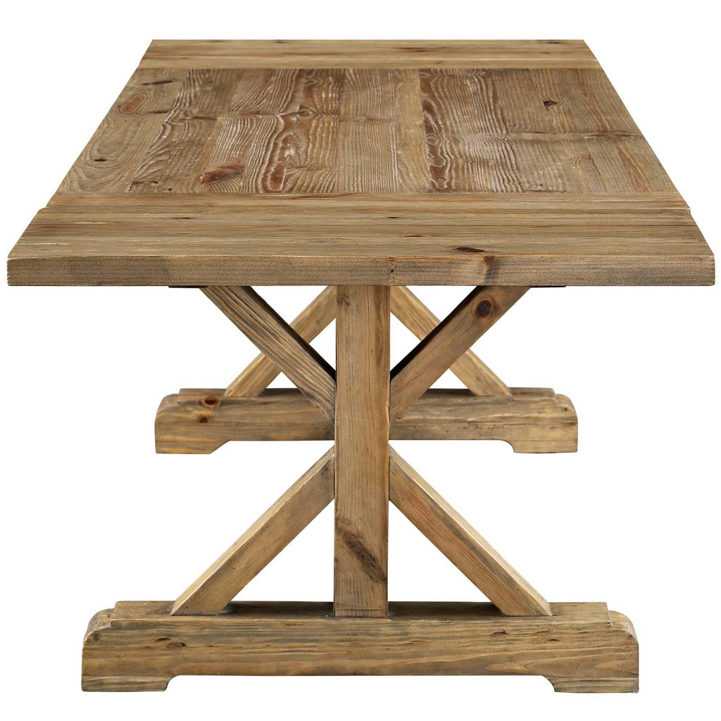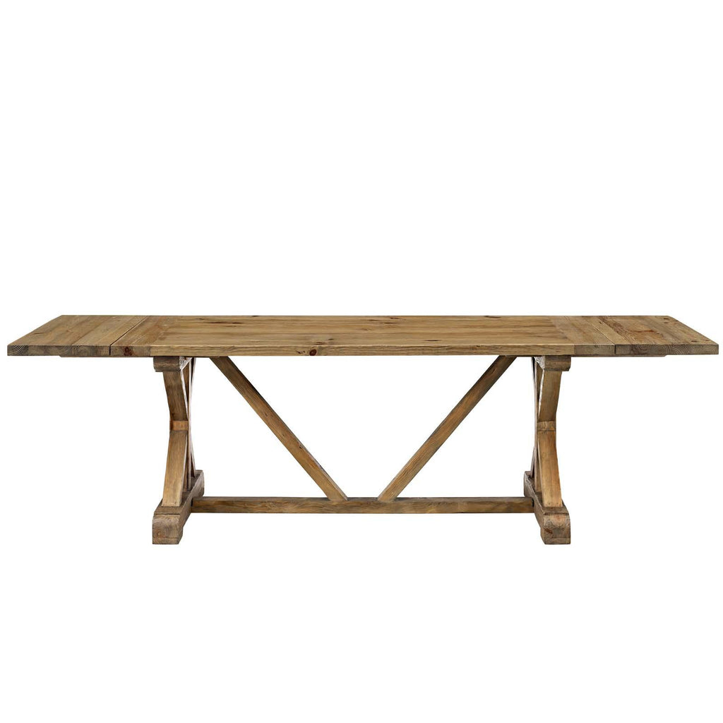 Celebrate a bountiful harvest with the Den Extendable Wood Dining Table. Adorn your table with the finest game and freshly baked delicacies with this clear lacquered solid pine wood dining table with removable end leaves. Complete with seating for ten when leaves are attached (six when not), Den is smooth to the touch with an X-base, stretcher, and extra support beams. Host most magnificent meals with a rustic farmhouse dining table fit for a duke and duchess.